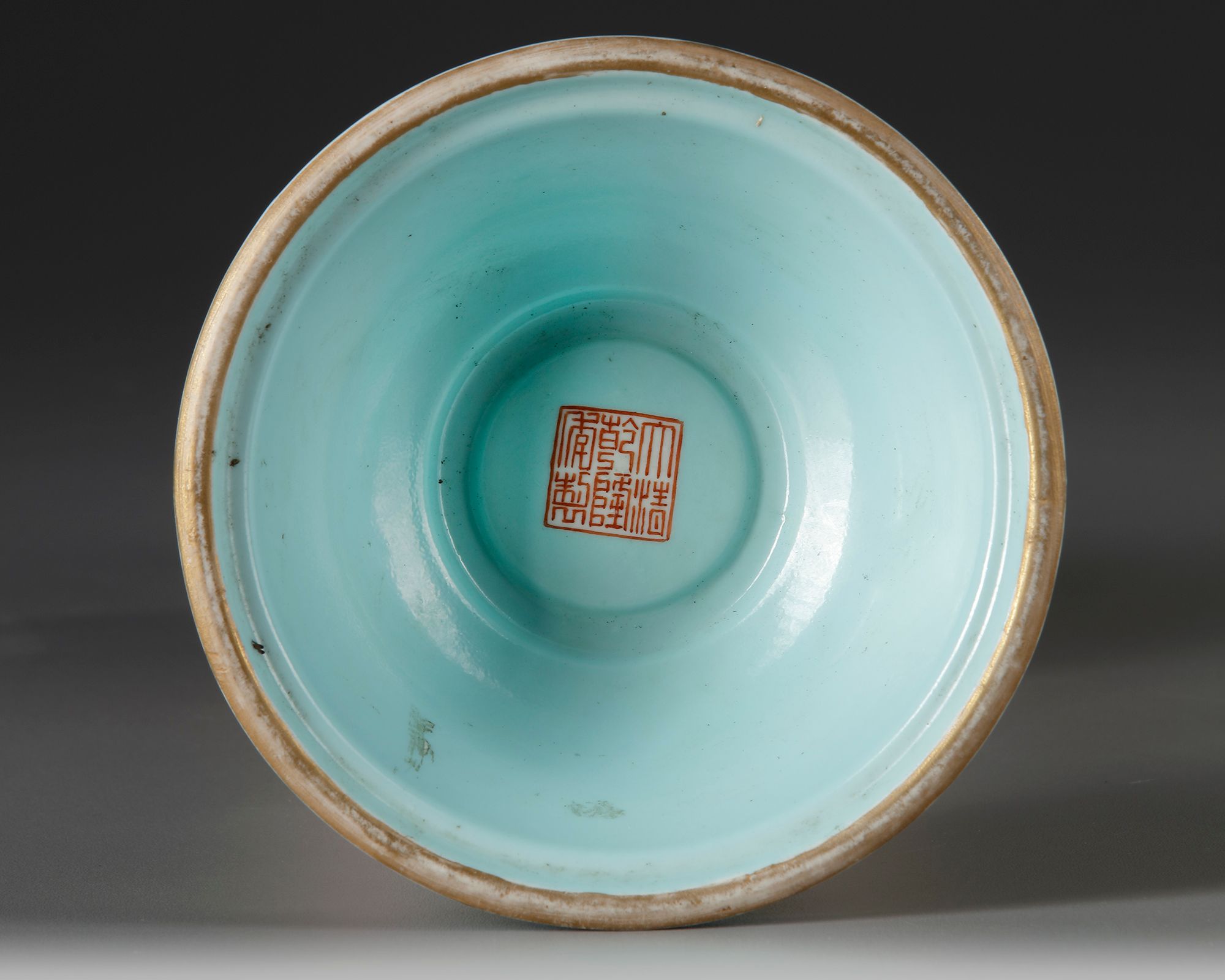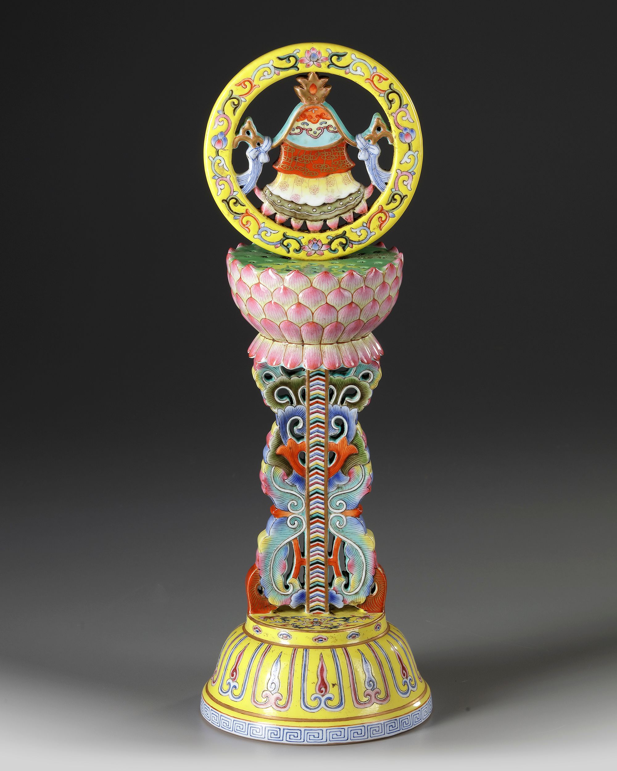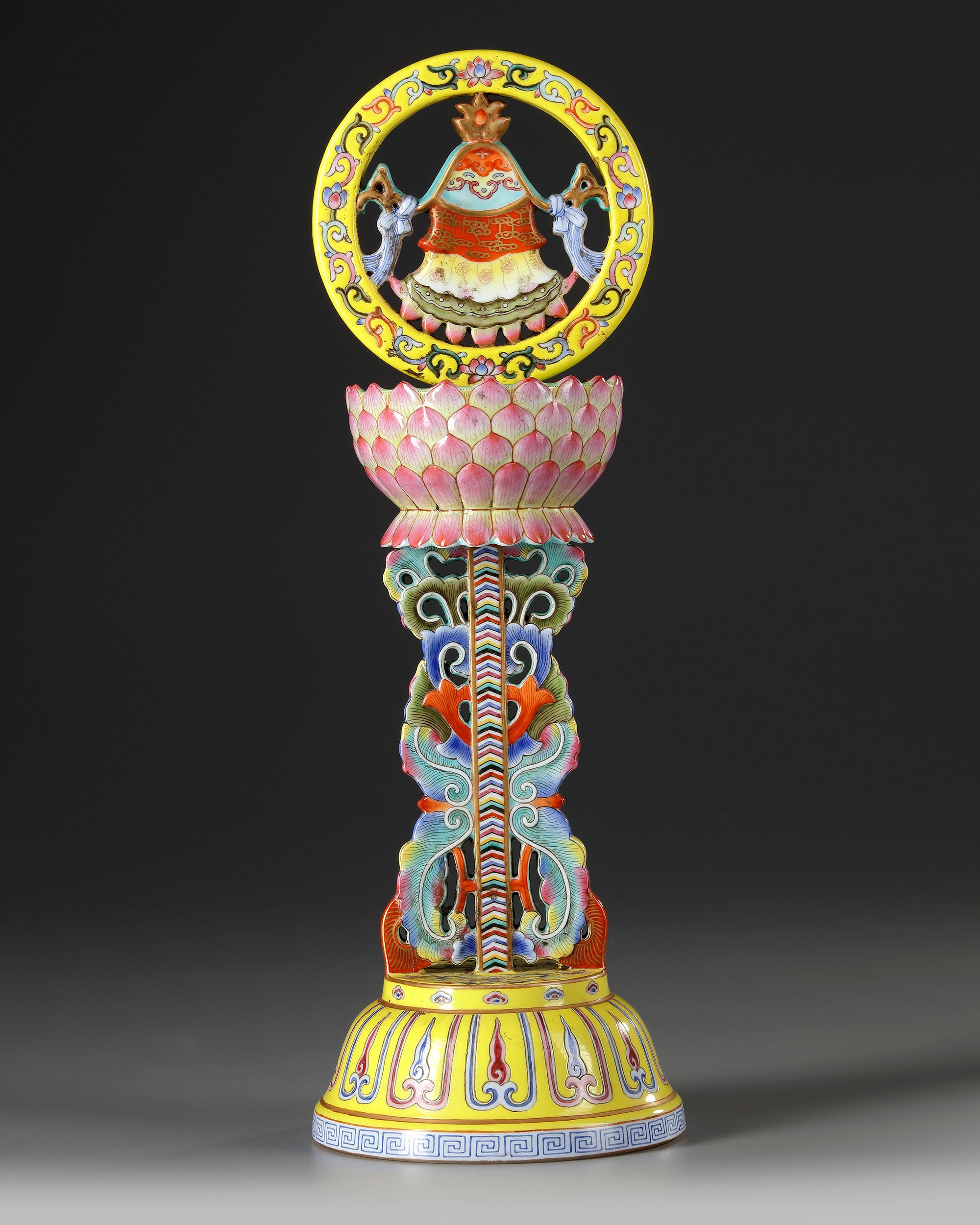 The ornament is decorated with a circular openwork medallion enclosing one of the Eight Buddhist Emblems (The Parasol), all sitting atop a lotus pod. The upper section is raised on a slender stem flanked by openwork curling leaves, all on a base decorated with lappets. The turquoise base with an apocryphal Qianlong mark.