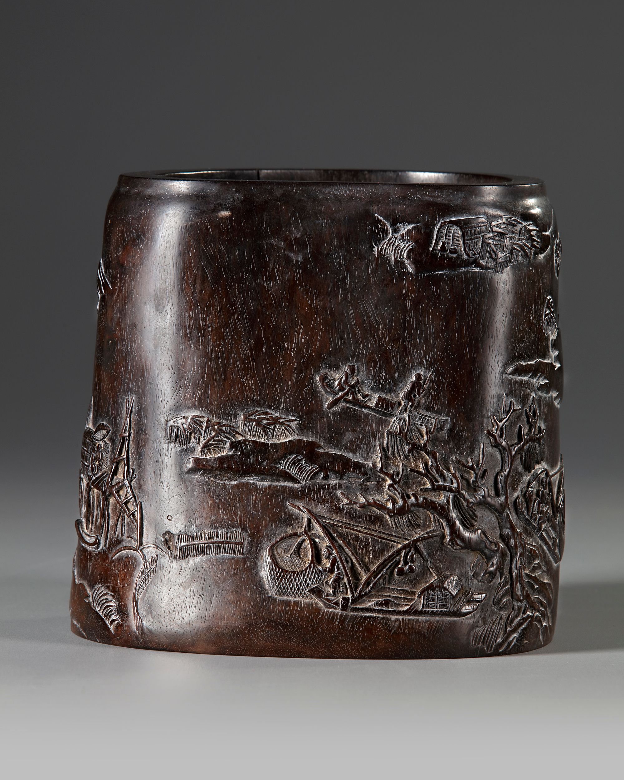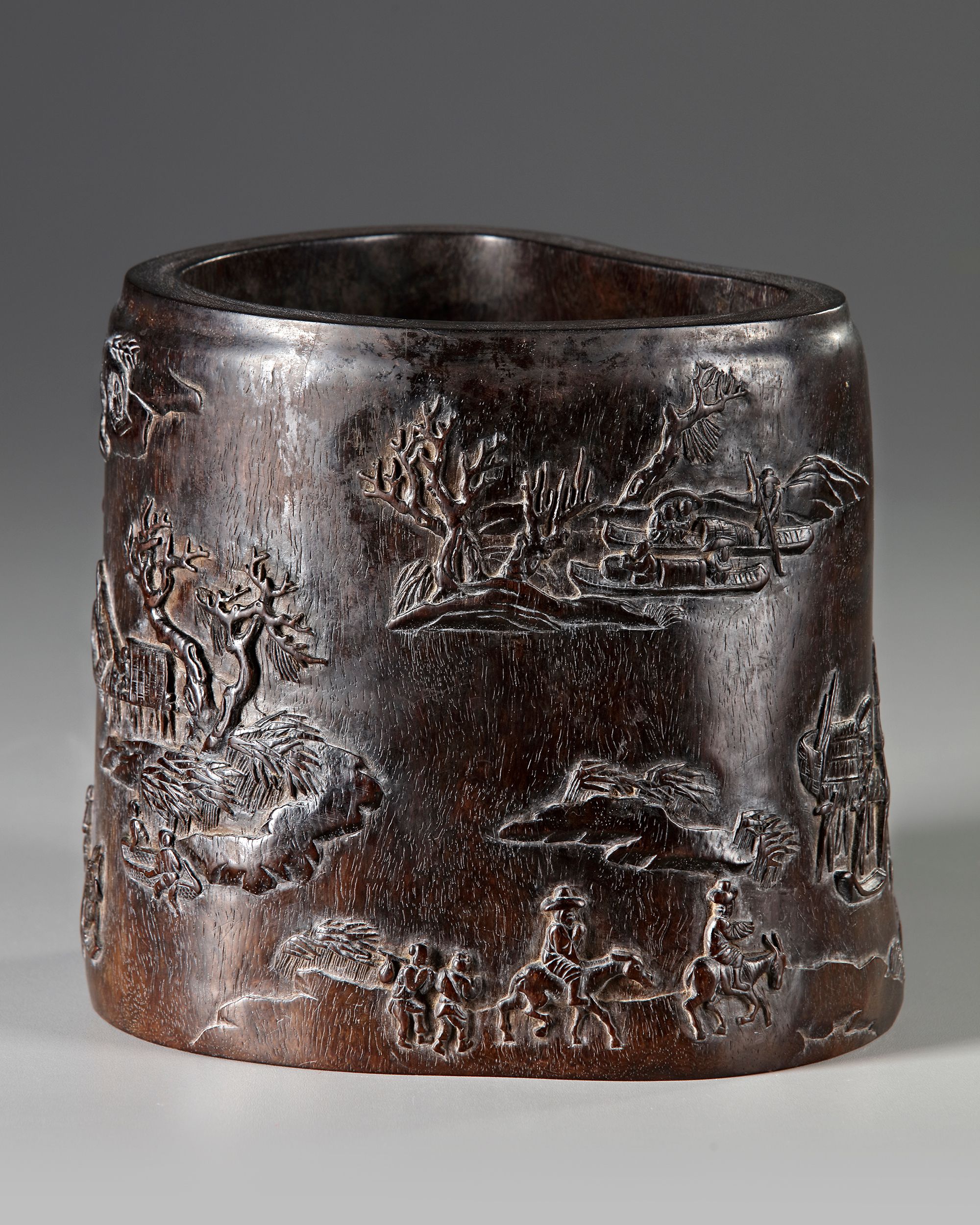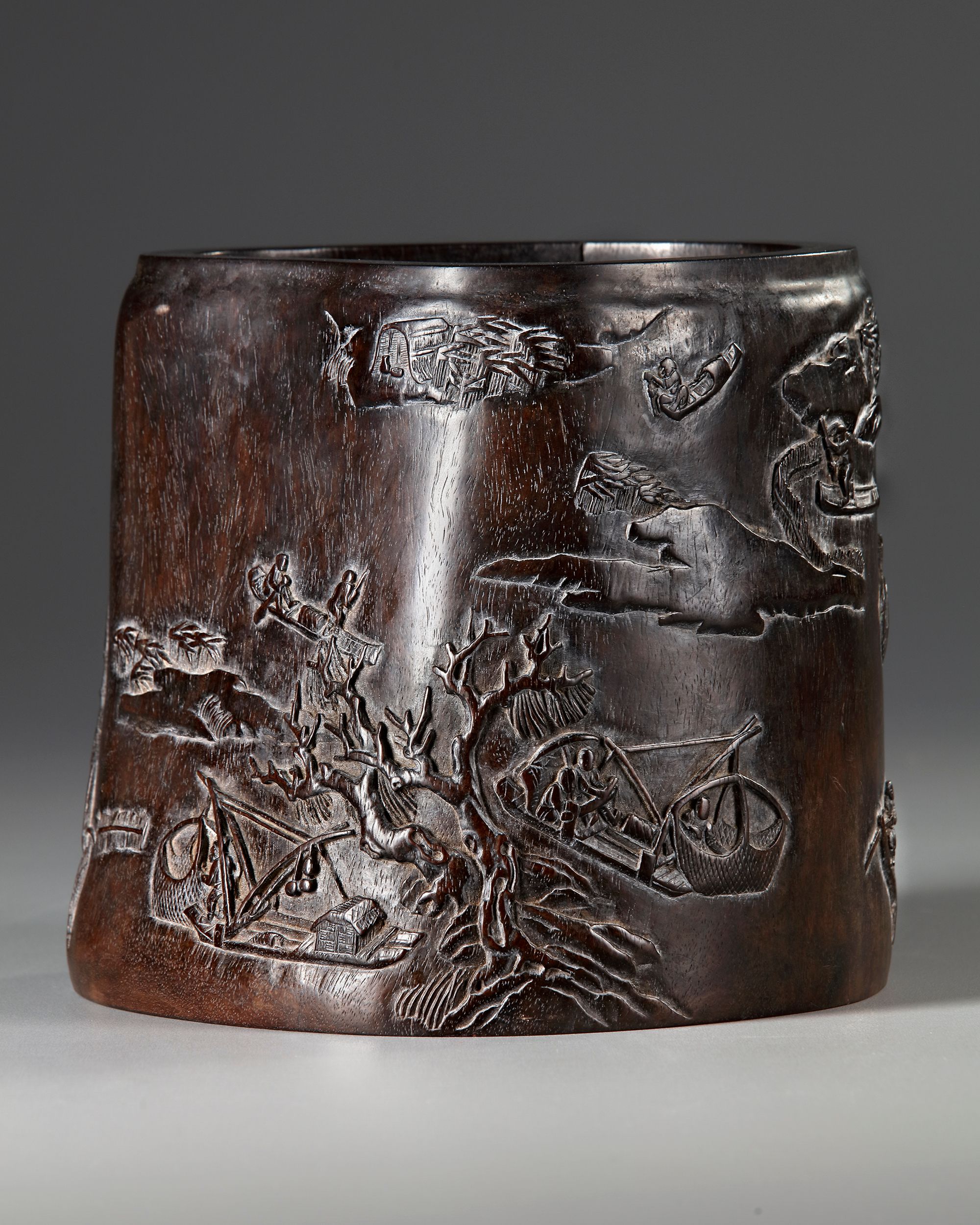 The brush pot is densely carved around the exterior with a continuous mountainous lake landscape detailed with fishermen sailing their sampans, scholars crossing over with their donkeys, with islands and mountains in the distance.