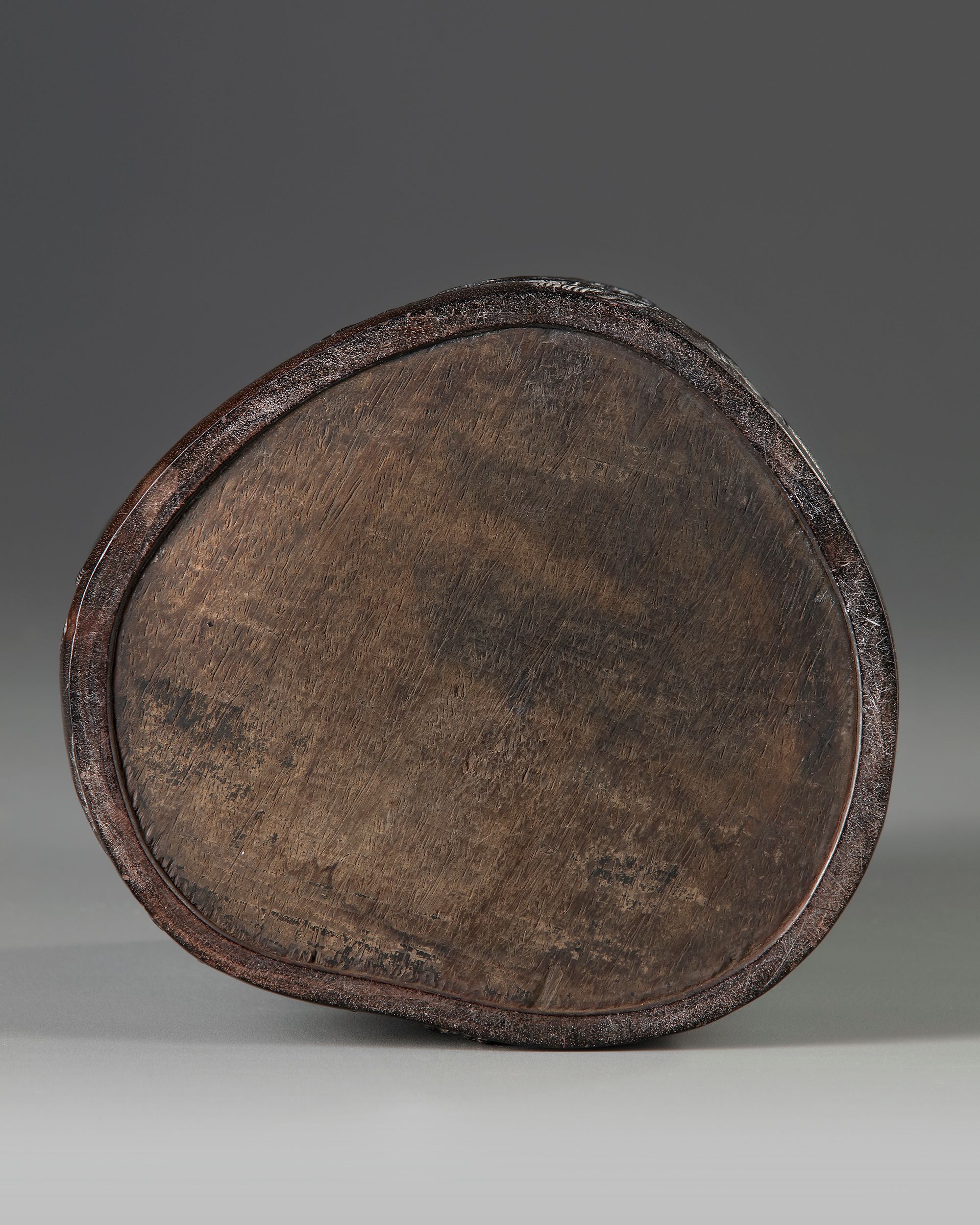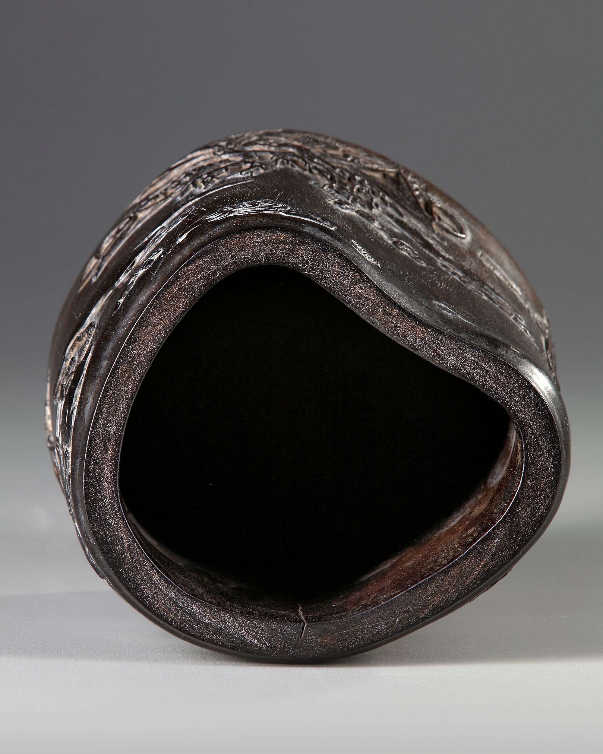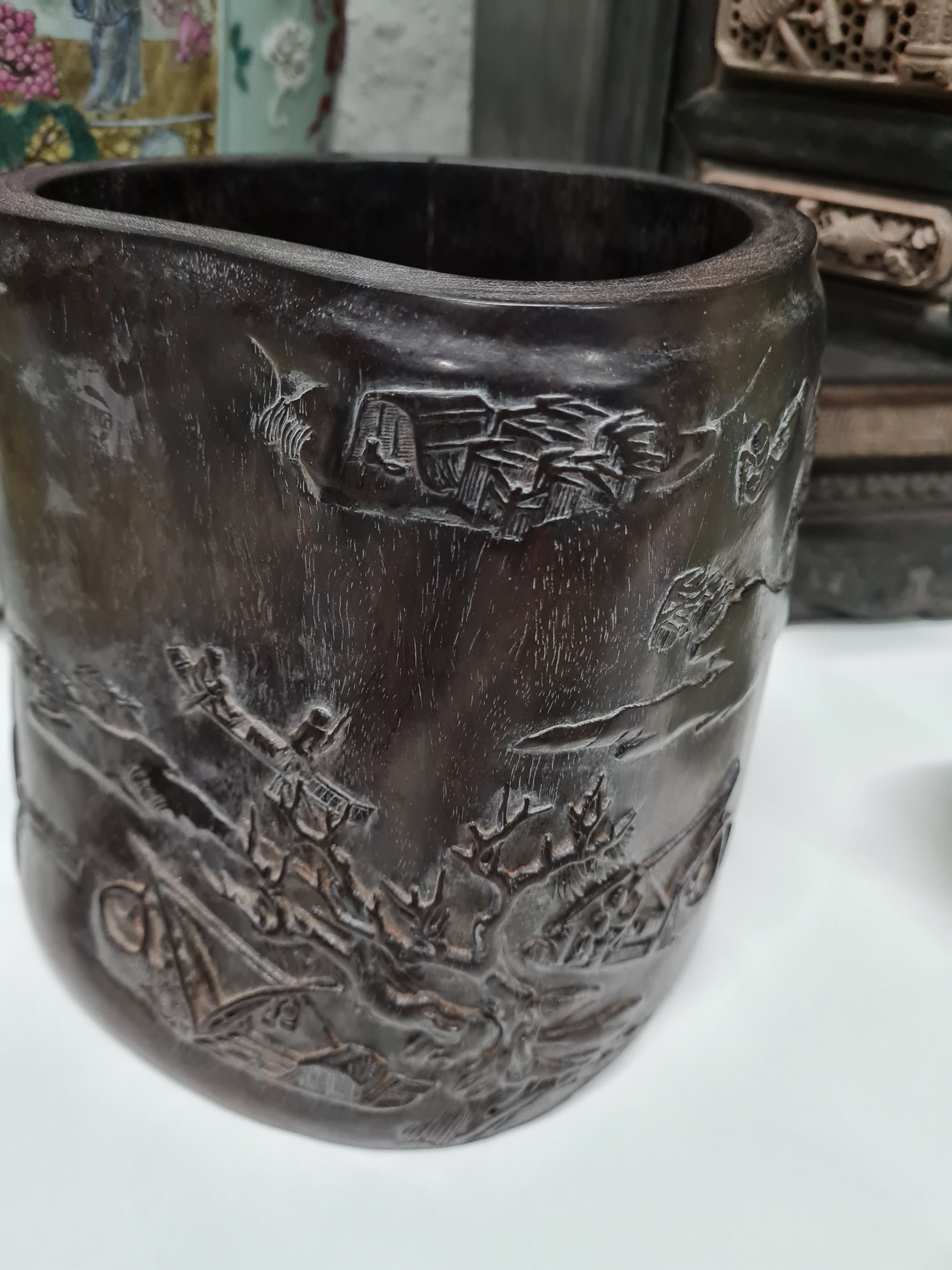The brush pot is densely carved around the exterior with a continuous mountainous lake landscape detailed with fishermen sailing their sampans, scholars crossing over with their donkeys, with islands and mountains in the distance.