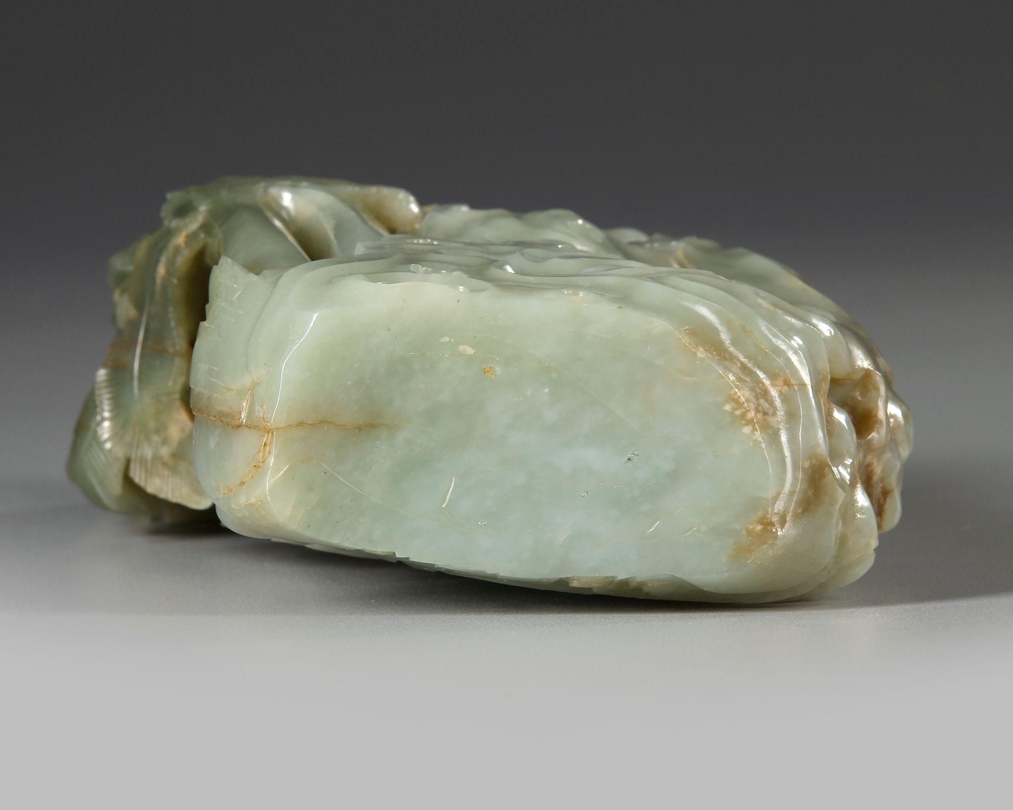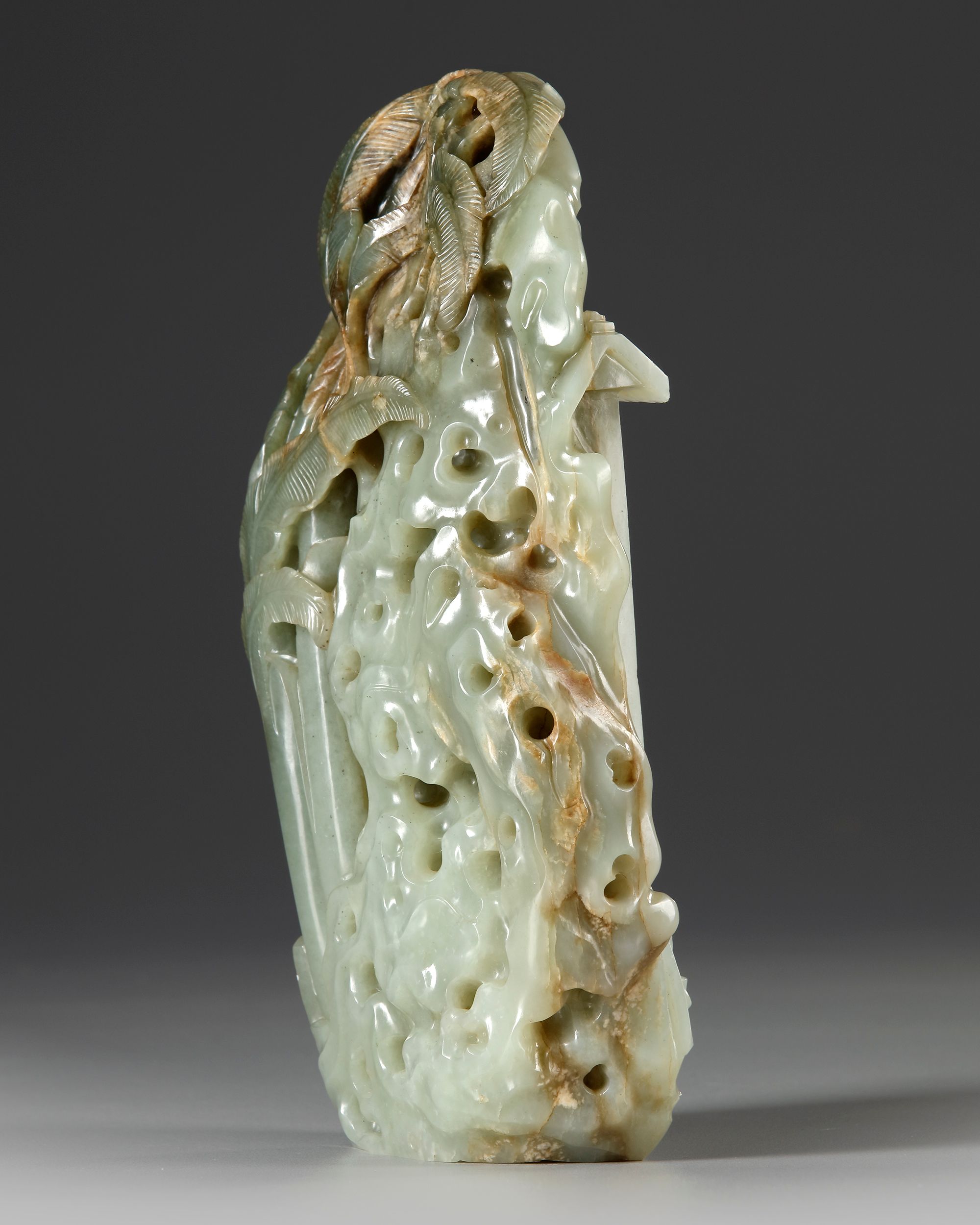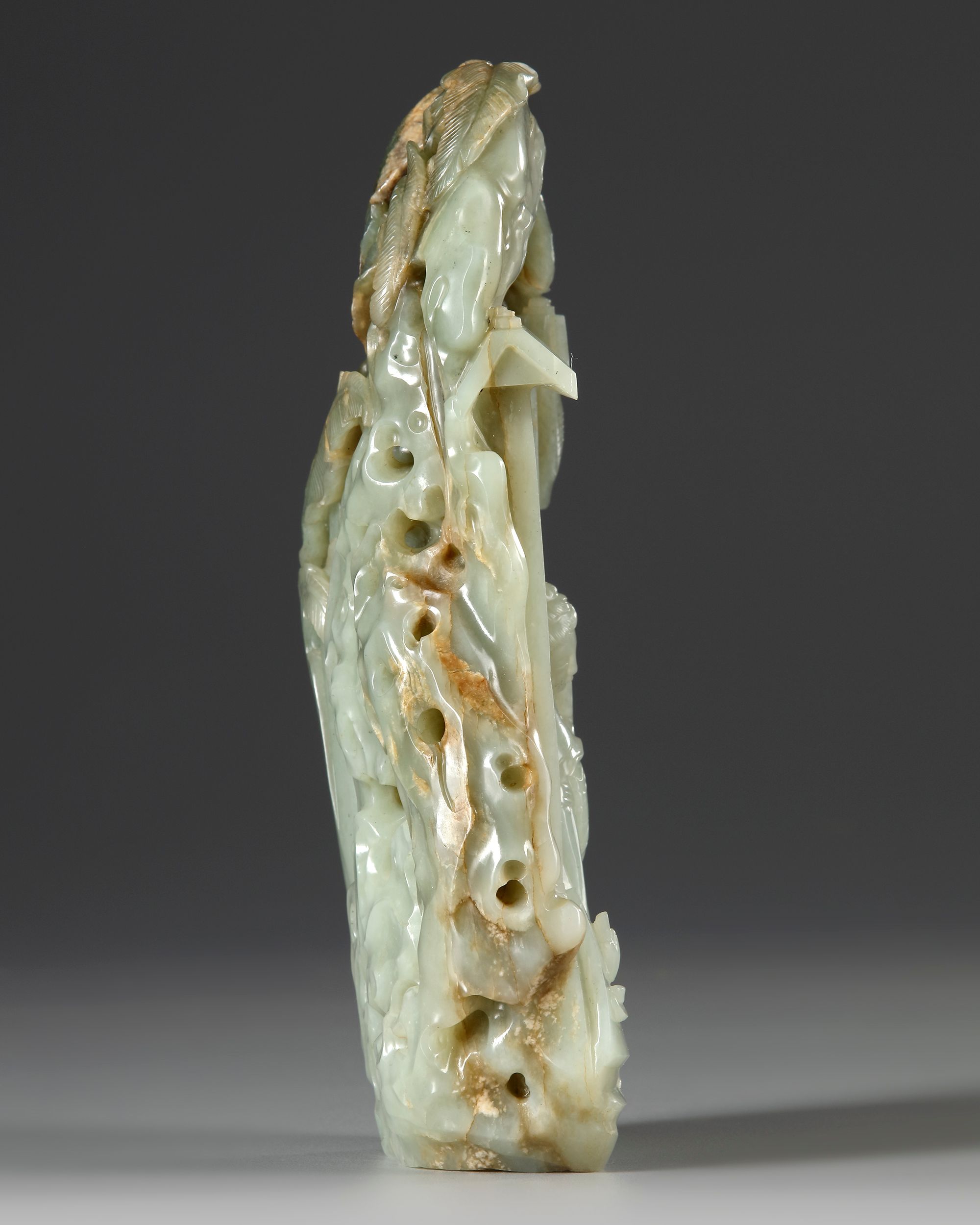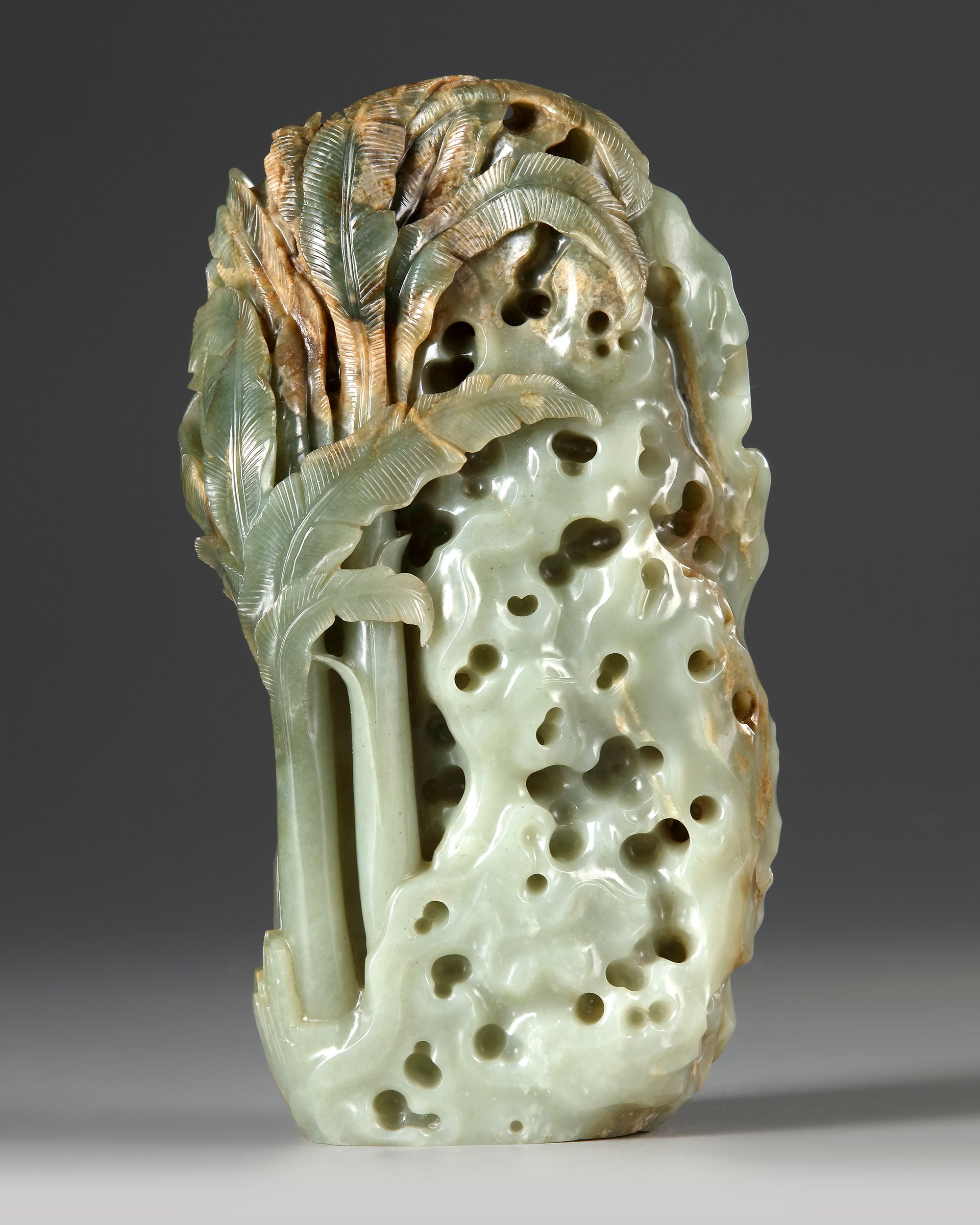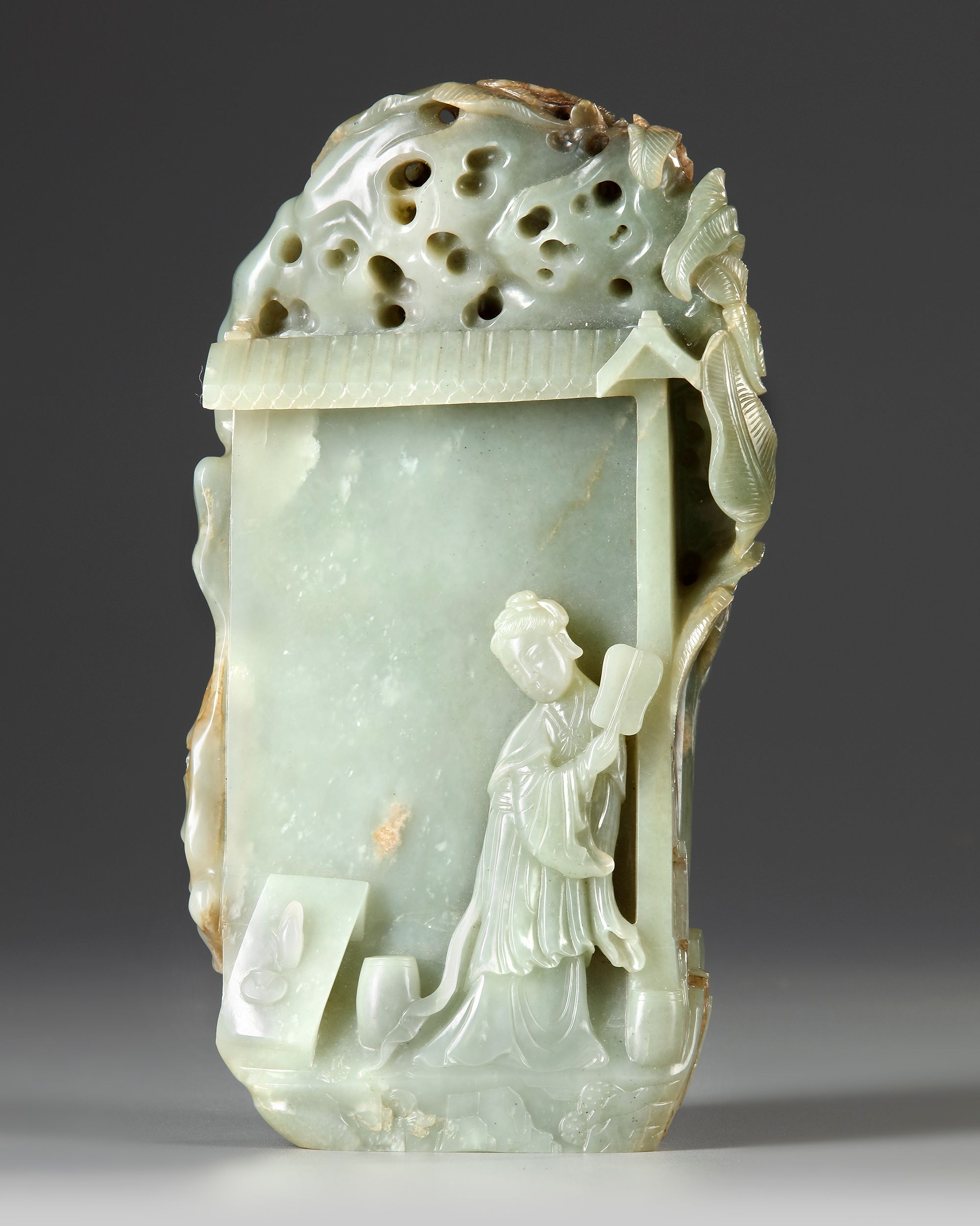 Crisply carved to one side with an elegant lady "Long Eliza" holding a fan in her hands, wearing long robes beside table in a house, the other side with overhanging gnarled banana tree.