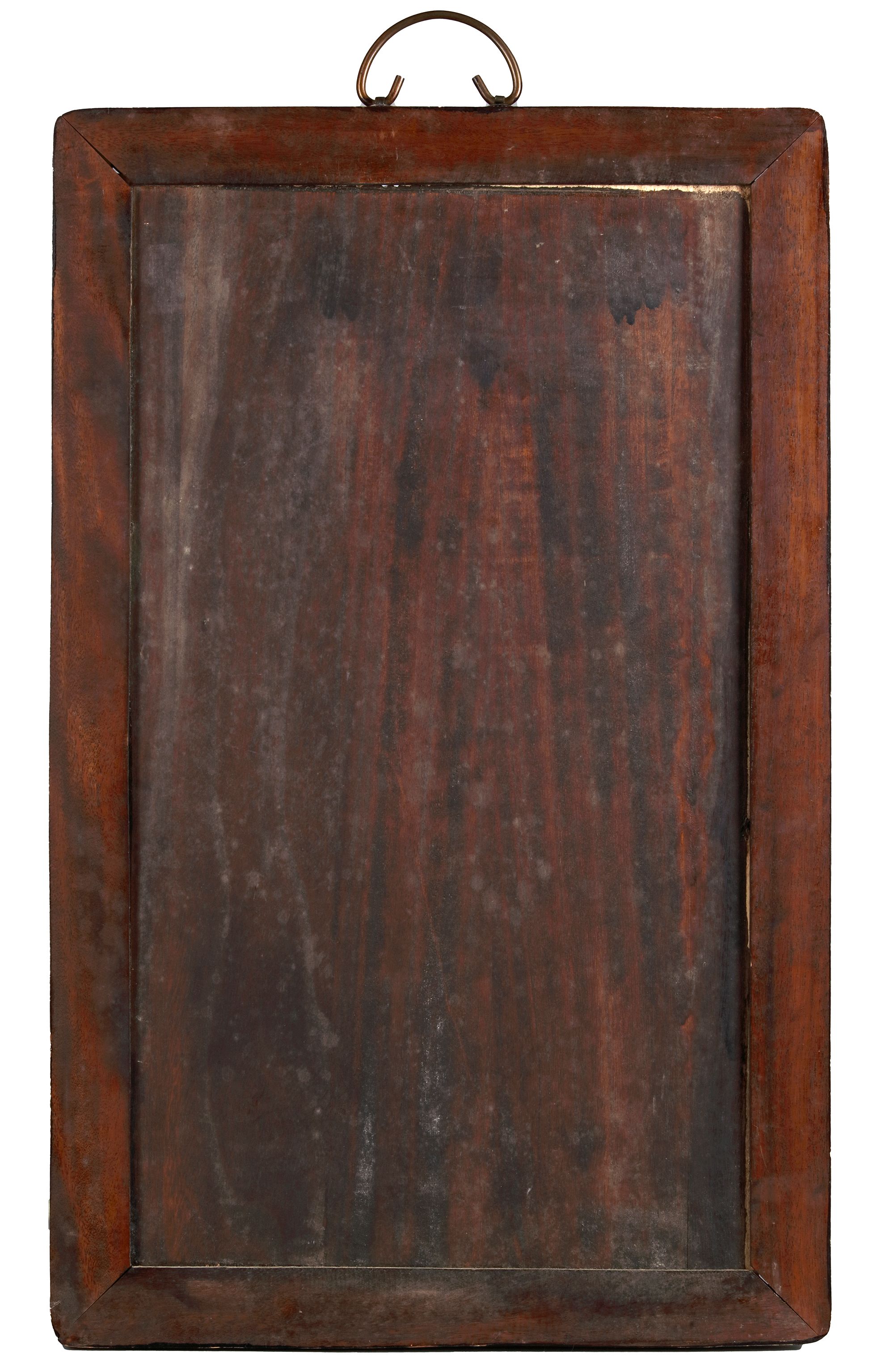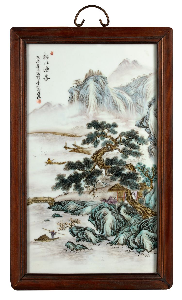 The plaque is decorated with a riverside scene amongst high towering mountains. In a wood frame. 54 by 20 cm.