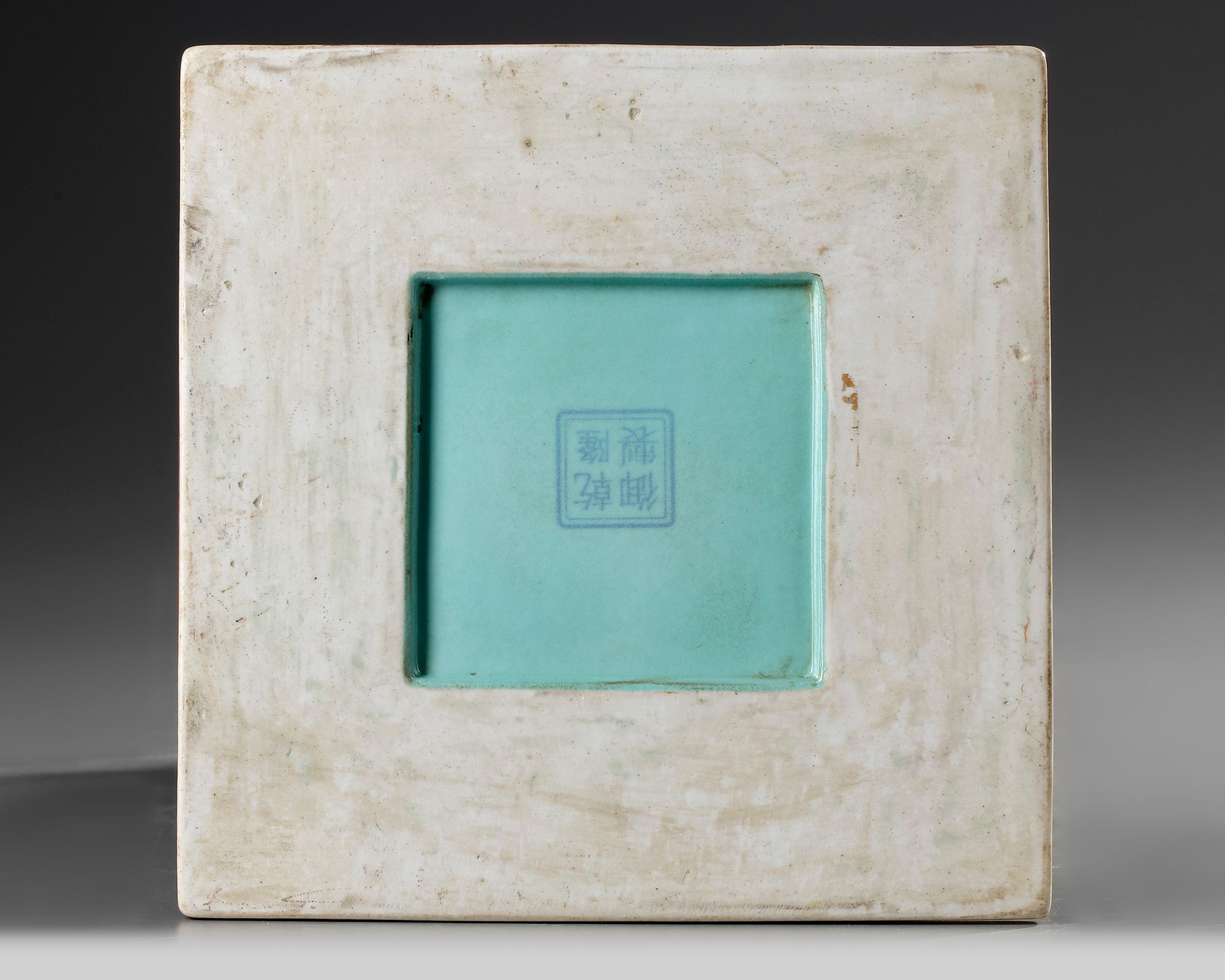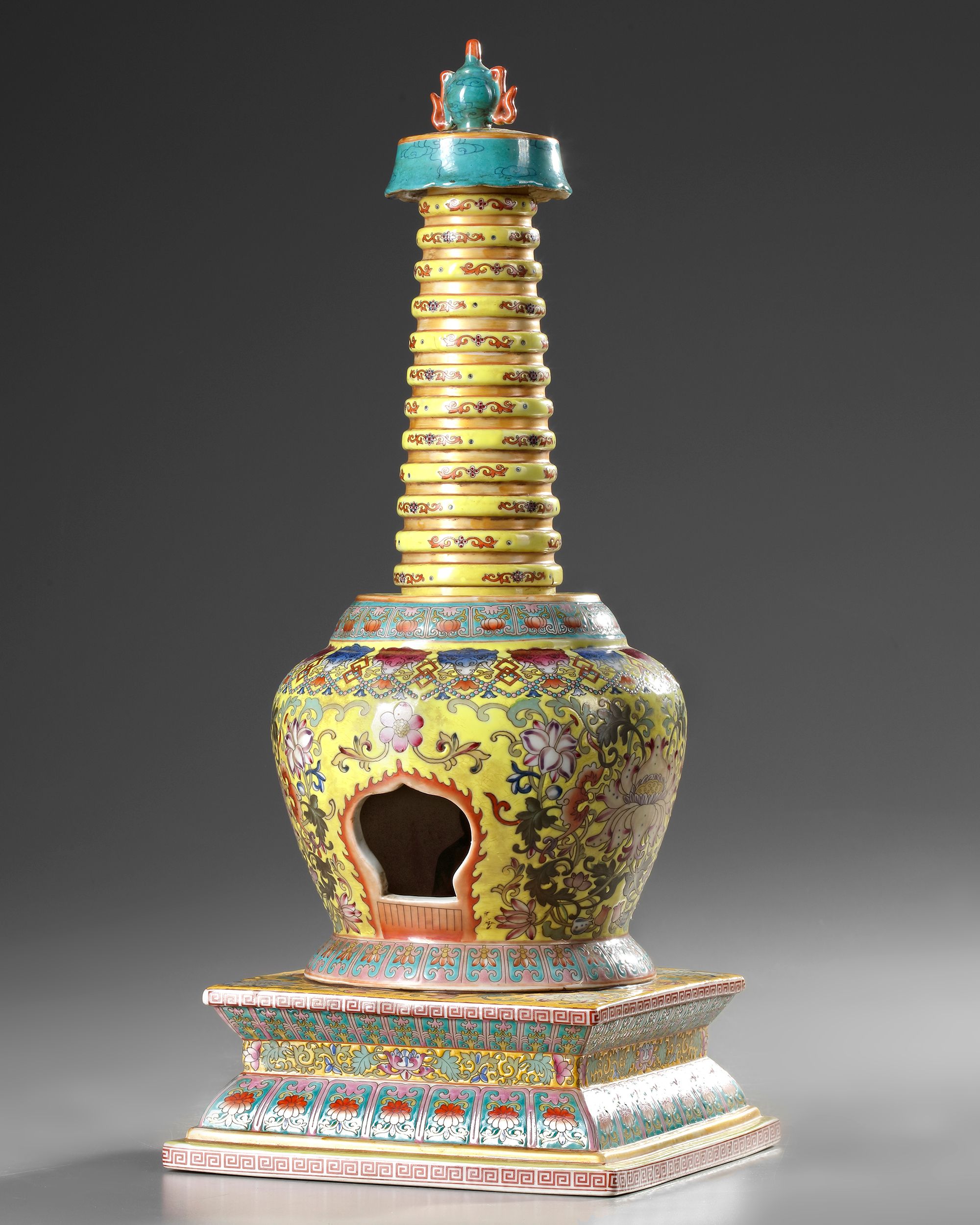 The tower is decorated to the body with a band of lion masks above densely scrolling lotus. The domed vessel opens to reveal a gilt Buddha with hands in prayer and seated in dhyanasana. The column is divided into twelve registers of lotus scrolls supporting a parasol surmounted by a beribboned double gourd. The square stand is enameled turquoise and decorated with further flower scrolls. The turquoise-glazed base bears a four-character Qianlong mark.