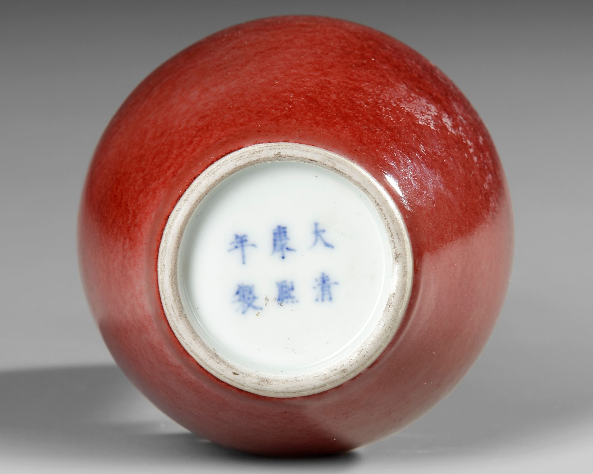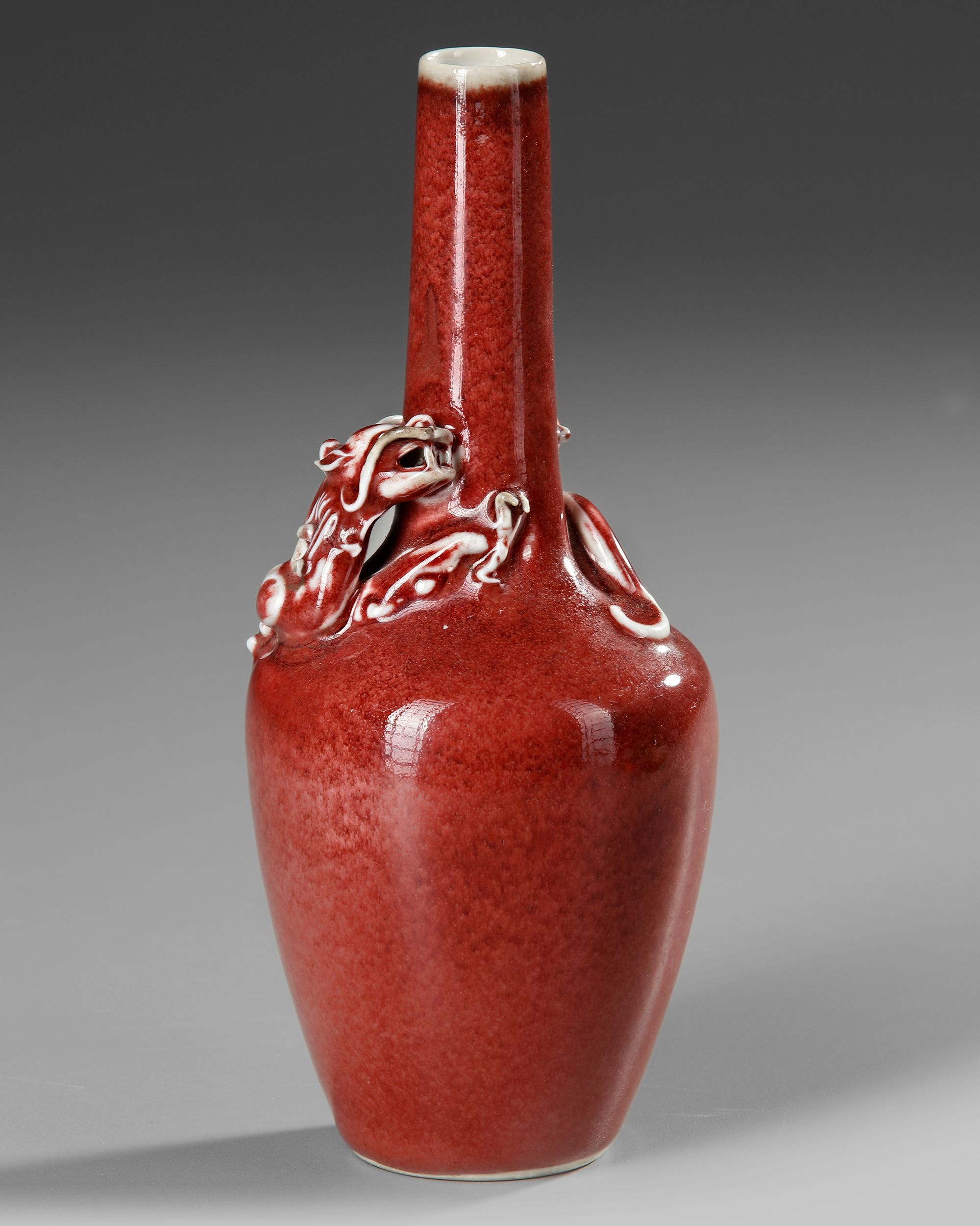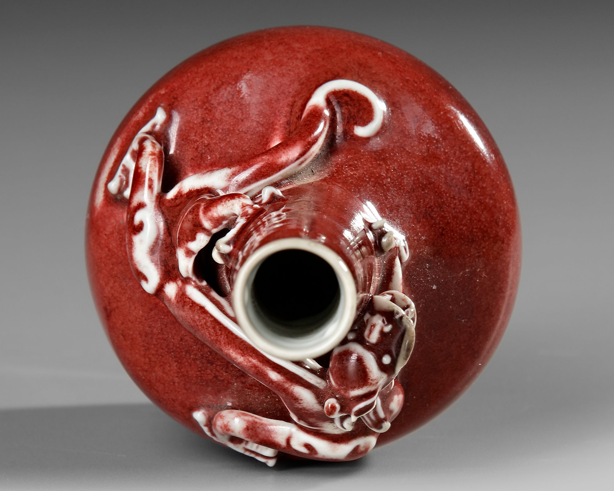 A Chinese porcelain vase moulded with a three-clawed dragon in high relief around the shoulder, covered with a red glaze. The bottom with a Chinese Kangxi six character mark.