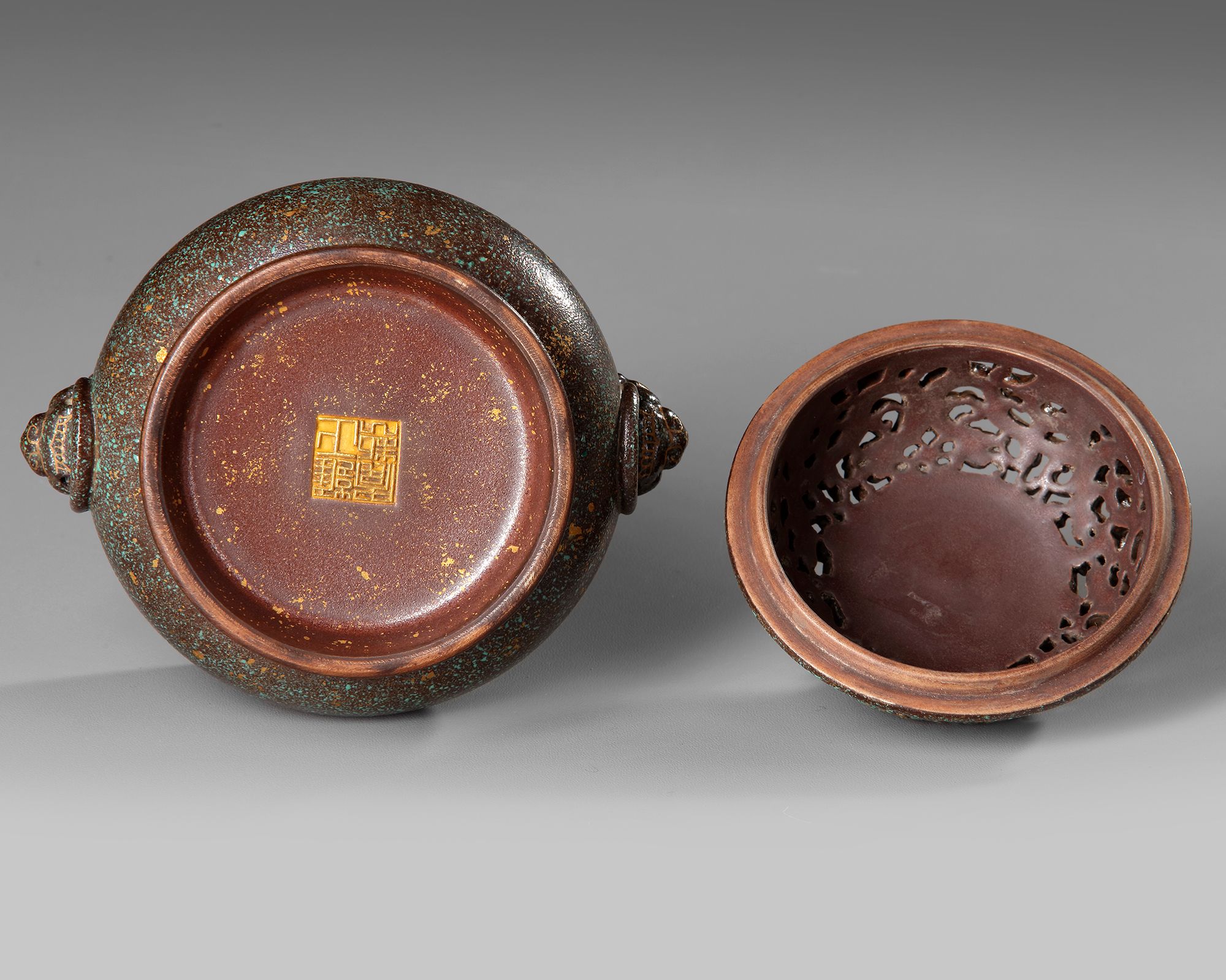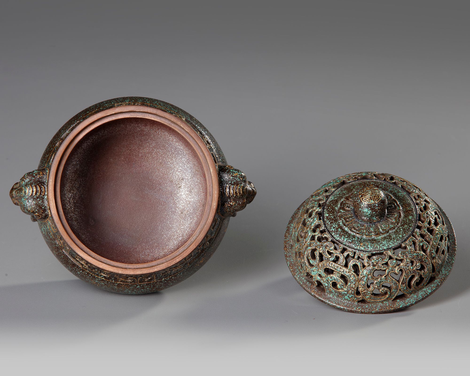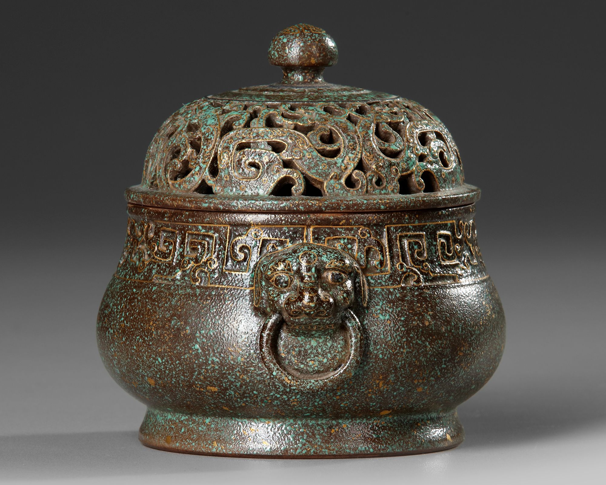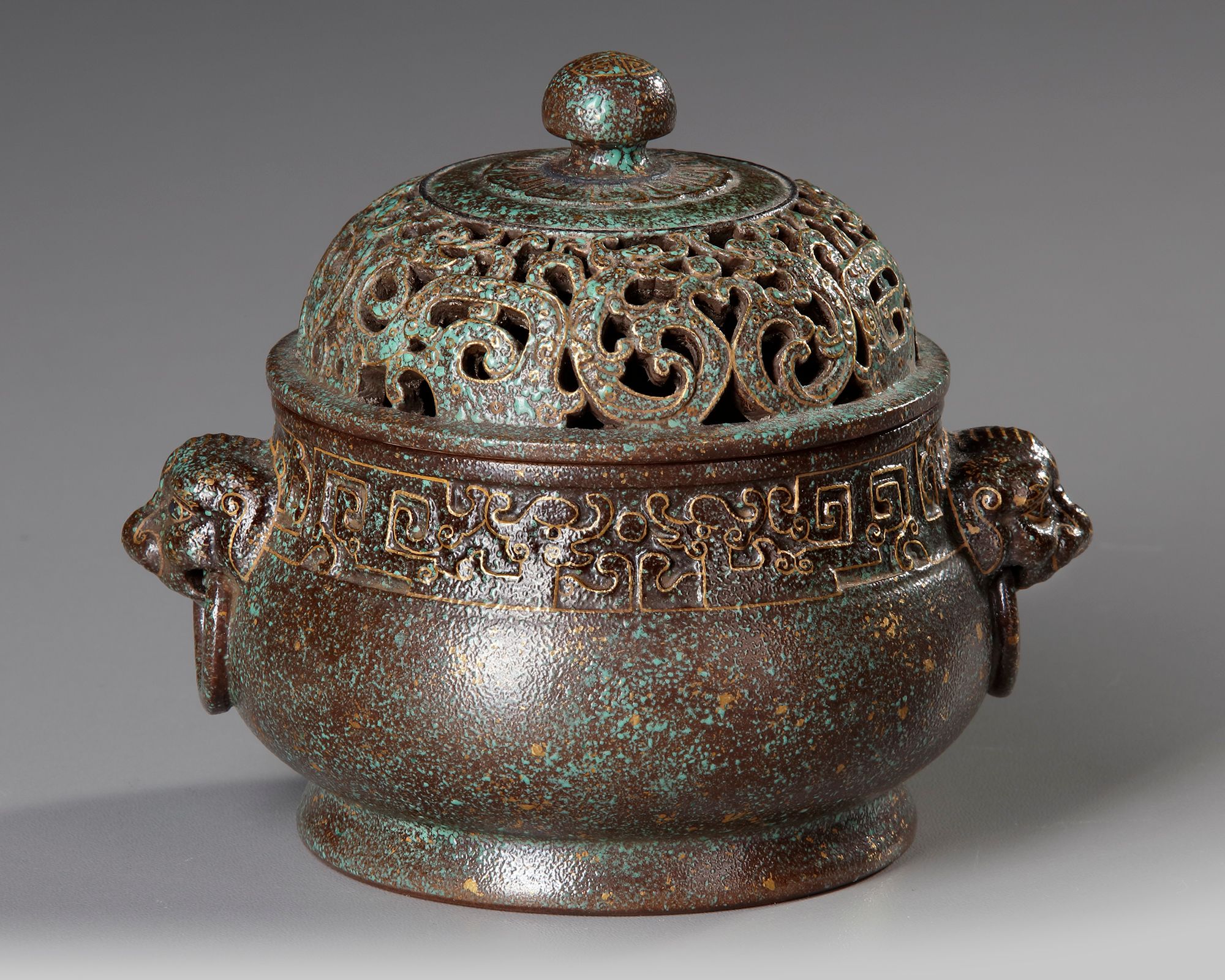 Of compressed form with spreading foot and moulded with two lion mask handles, cast around the rim with an archaic band, a pierced cover with domed finial. The bottom with a Chinese Yongzheng seal mark.