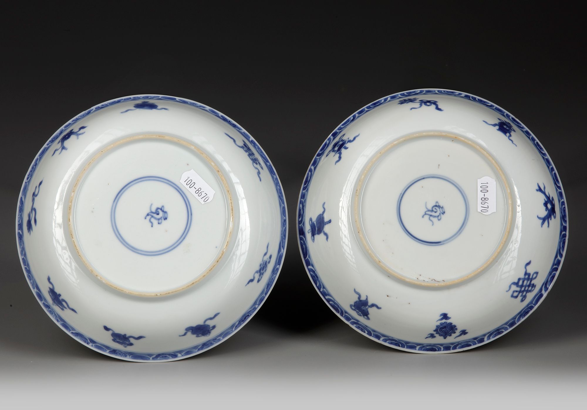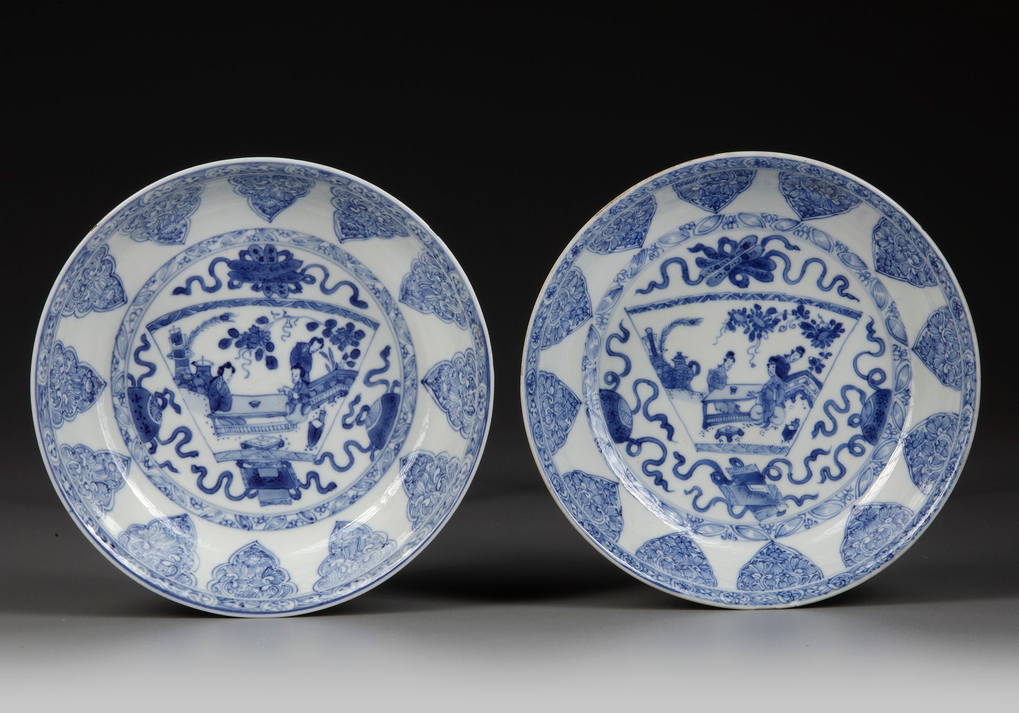 Each dish is decorated to the center with a fan-shaped panel containing ladies seated on a terrace, the panel surrounded by beribboned precious objects. The rim is decorated in pencil style with a lappet band. The reverse is decorated with the Eight Buddhist Emblems, bajixiang. Each with a conch shell mark to the base.