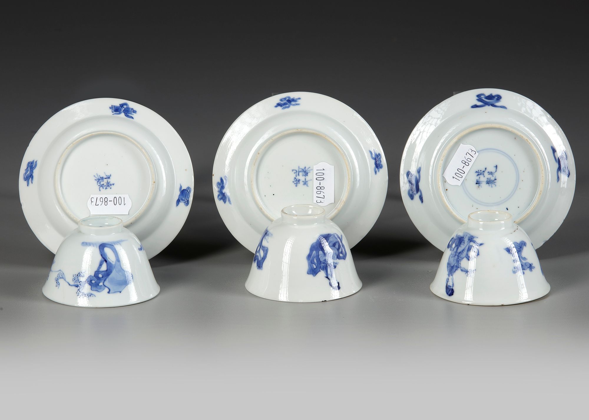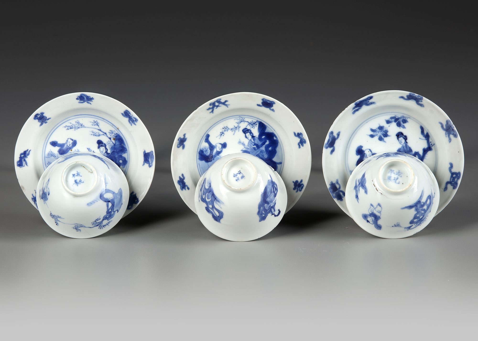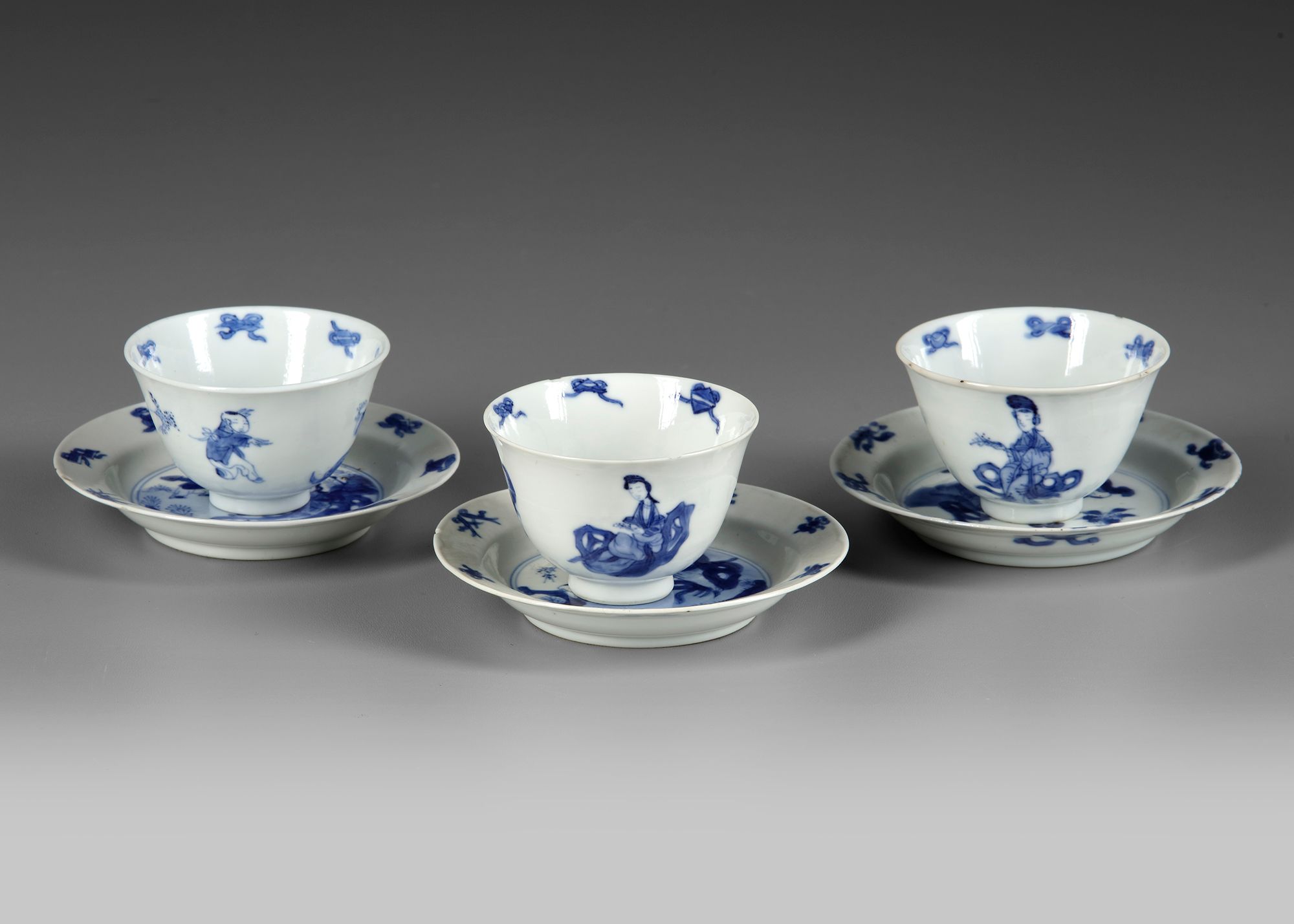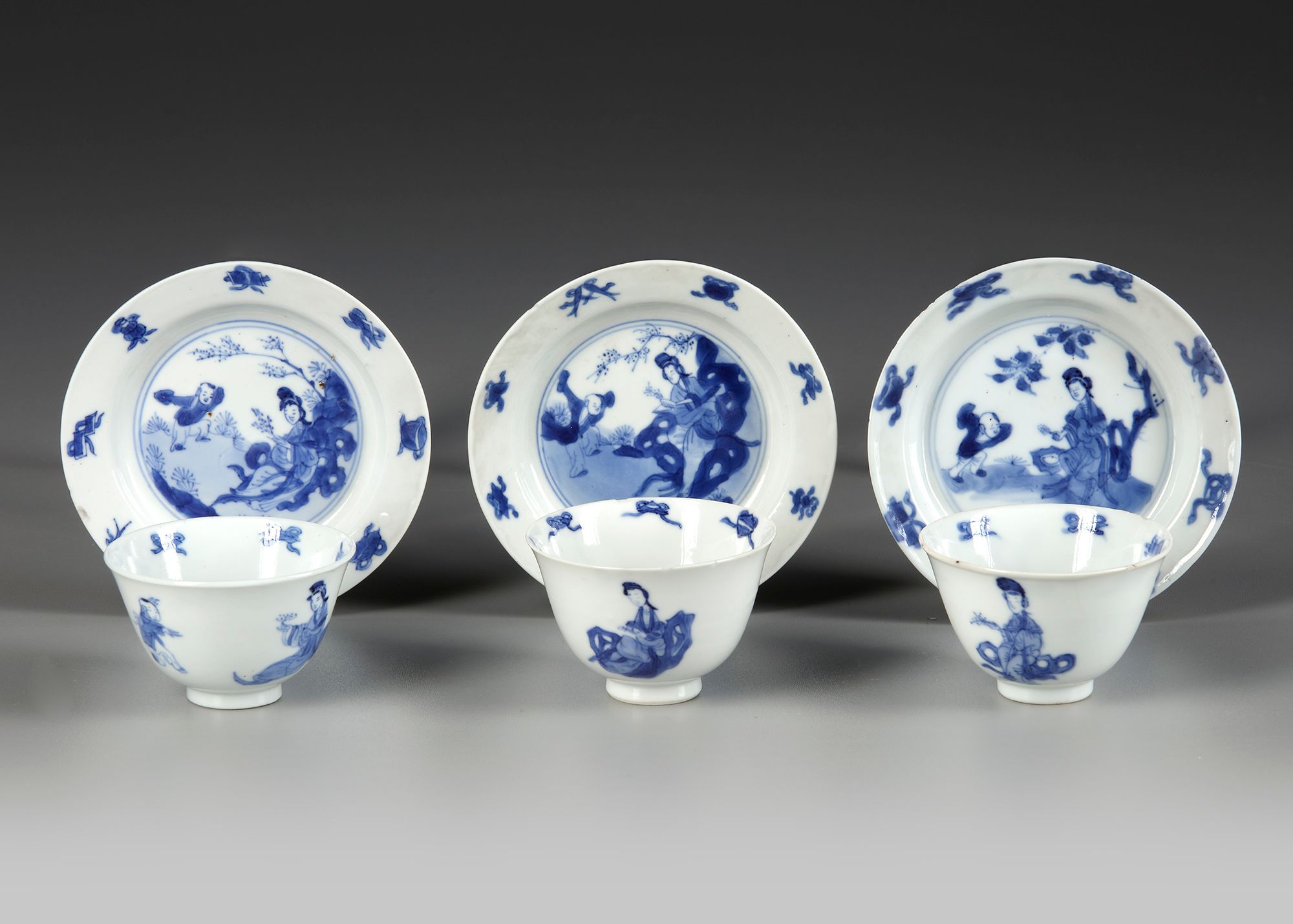 Three Chinese porcelain cups and saucers, each decorated with an elegant lady with a kid in landscape, the sides with the Eight Buddhist Emblems. The bottom with a Chinese Chenghua four character mark.