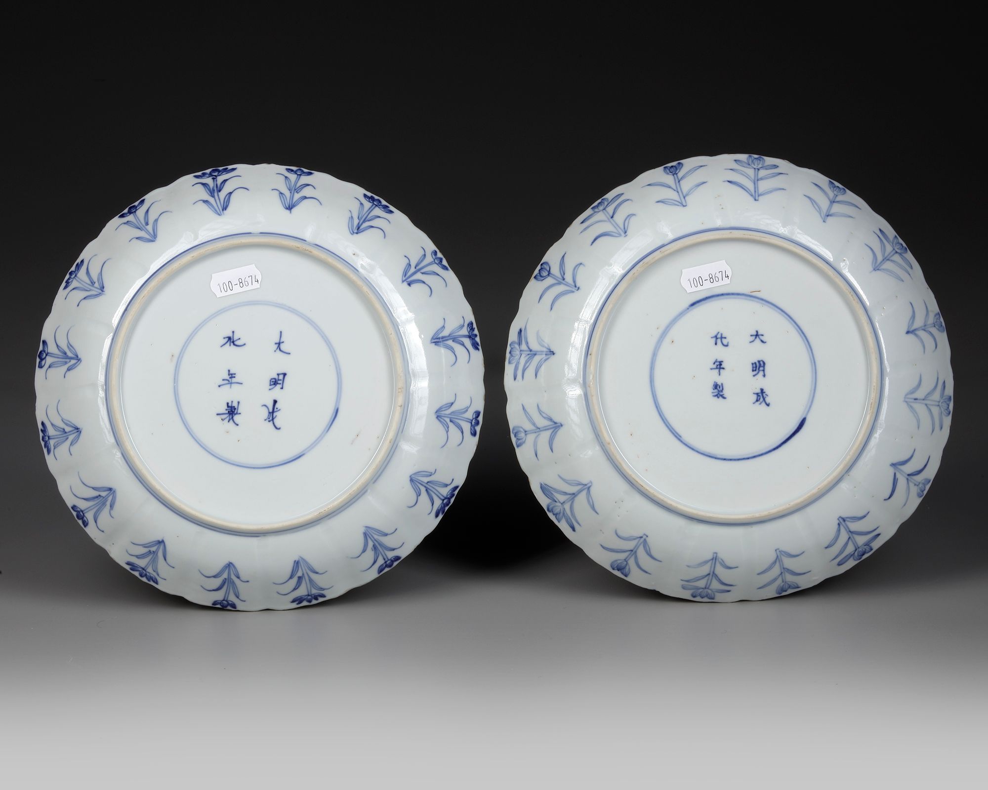 Two thinly potted Chinese scalloped-rim blue and white porcelain dishes decorated with a central scene of a mounted man and woman out hunting within a landscape, the rim bordered with penciled stylized lotus. The reverse also with stylized lotus around the rim and centered with a Chenghua mark.