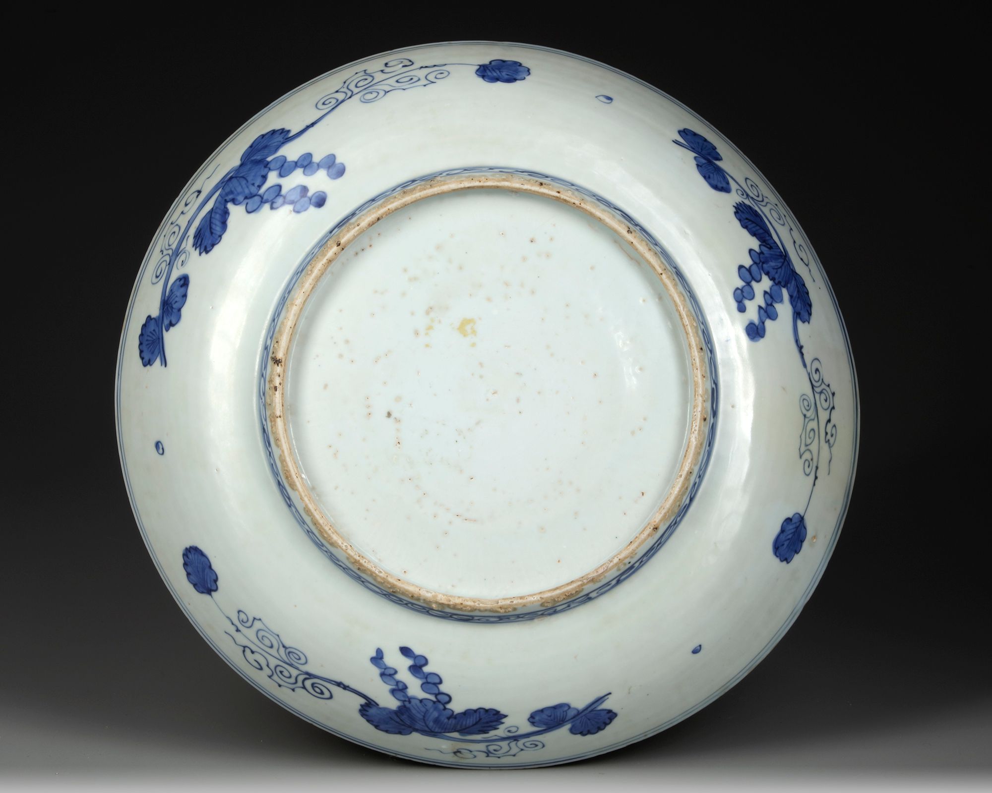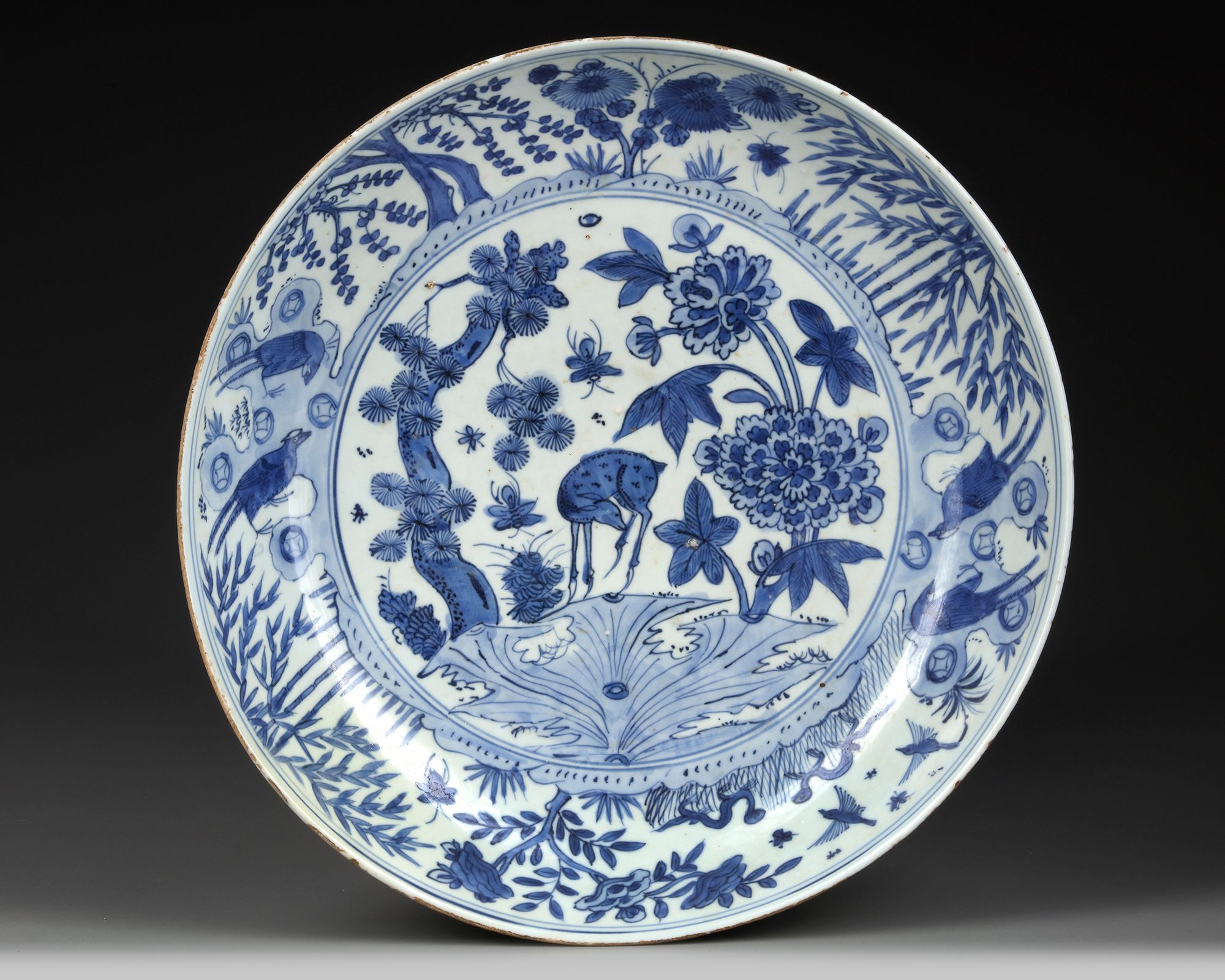 A Chinese porcelain charger decorated in cobalt blue with a central panel enclosing a deer beside a pine tree and penoies blossoming branches in a lake landscpae. The conical sides with a band containing pine, prunus and bamboo "the Three Friends of Winter".