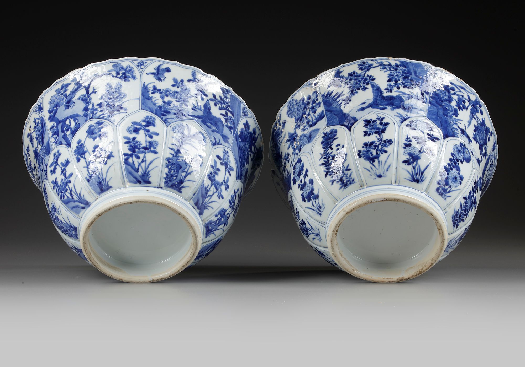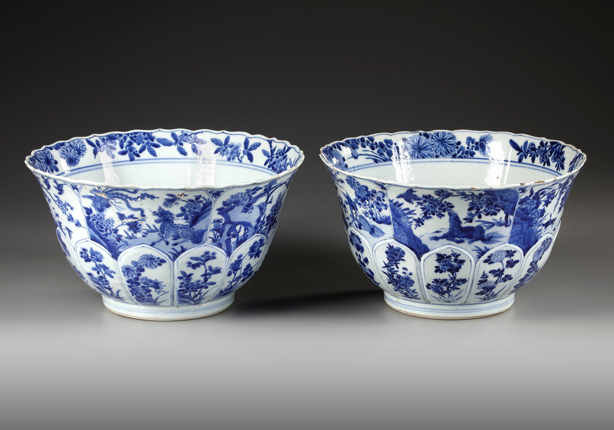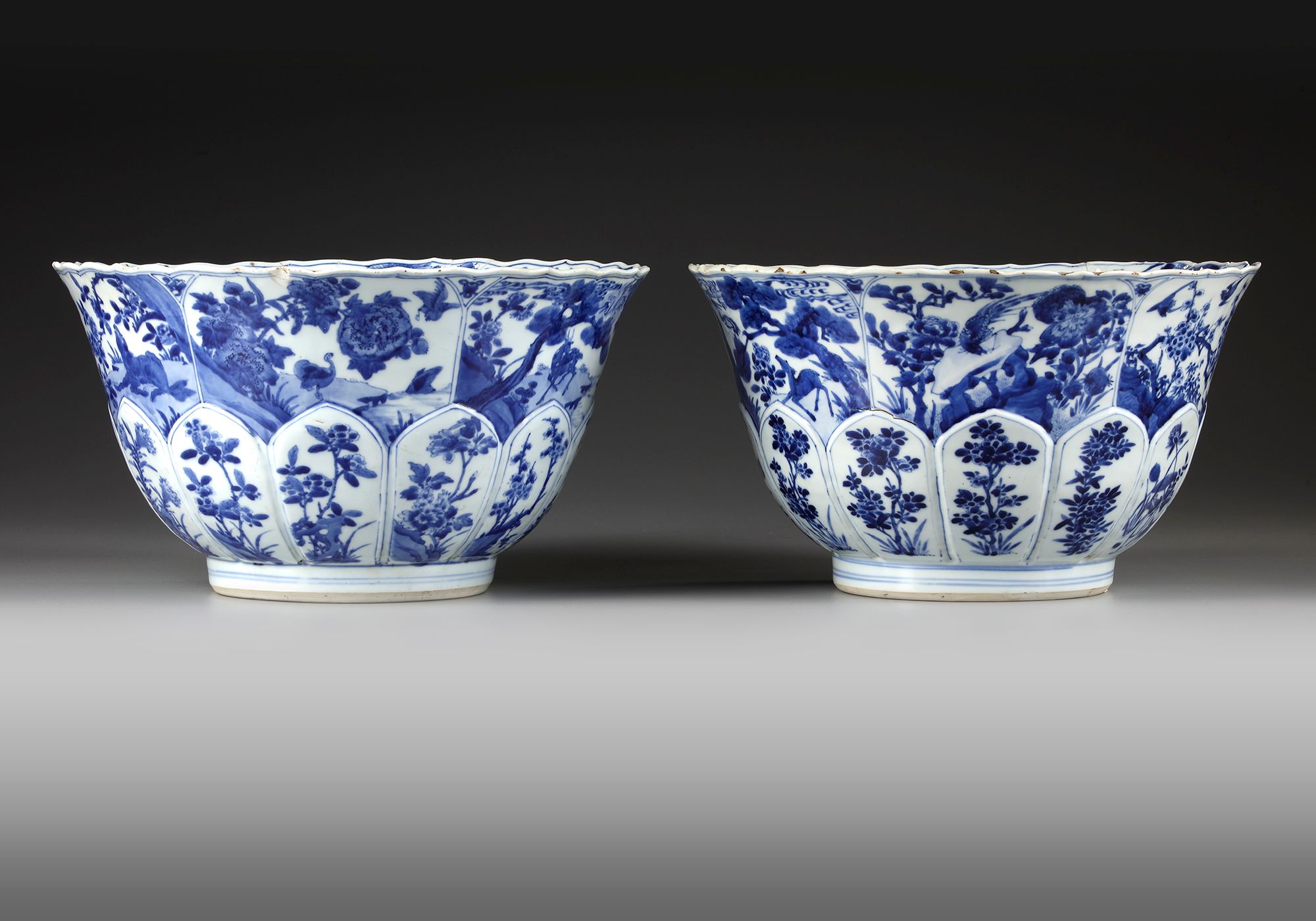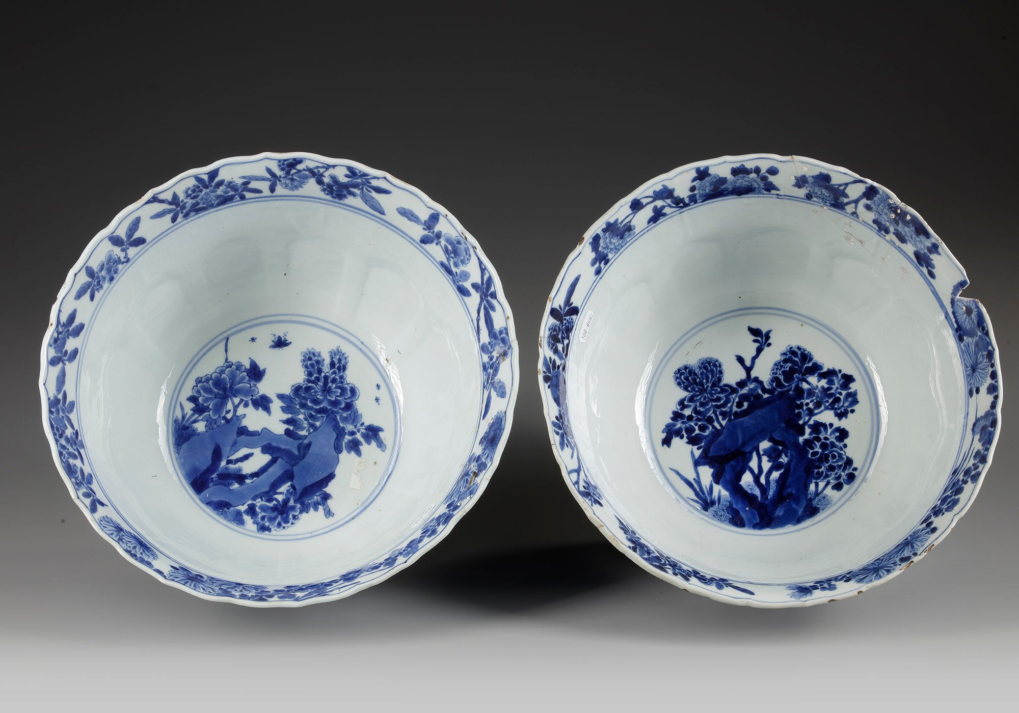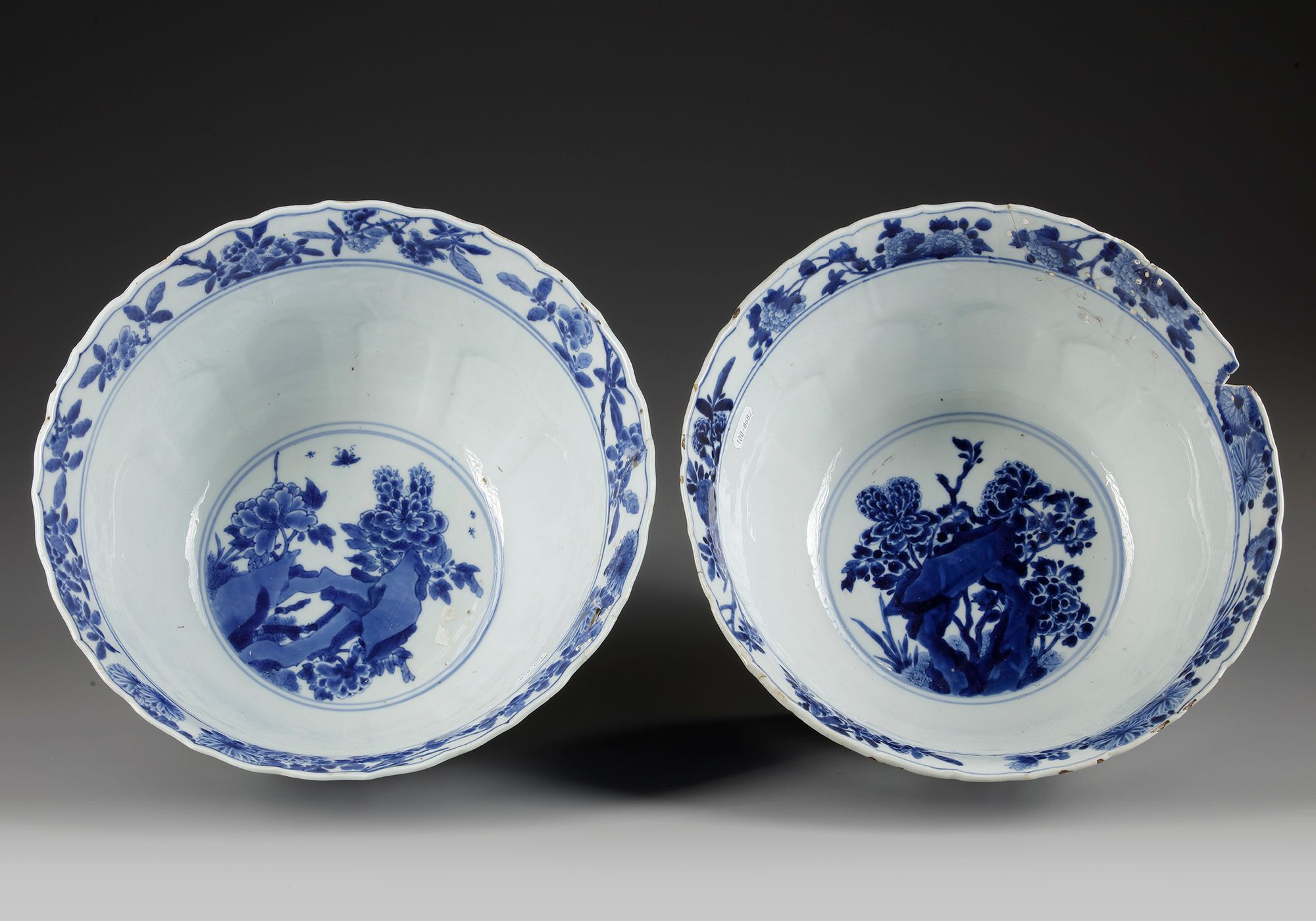 Each bowl is decorated in various shades of cobalt blue above a band of moulded lotus petals with cartouches enclosing different animals qilin, phoenix bird, deer and other birds perched amongst trees. The interiors each with central roundel enclosing peonies blossoming branches growing from ornamental rocks, a band of floral sprigs below the foliate rims.
