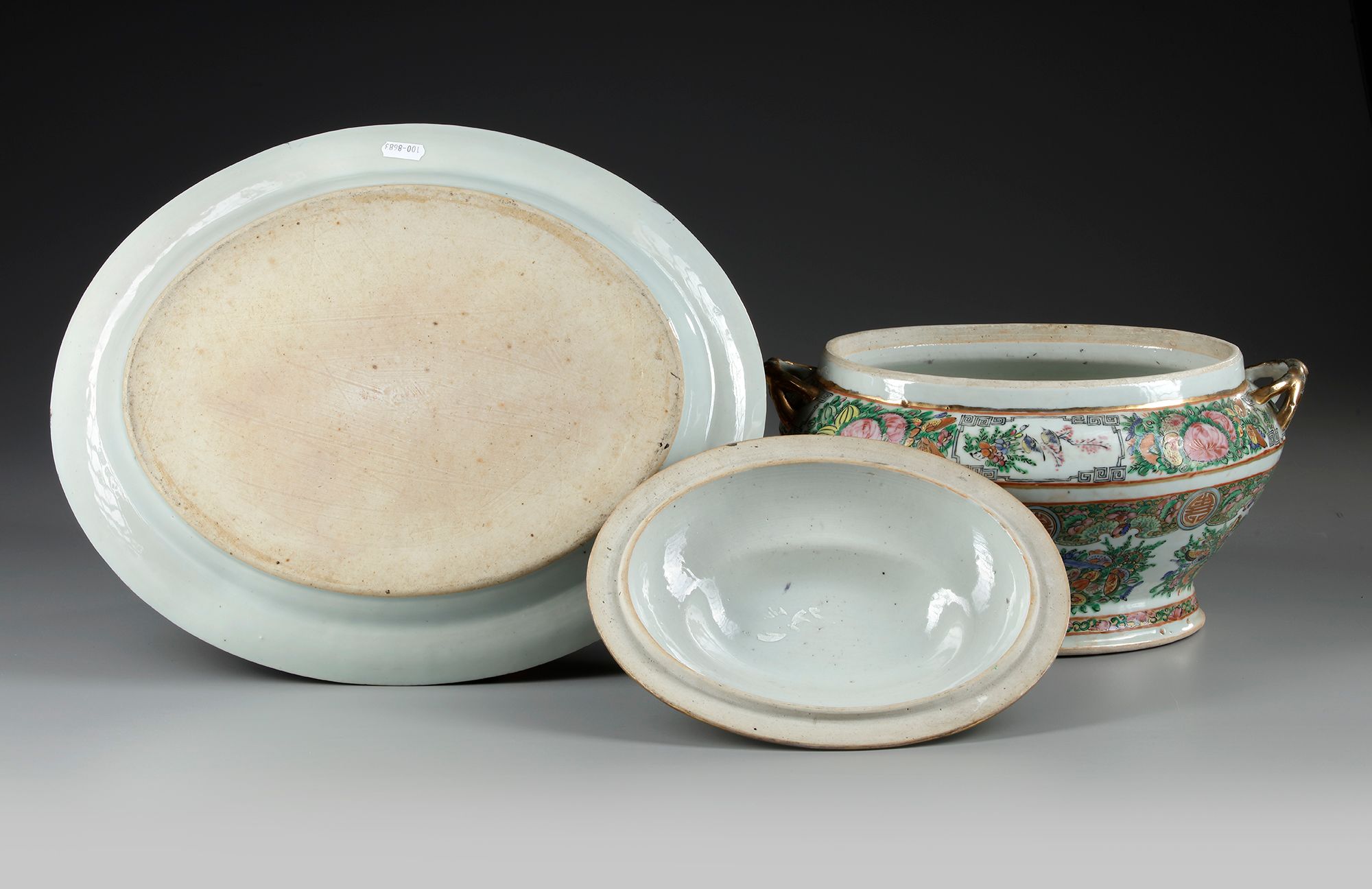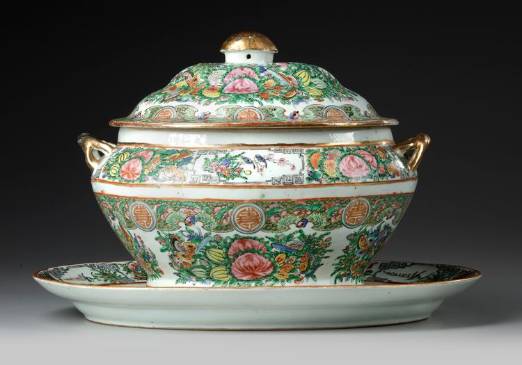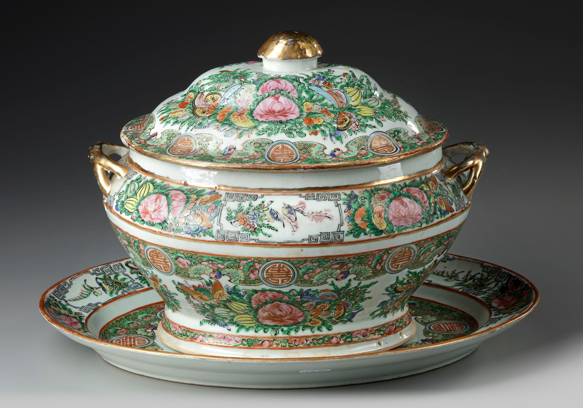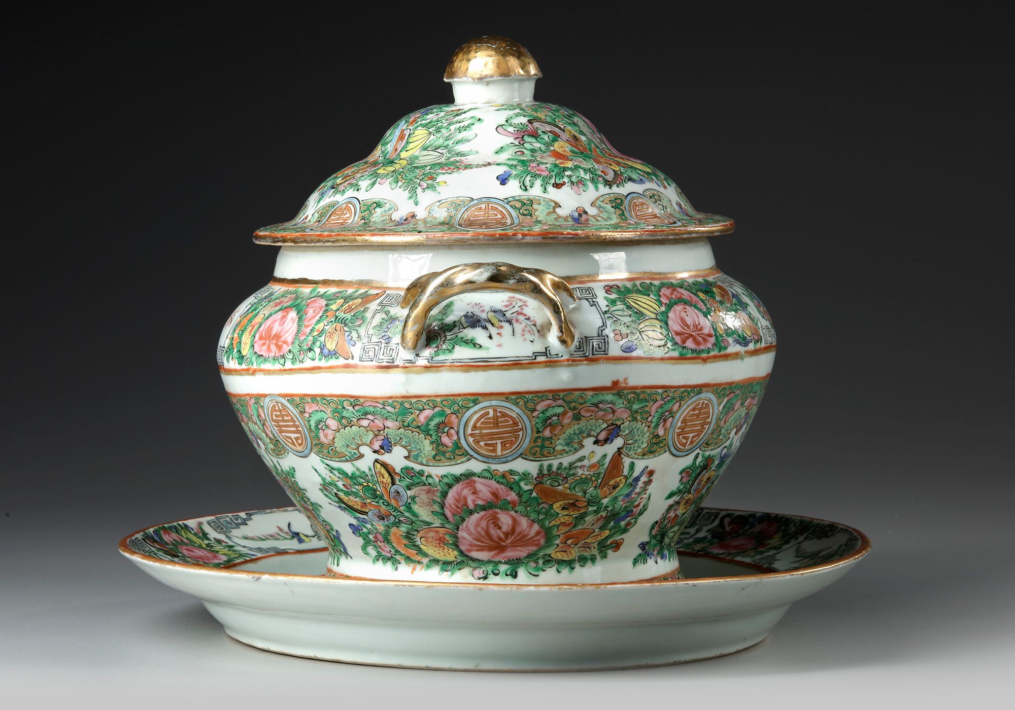 The tureen is fashioned with two upward swept gilt handles and a domed cover surmounted by a mushroom-cap finial, all on an oval stand.