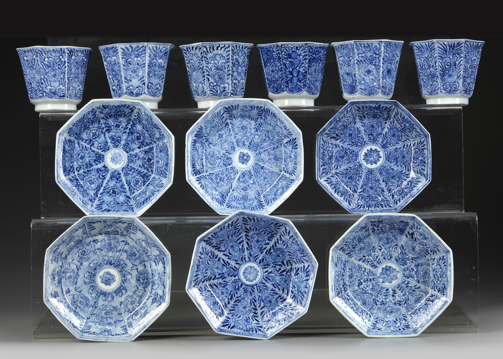 A set of six large porcelain cups and saucers of octagonal shape. The saucers decorated with panels enclosing flower scrolls with a flower in double circle in center. Pattern repeated on the exterior of cups, interior with a flower branch in double circle, zigzag work band at the edge.