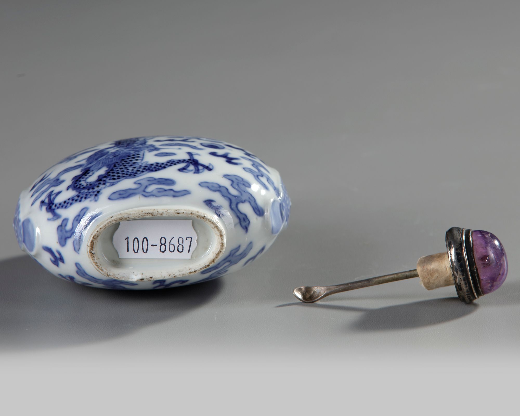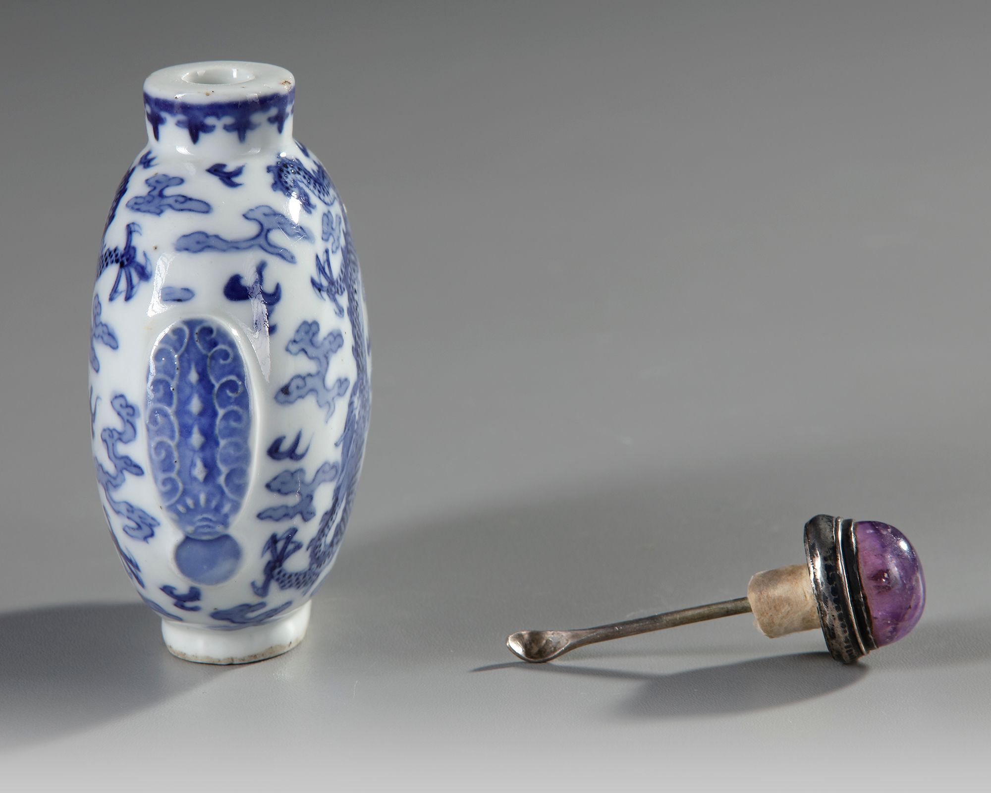 A Chinese porcelain snuff bottle decorated in cobalt blue with leaping dragons chasing a flaming pearl amongst clouds. Height 11 cm. Width 8.5 cm.