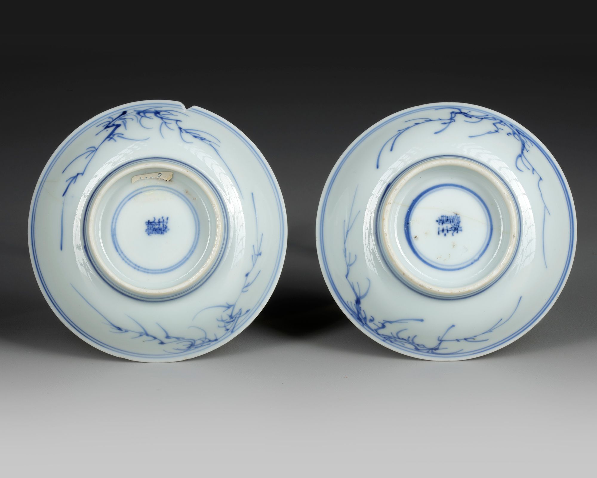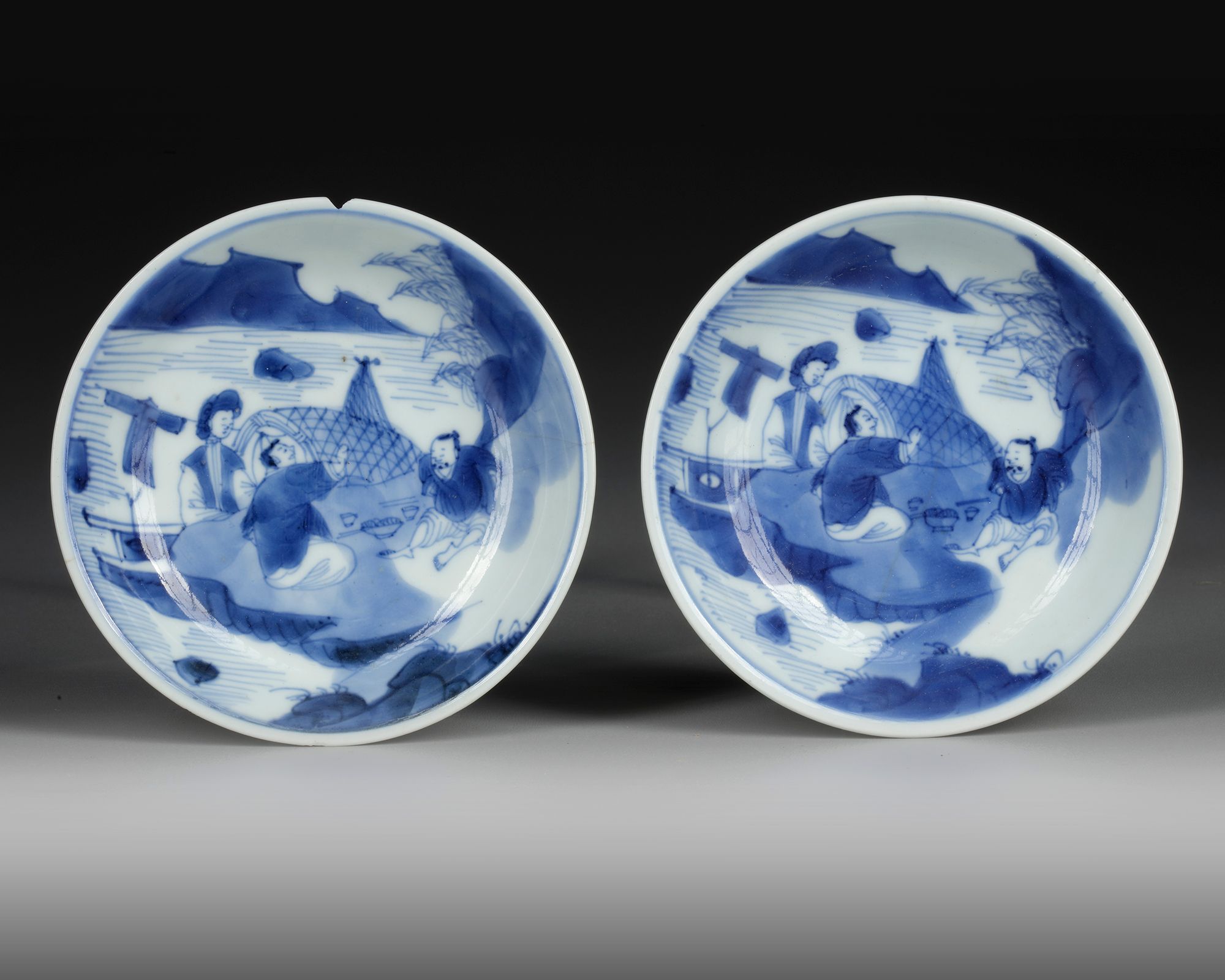 Decorated in underglaze blue with a river landscape and three figures sitting along the waters edge. Diameter: 11.3 cm.