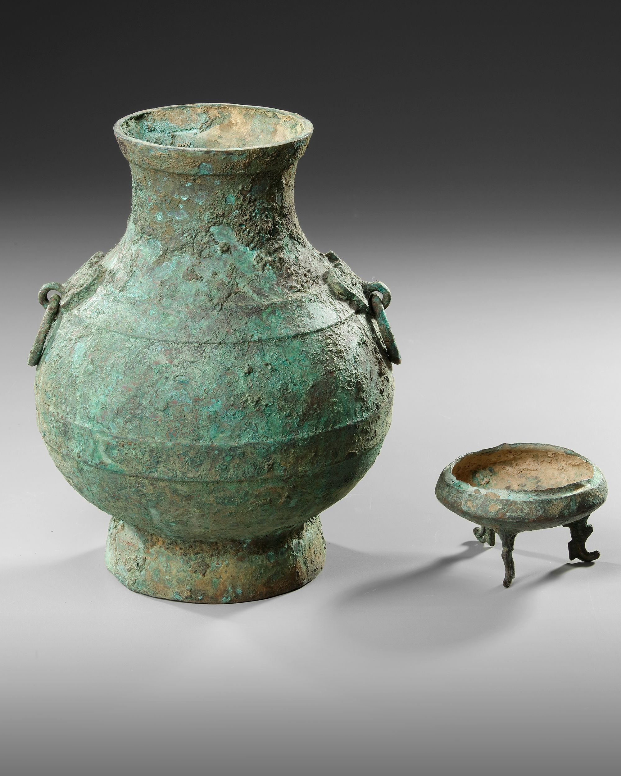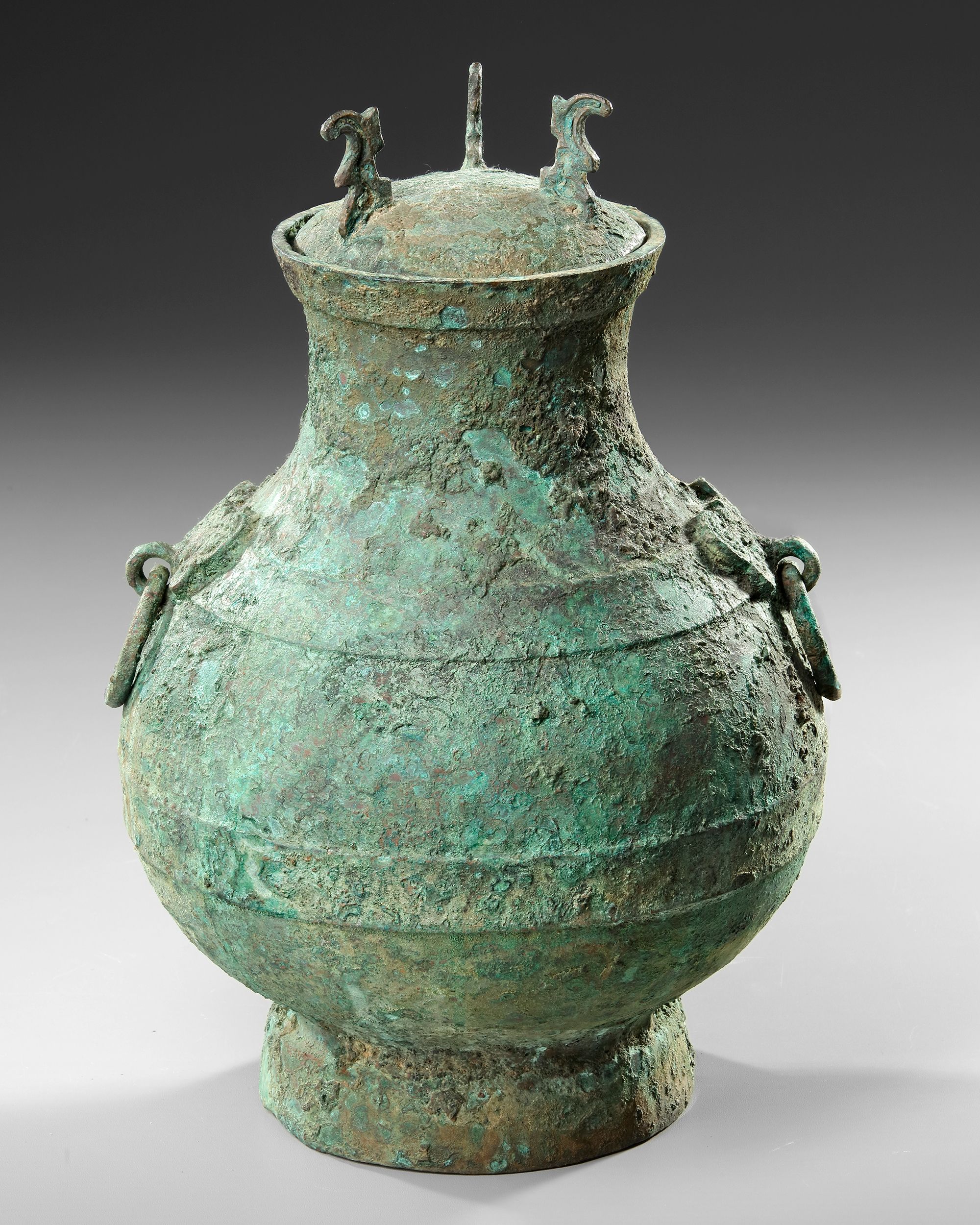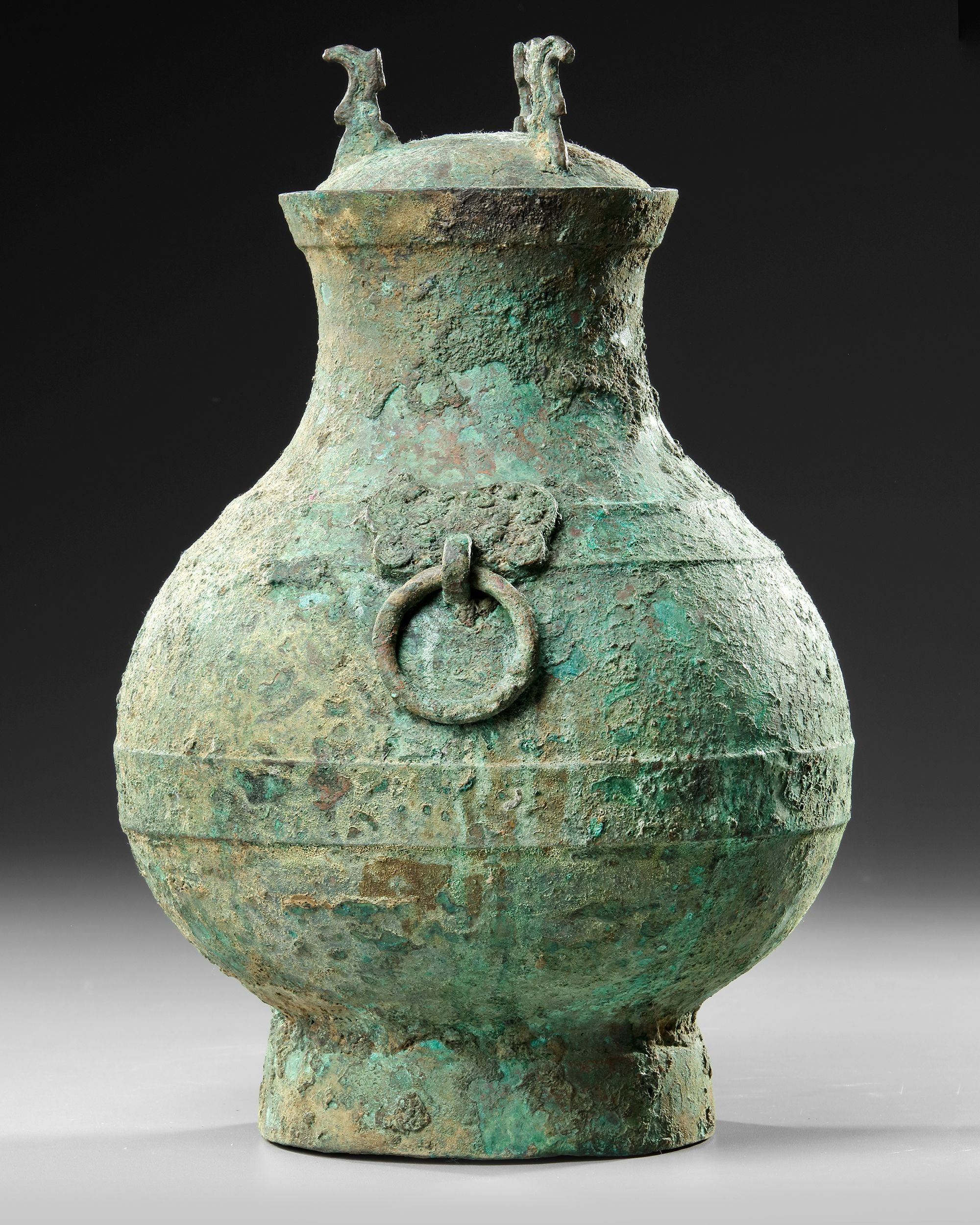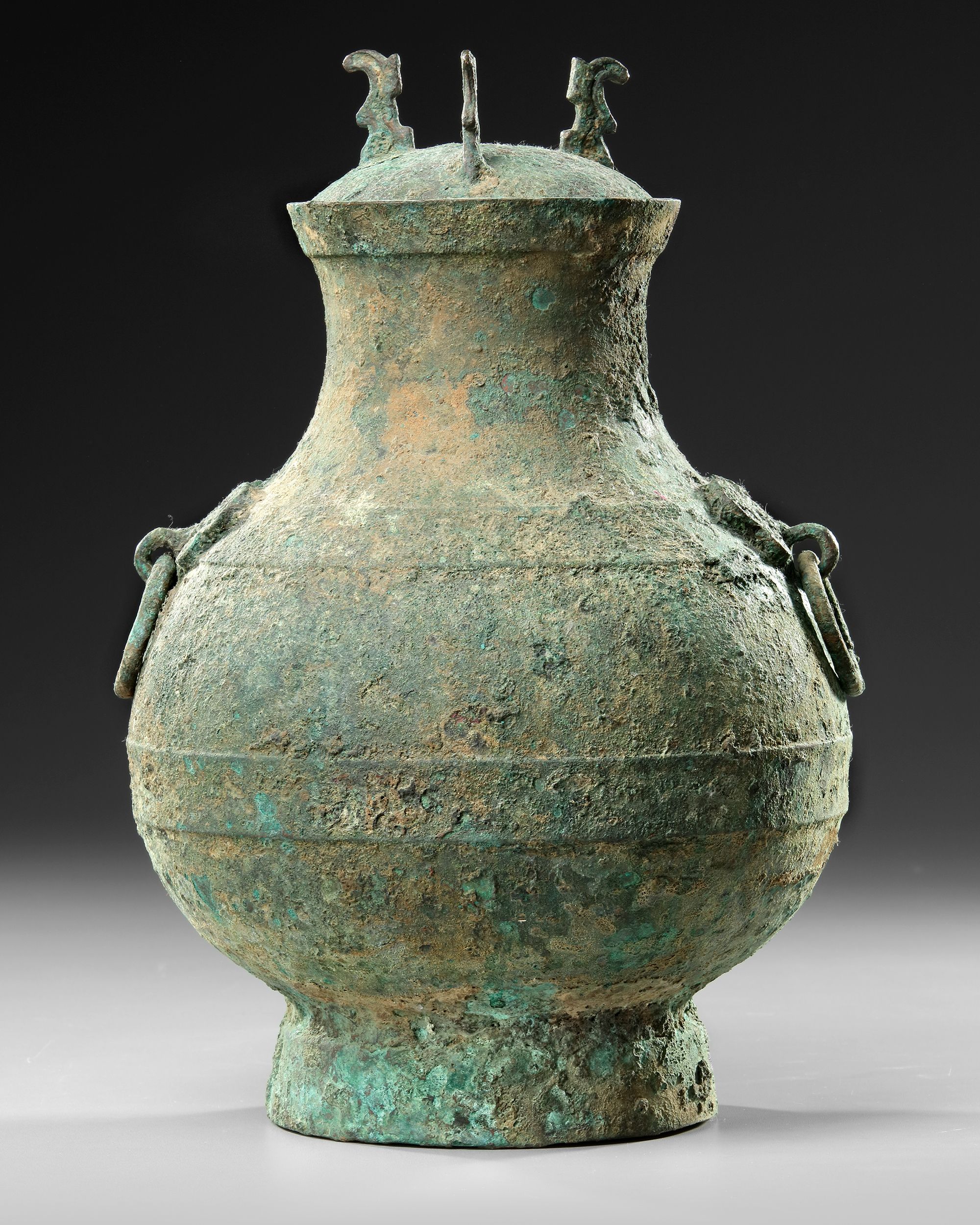 A Chinese bronze pear shaped vessel swelling at the belly above a flared circular base and contracting at the neck. The vase stylized with two Taotie masks affixed with ring handles. These stylized animals represent a type of dragon found in Chinese mythology, circumferential bands at midline, junction of body and rim.