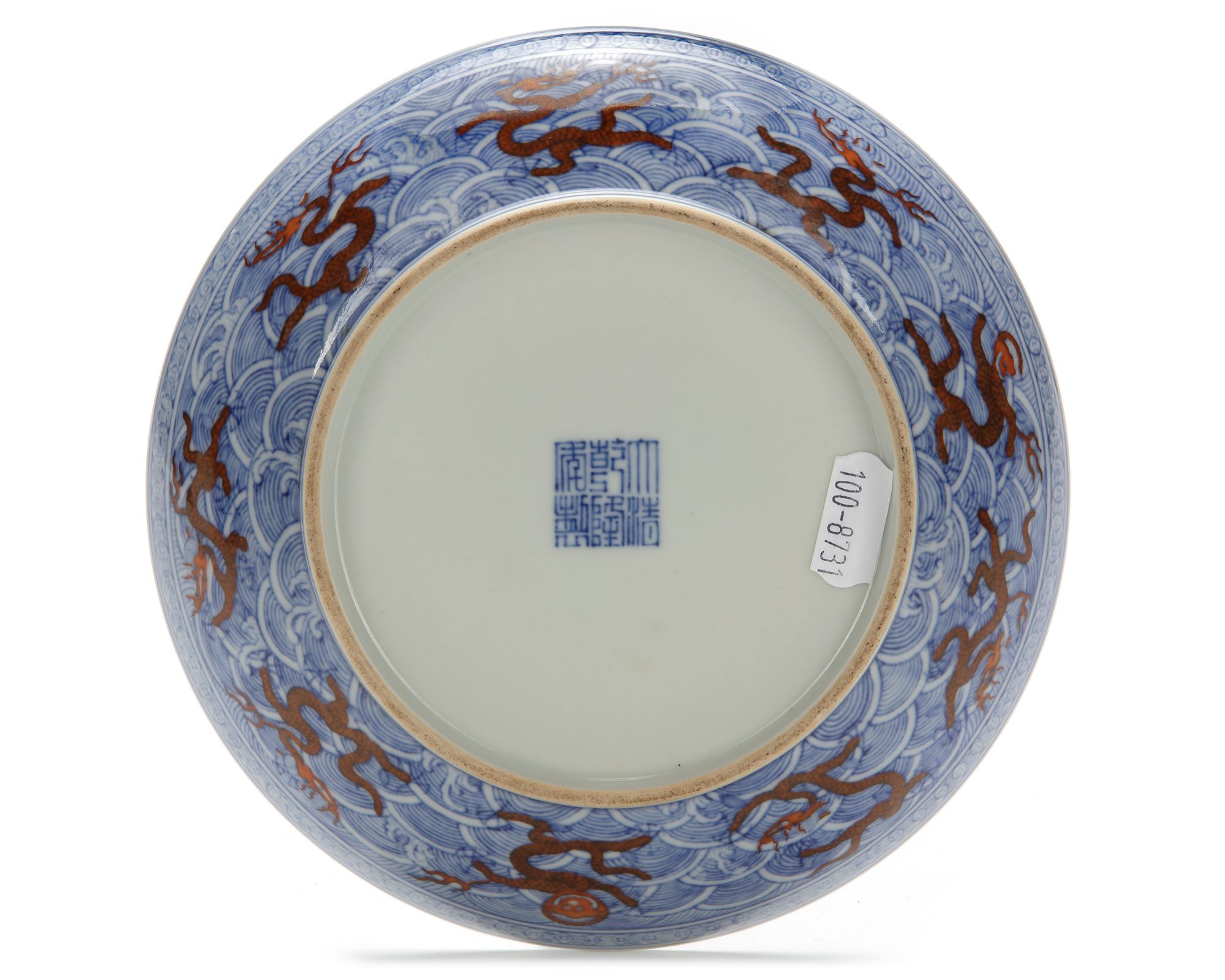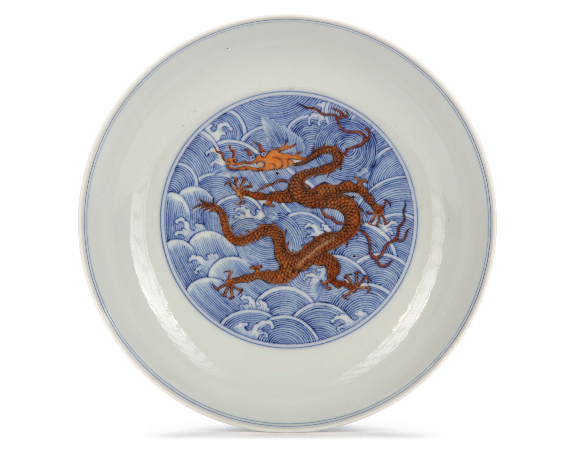 A CHINESE IRON-RED-DECORATED BLUE AND WHITE DRAGON DISH, 19TH CENTURY