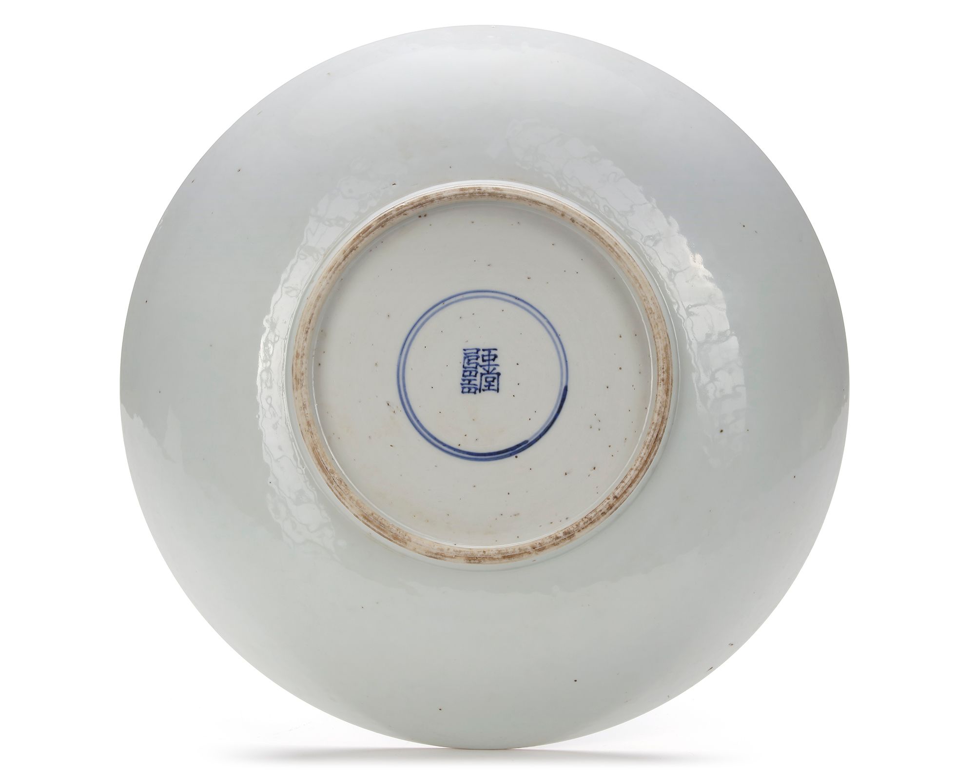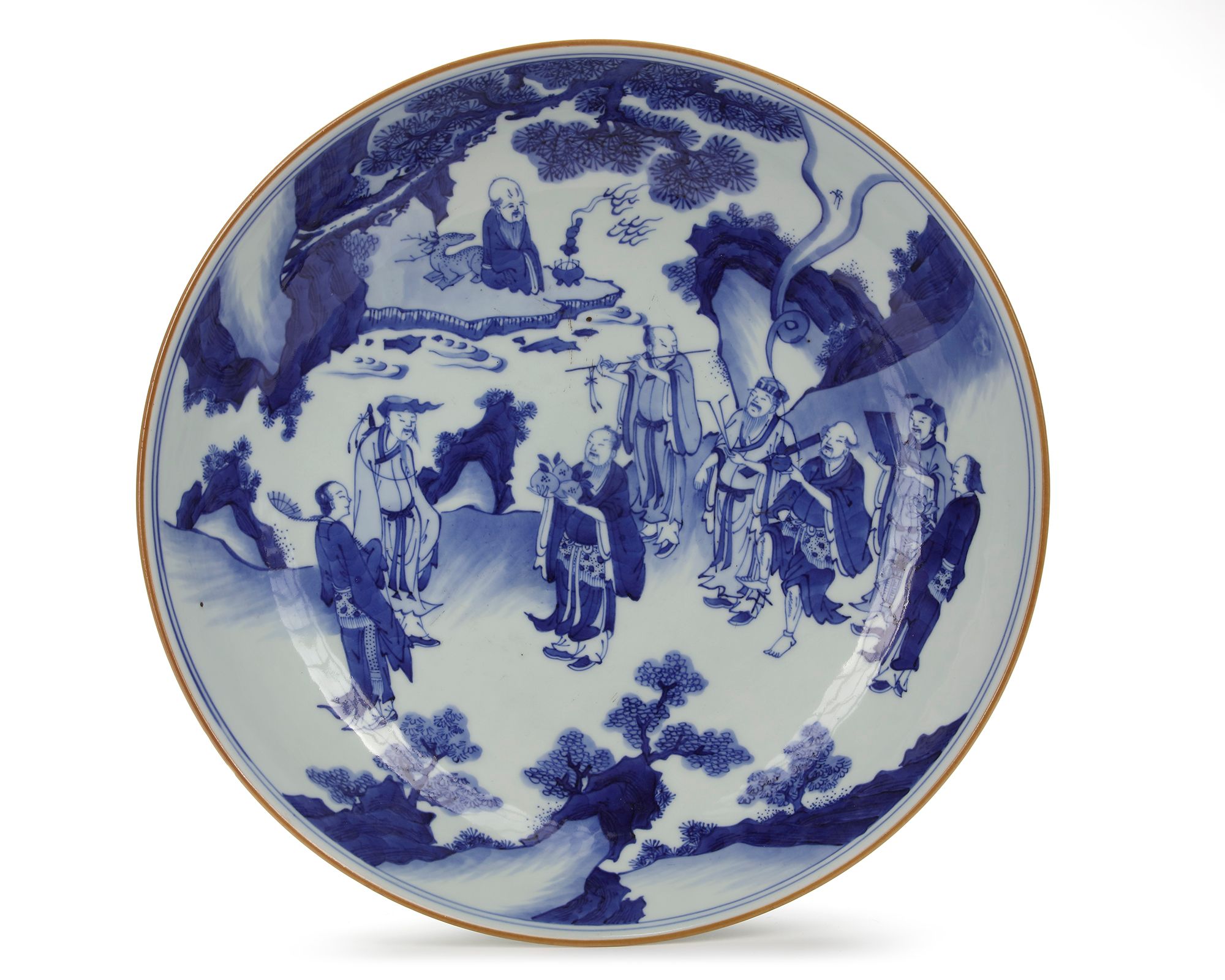 A Chinese porcelain dish painted with the Eight Daoist Immortals in a rocky landscape, with the Star God Shoulao seated on an outcrop beside a seated deer with an incense burner emitting smoke. The bottom with Yutang jiaqi four-character mark.
