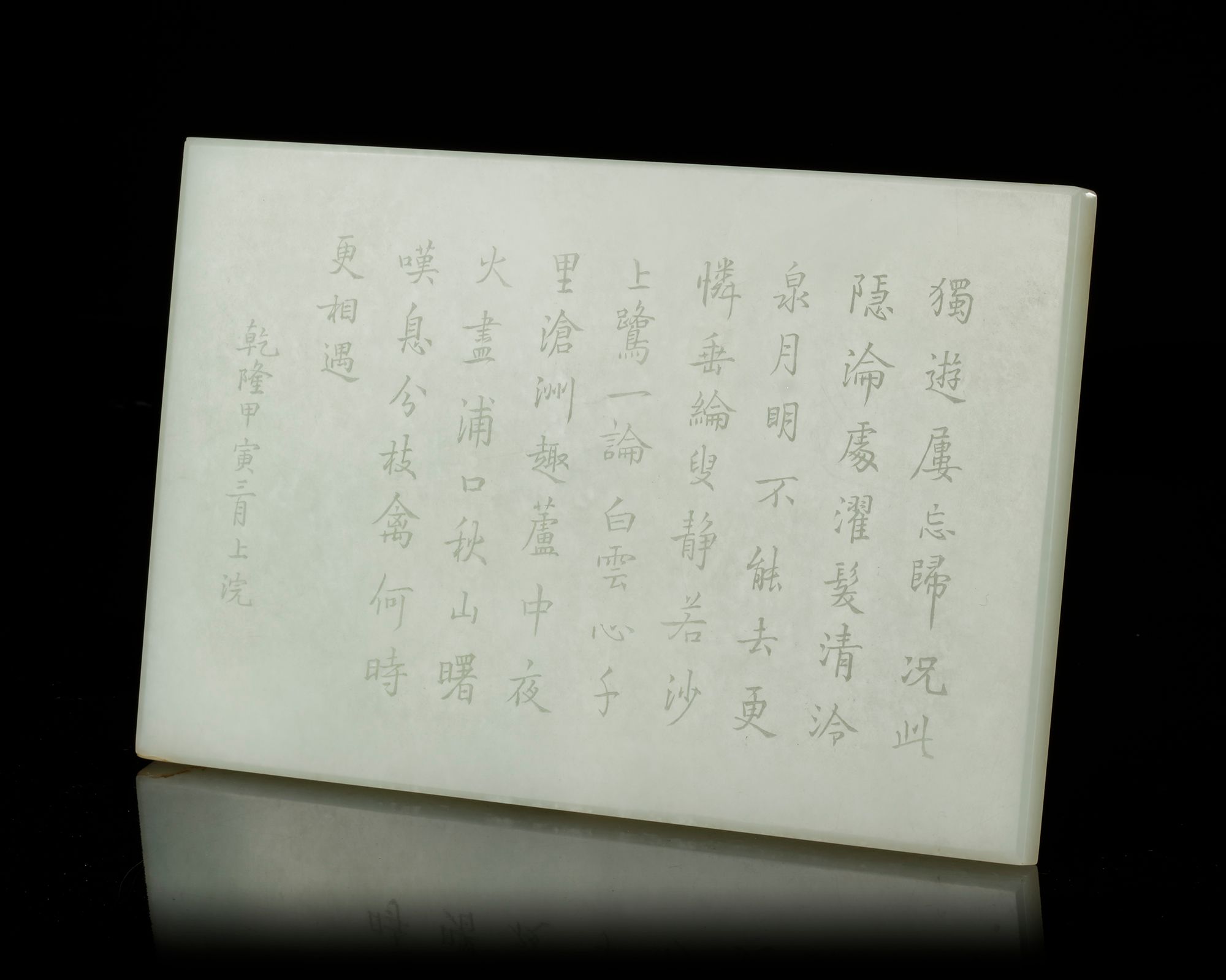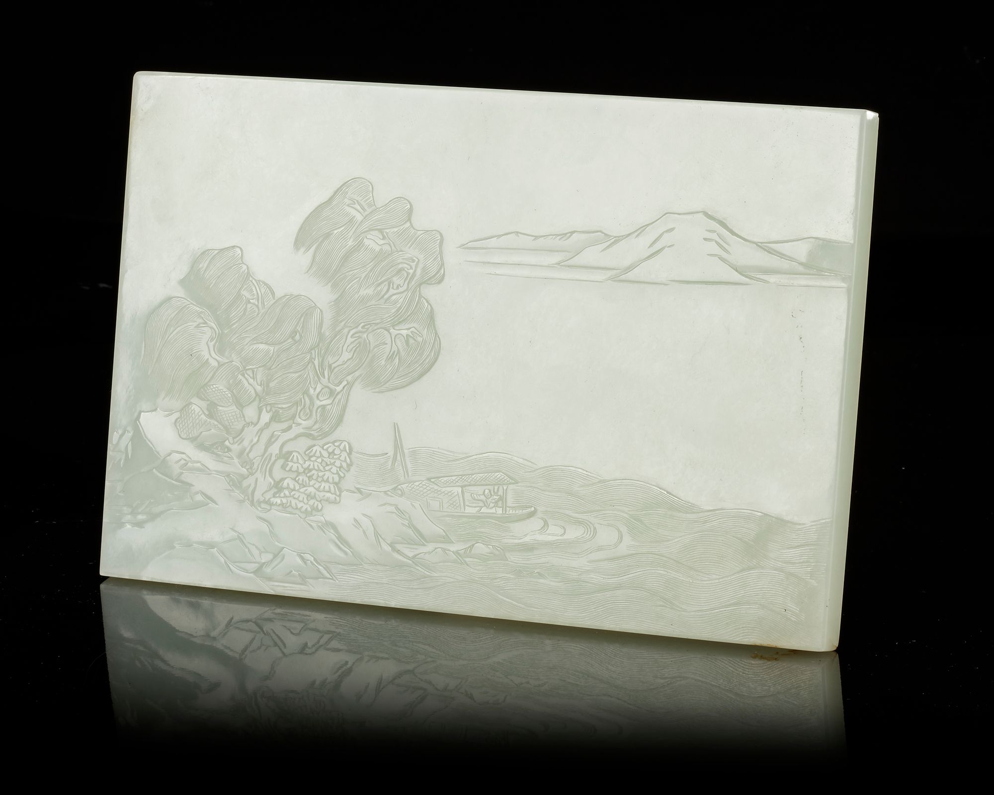 A Chinese rectangular white jade plaque, the front side is well carved with figures in a sampan sailing in crushing sea waves beside a pine tree in a mountainous landscape. The back side carved with Imperial Chinese inscriptions.