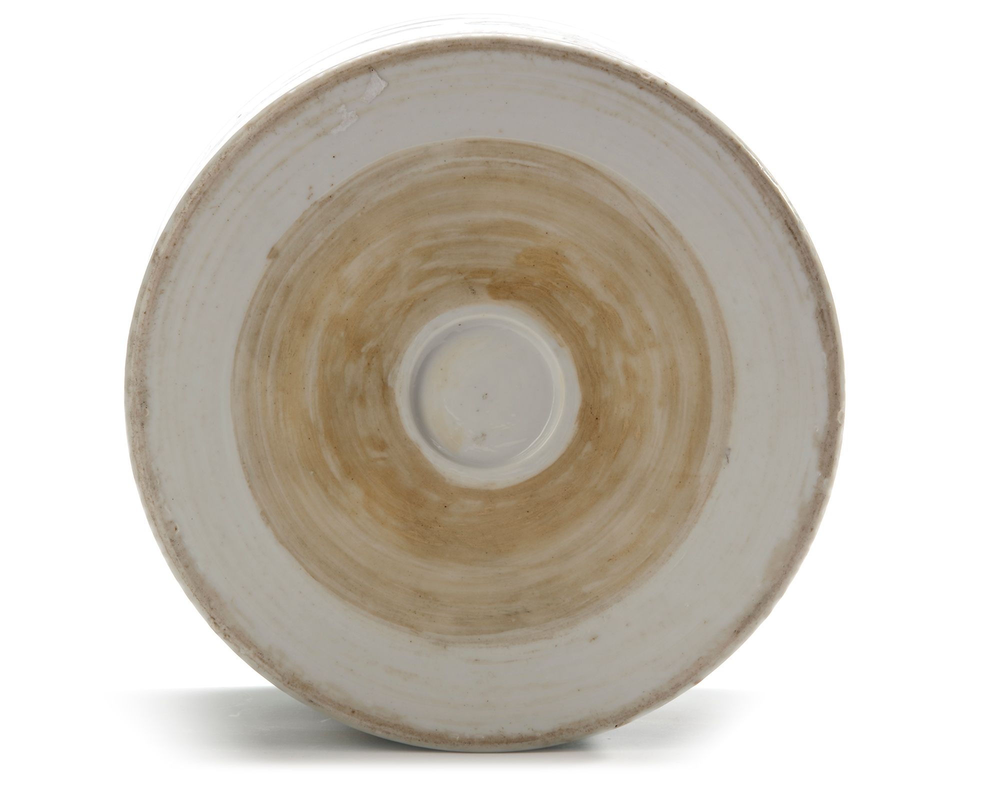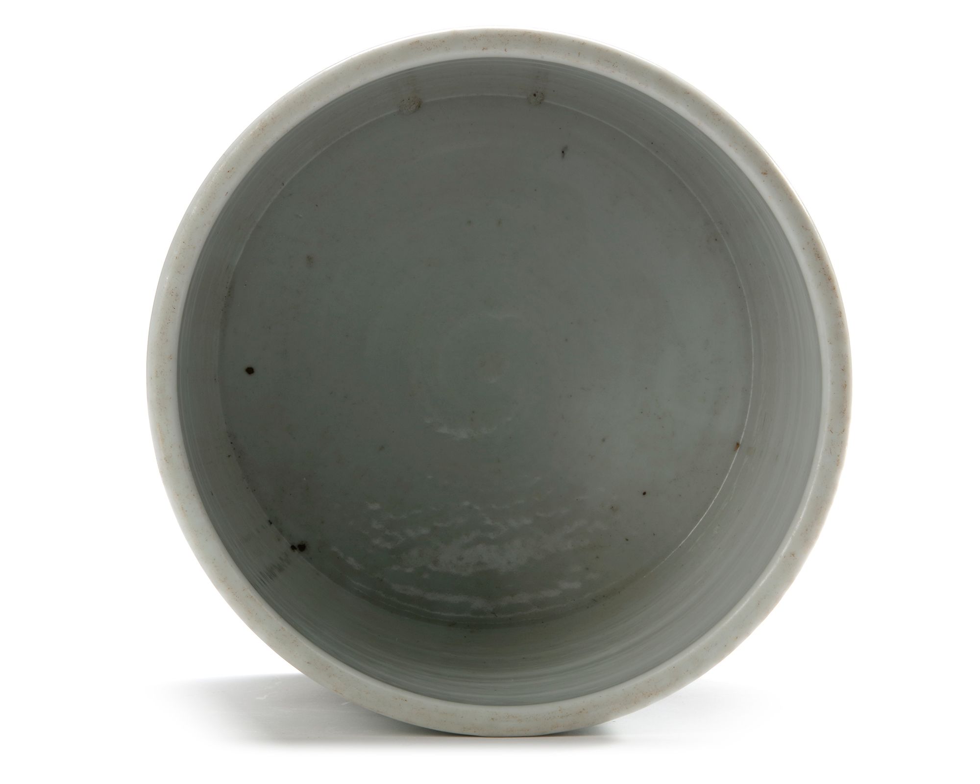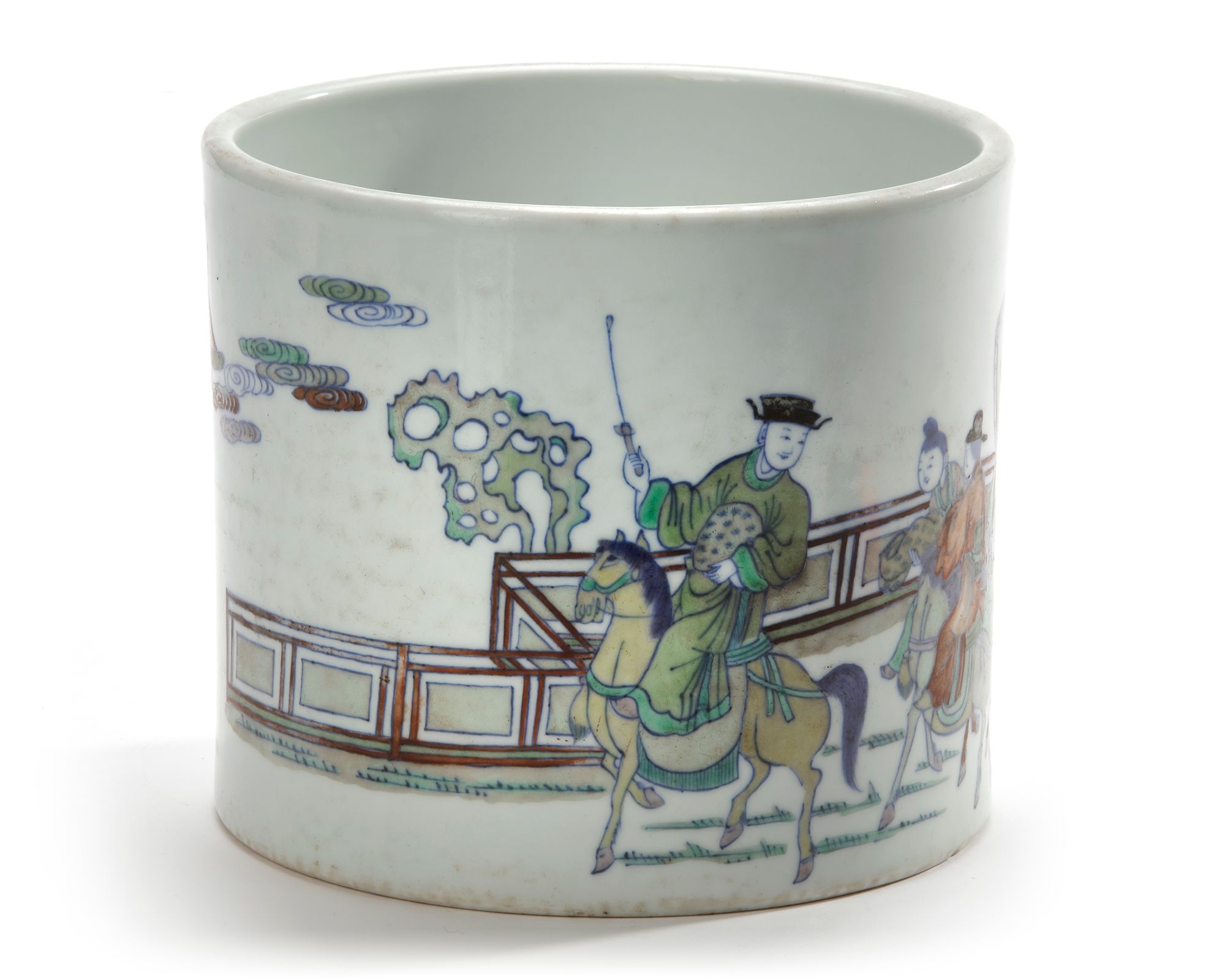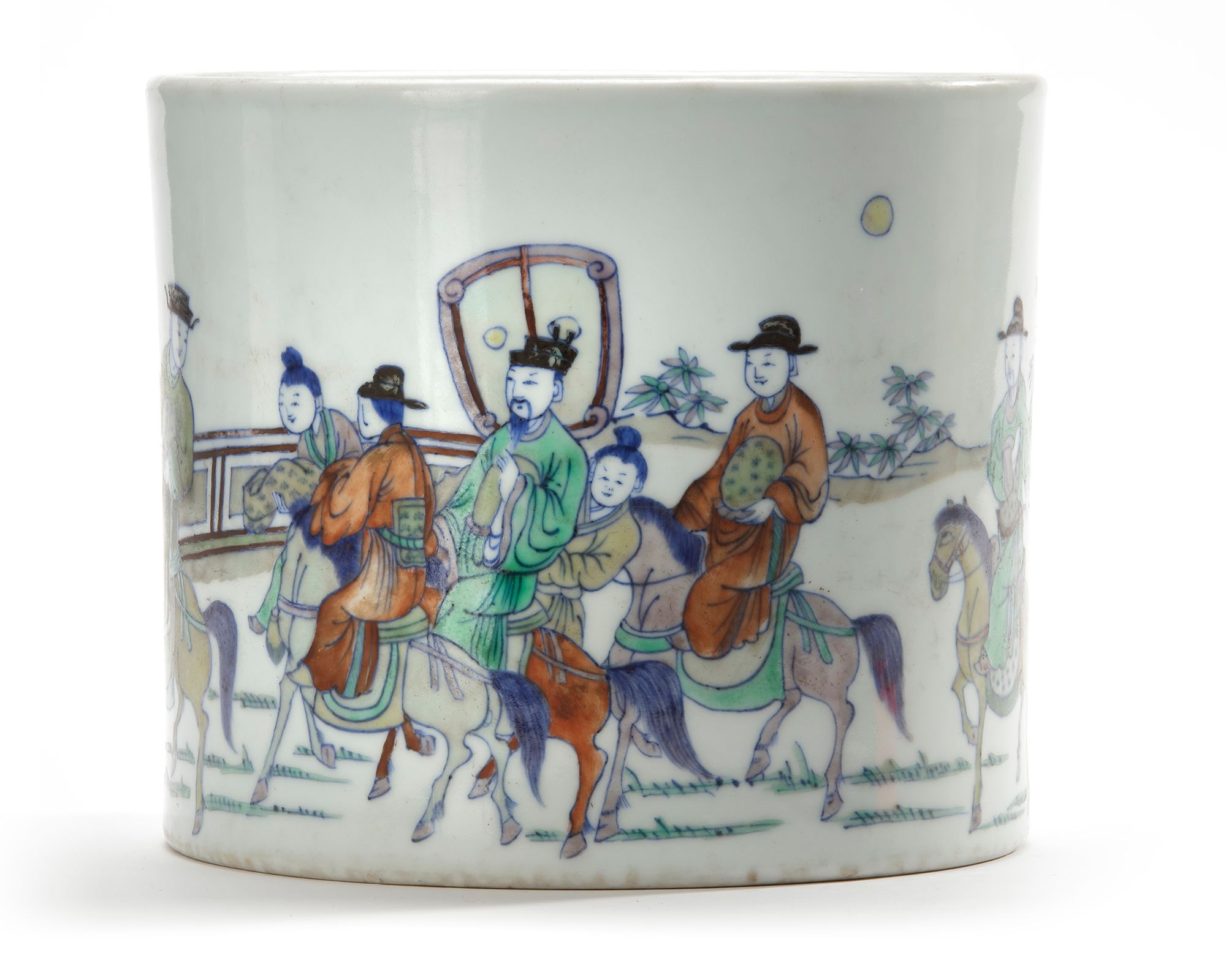 A Chinese Porcelain brush pot decorated in famille verte with scholars mounted on horses with their students and servants in a fenced landscape.