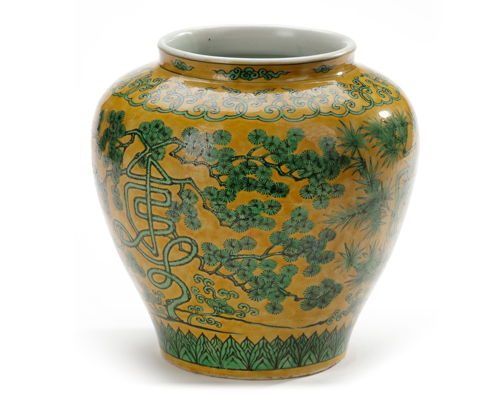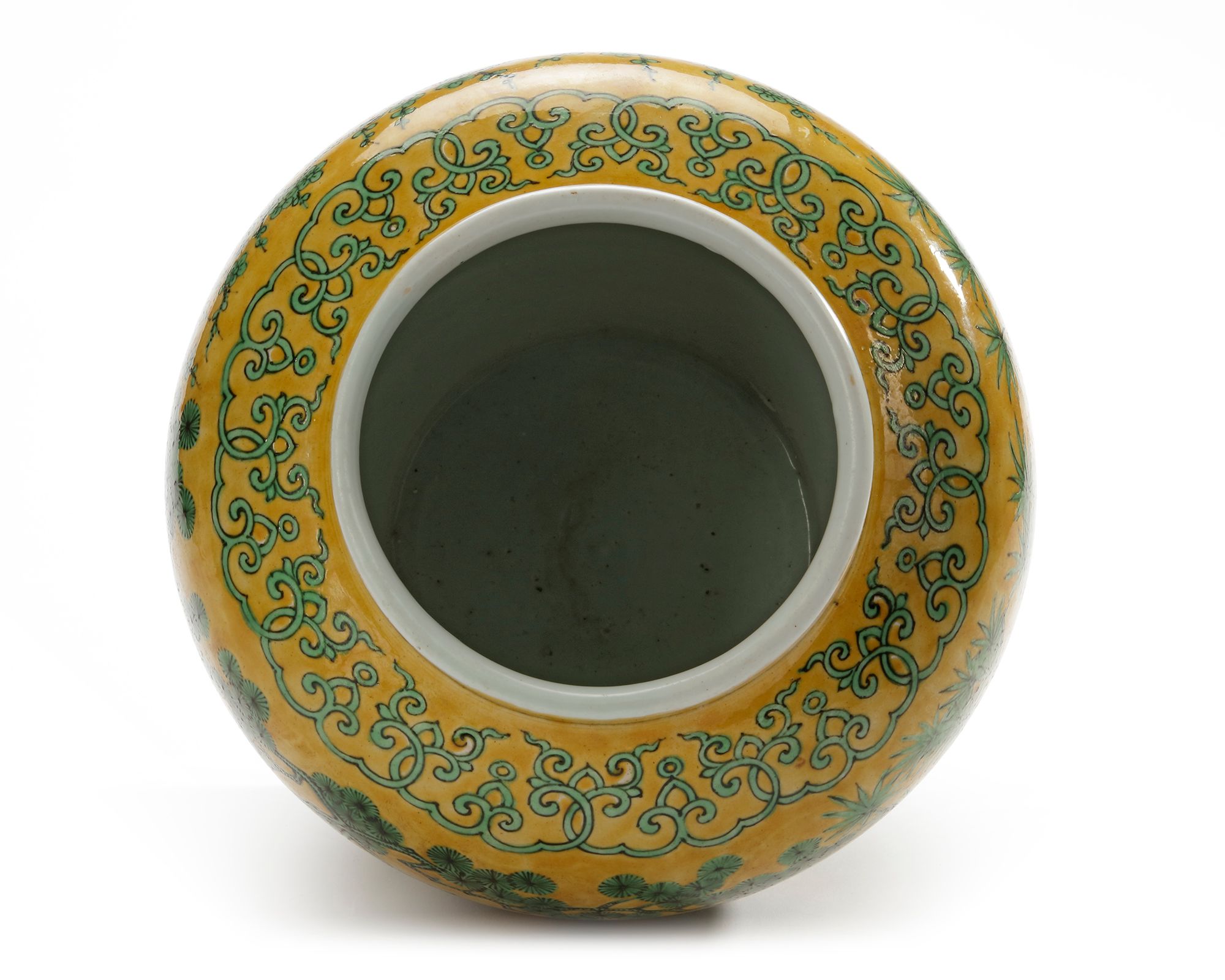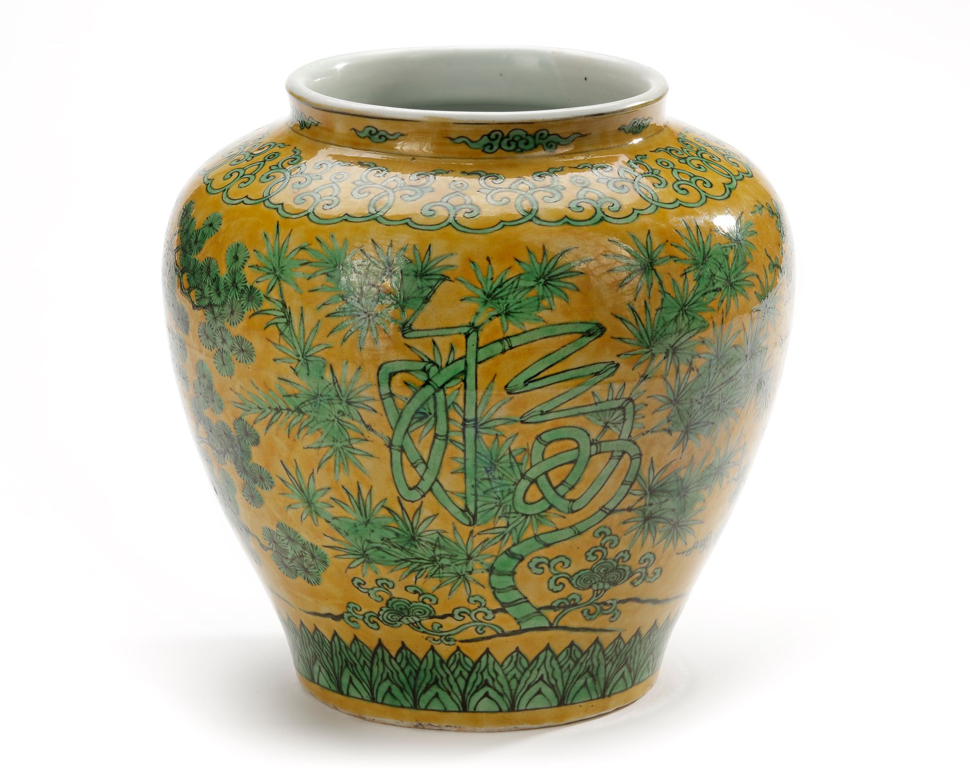 A Chinese Porcelain jar decorated with a bamboo, flower prunus tree and a pine tree, each with their branches twisted to form the characters, Fu, Lu and Shou, 'Happiness, Wealth and Longevity', growing on a ground, evenly spaced between stylised lingzhi fungus, the base with stiff leaves. The shoulder with a band of ruyi heads, all enamelled in green against a rich egg-yolk yellow ground. The bottom with a Chinese Jiajing seal mark.