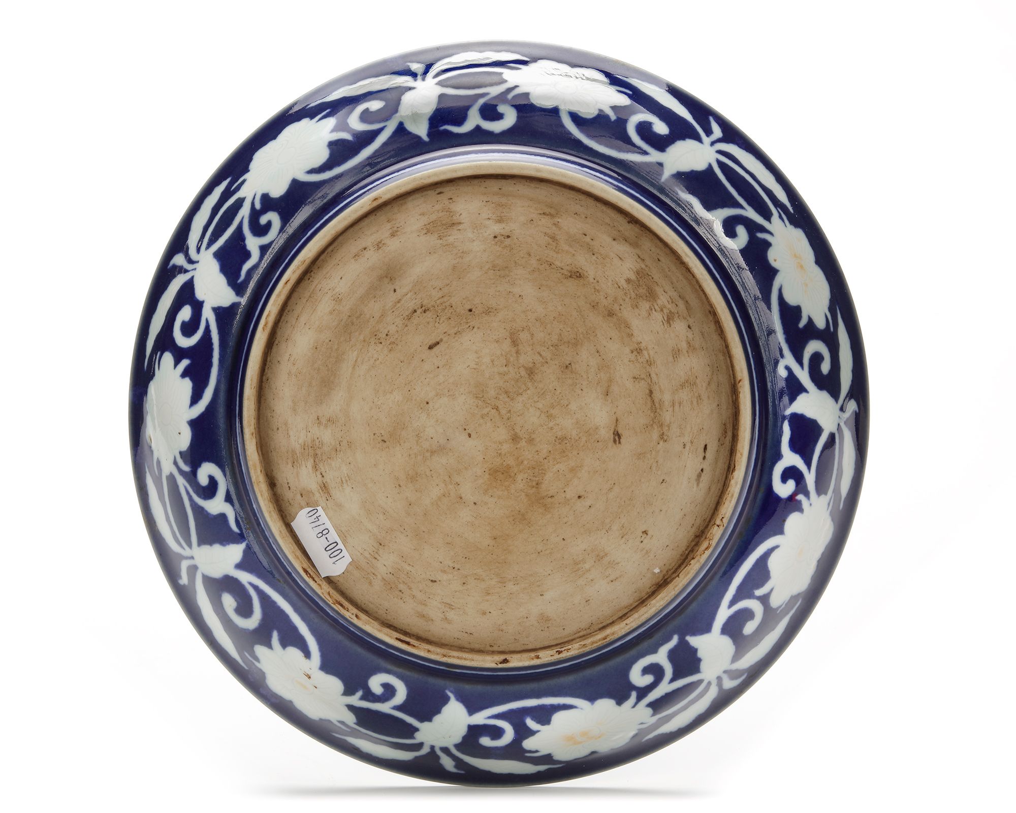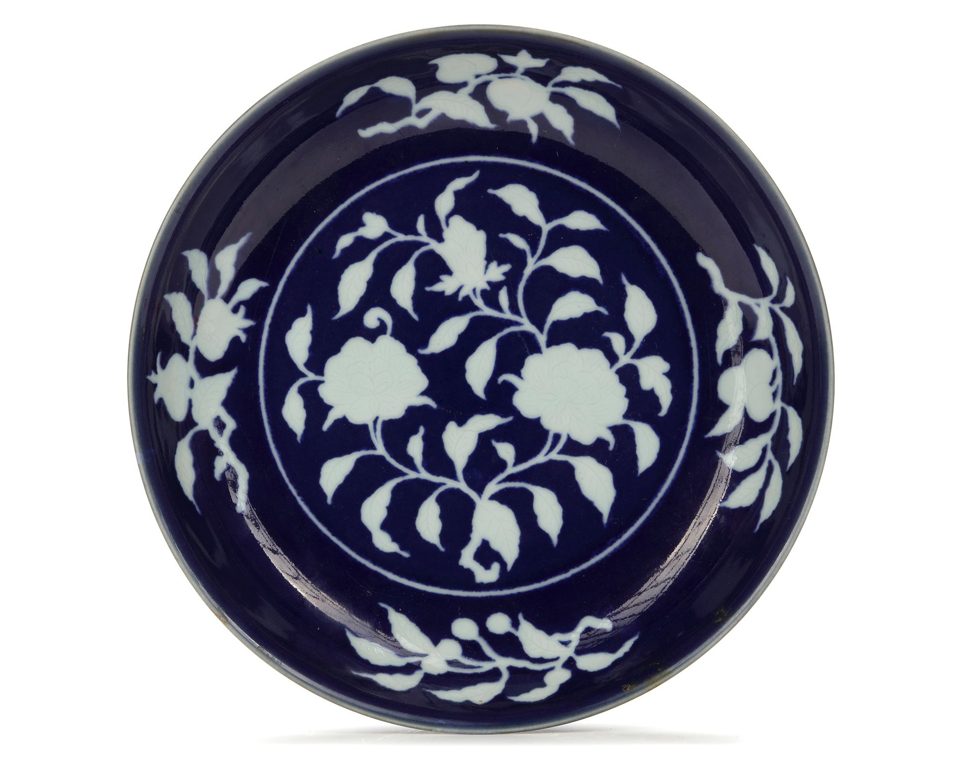 A Chinese Porcelain dish, well potted with shallow rounded sides rising from a short tapering foot to an everted rim, the decoration all reserved in white against a rich sacrificial blue glaze, the interior centered with a large medallion enclosing a flowering pomegranate spray with two open blooms and three attendant buds, interspersed with curling foliage, surrounded by a frieze along the well with four detached fruiting branches of peach, lychee, loquat and persimmon, each rendered at one of the four cardinal points, the exterior with seven large lotus sprays, the blooms and curling foliage lightly incised to render subtle veining, the base left unglazed.