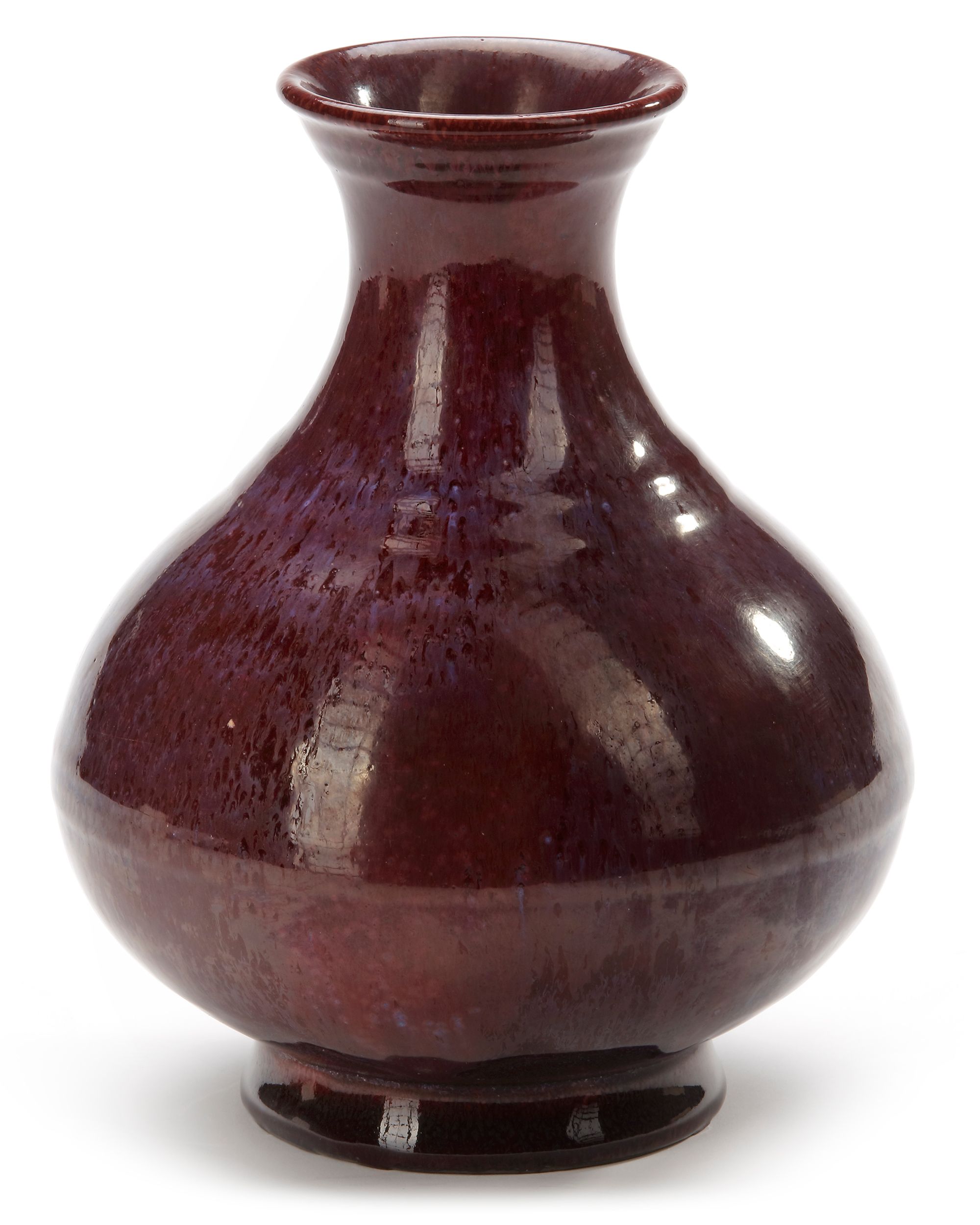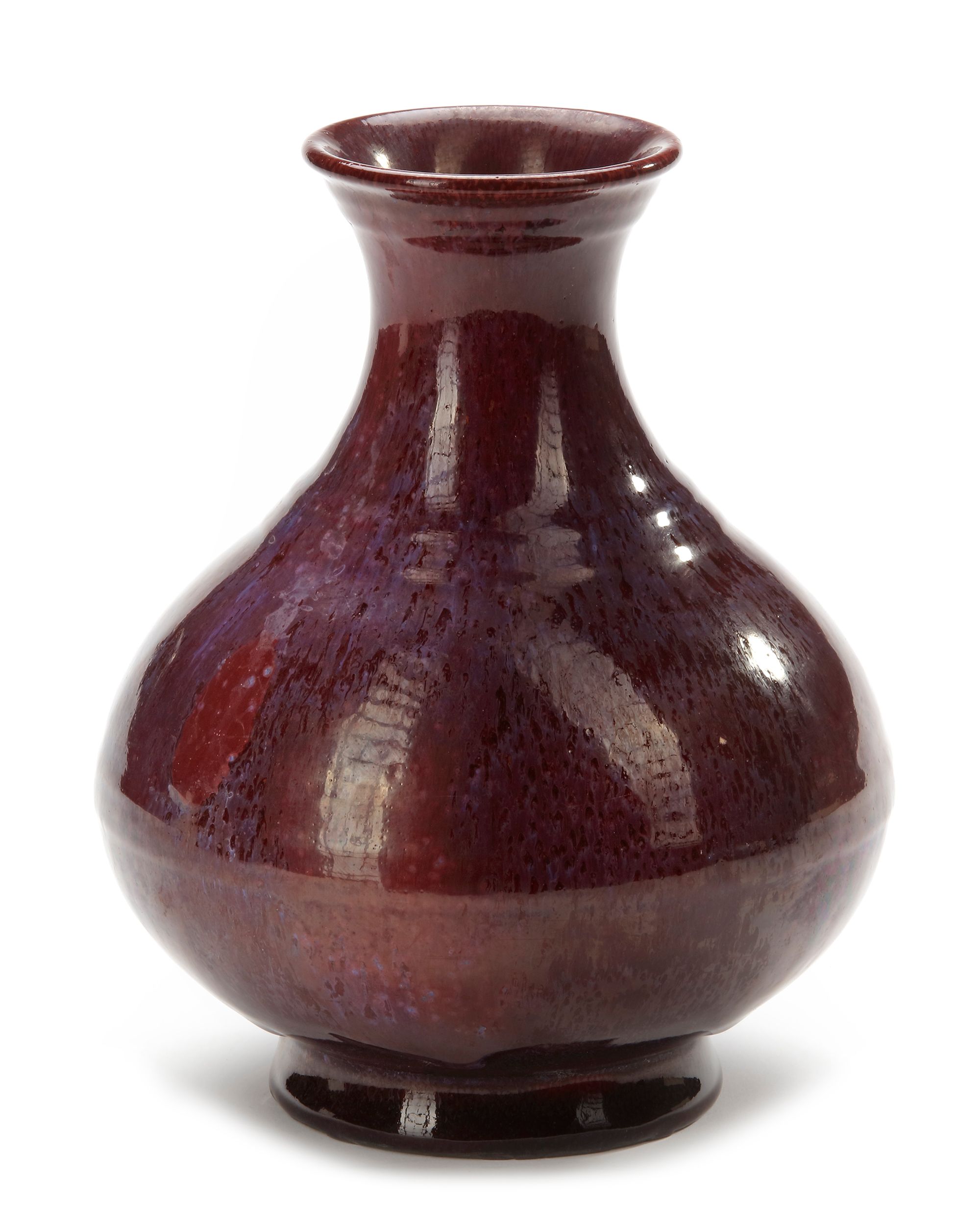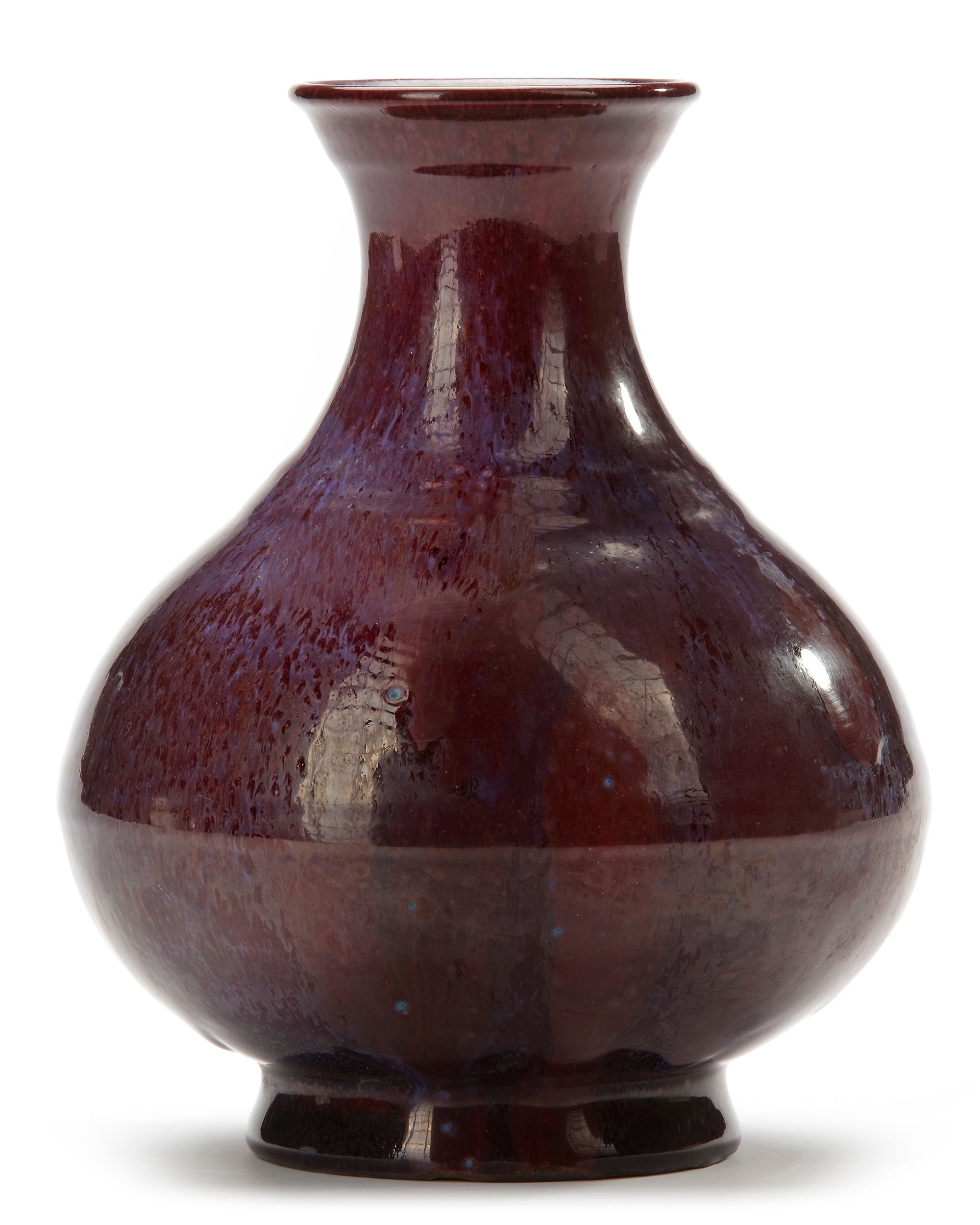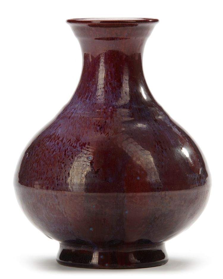 The pear-shaped vase is decorated to the shoulder and the body with raised ribs, flaring mouth and spreading foot. The vase is covered overall with a deep maroon glaze streaked with delicate pale blue. The base is covered in a pale straw-coloured glaze covering an apocryphal incised Yongzheng seal mark.