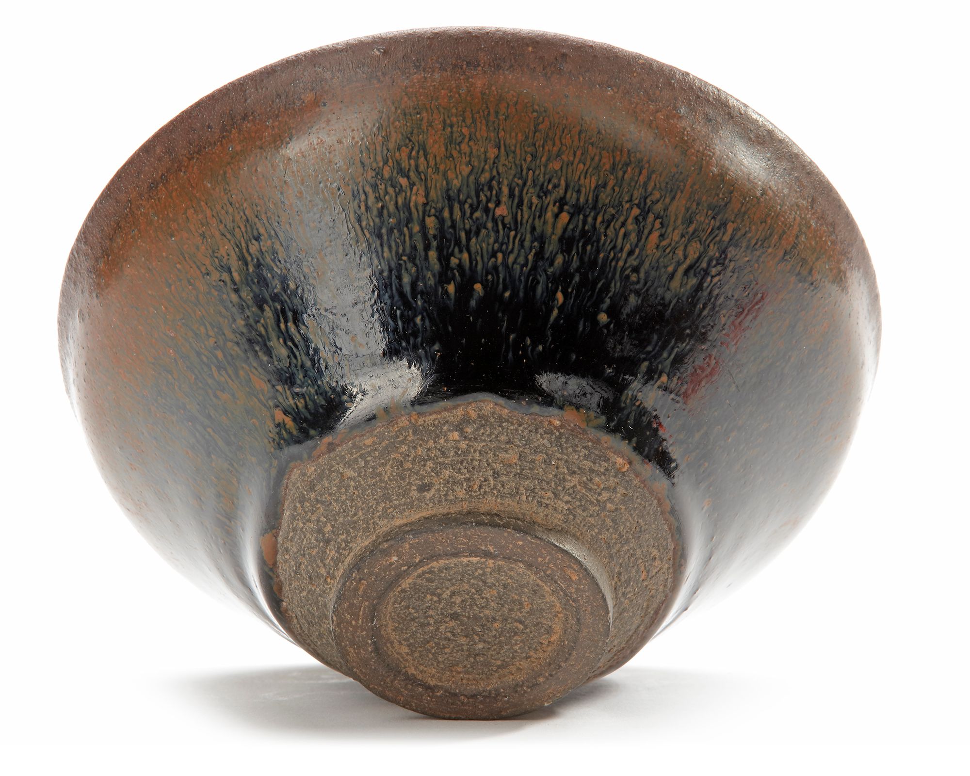The bowl is sturdily potted and covered overall with a lustrous blackish-brown glaze finely streaked with russet 'hare's fur'pooling in an irregular line above the foot exposing the buff body.