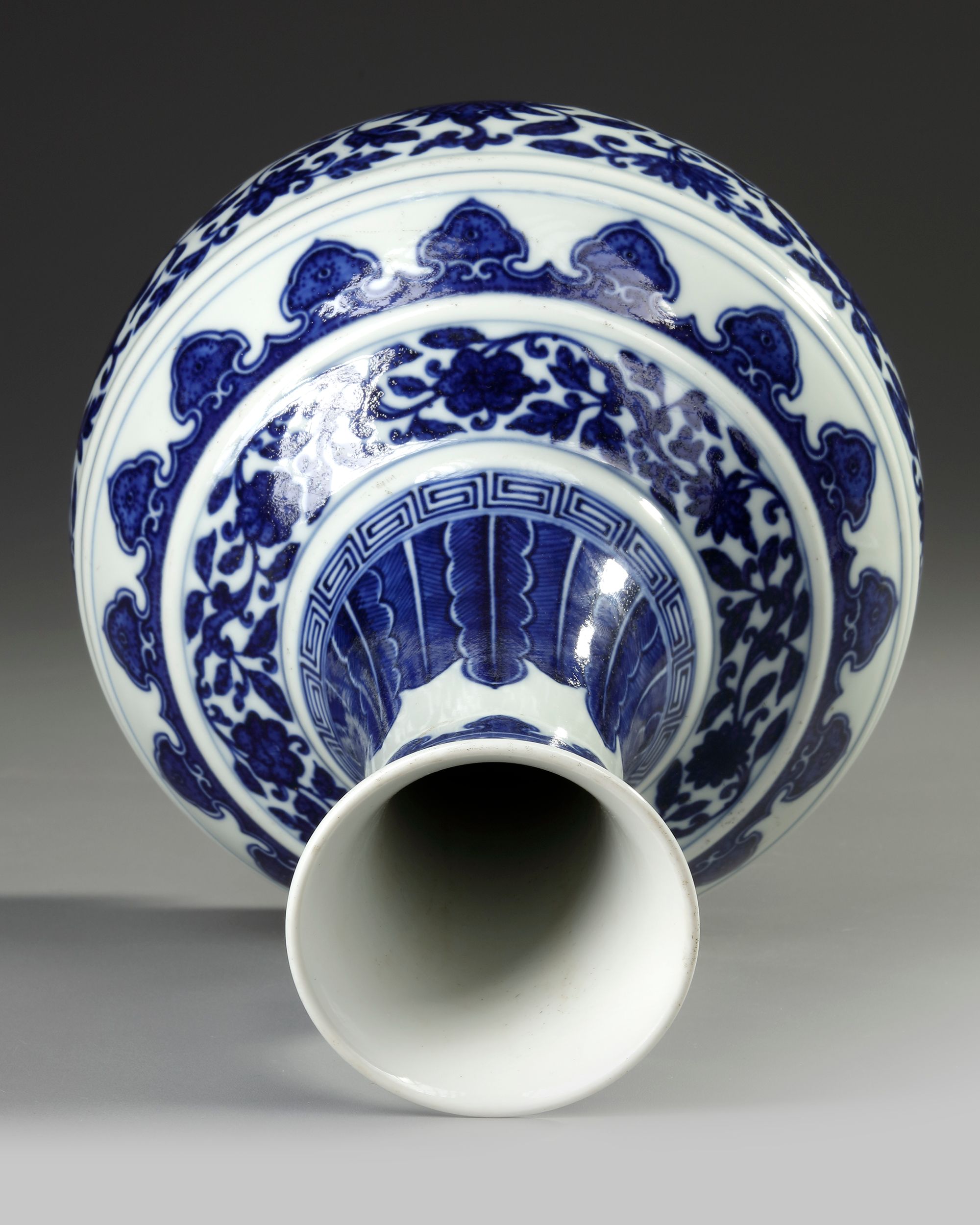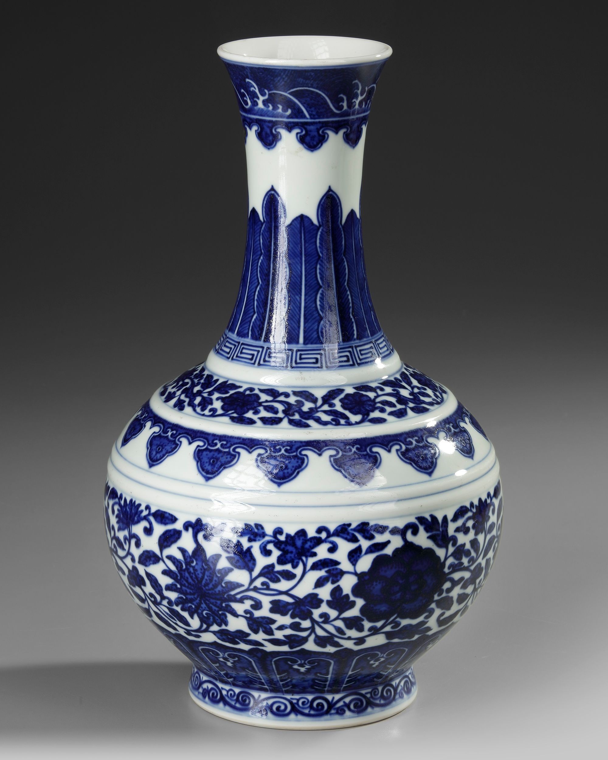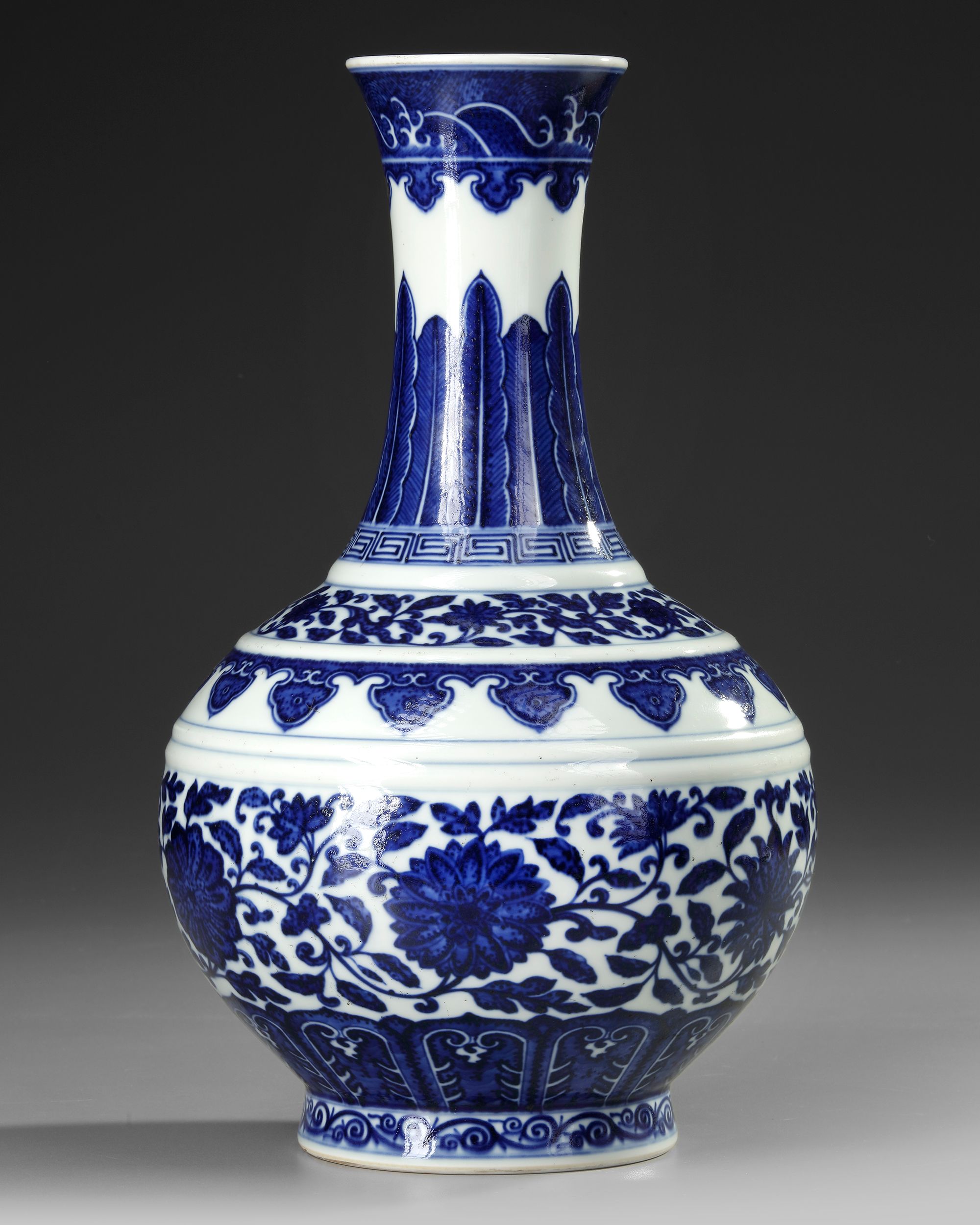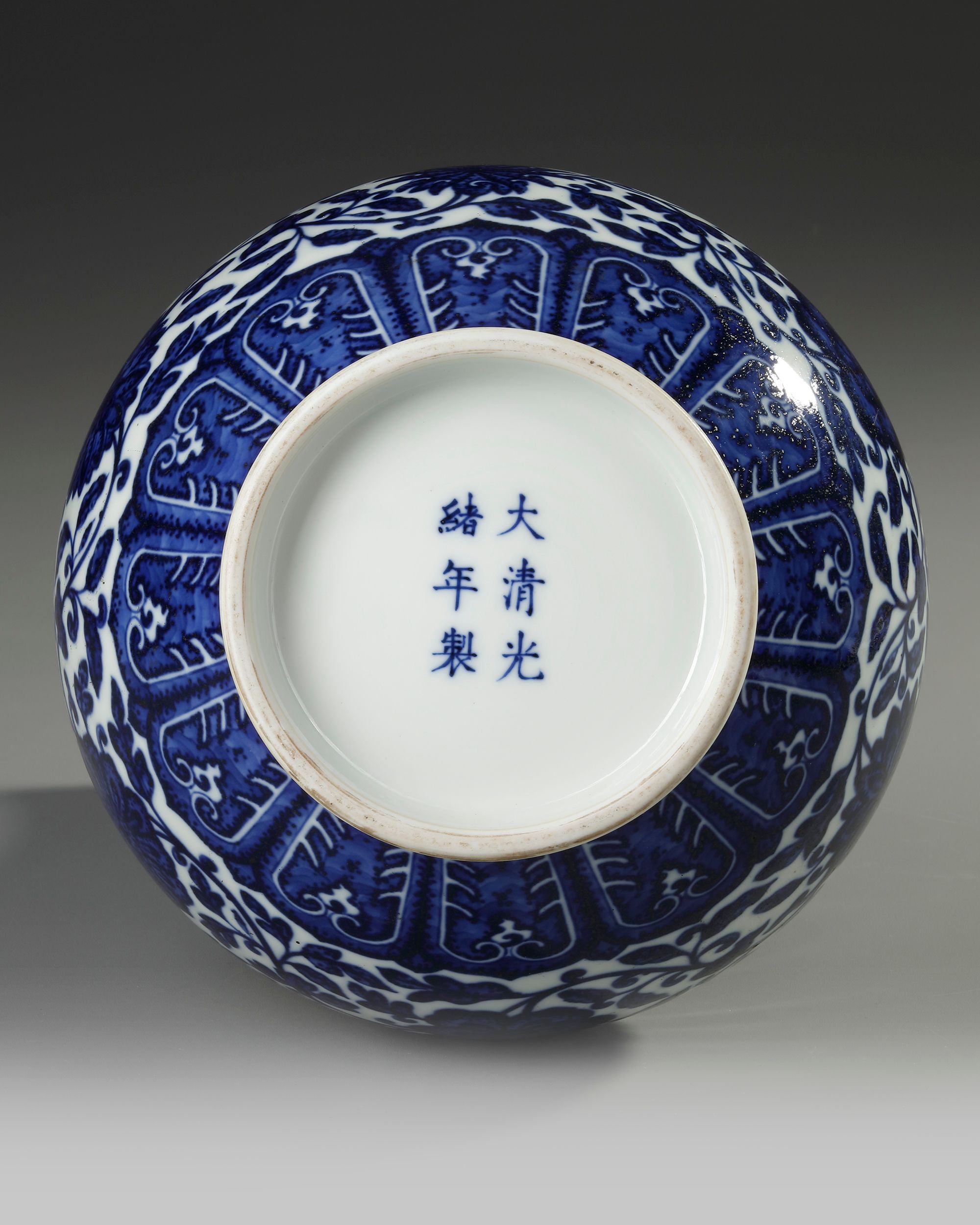 The vase is decorated with a broad band of composite foliate scroll above a petal-lappet band on the globular body, and bands of pendent ruyi heads and further foliate scroll on the shoulder, all separated by plain rib borders below a band of upright leaves rising from a key-fret border towards a further ruyi band and wave border on the neck. The bottom with a Chinese Guangxu six character mark.