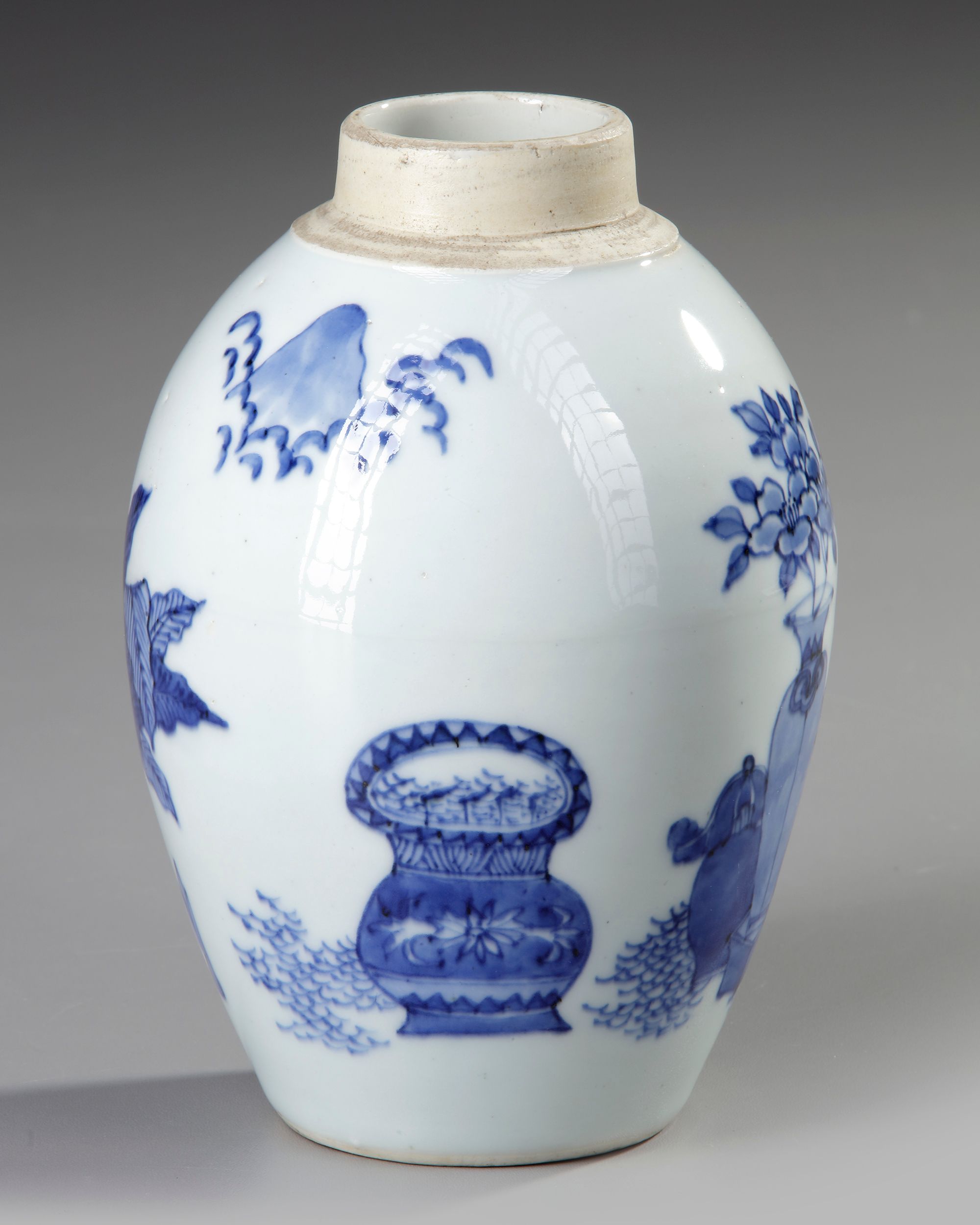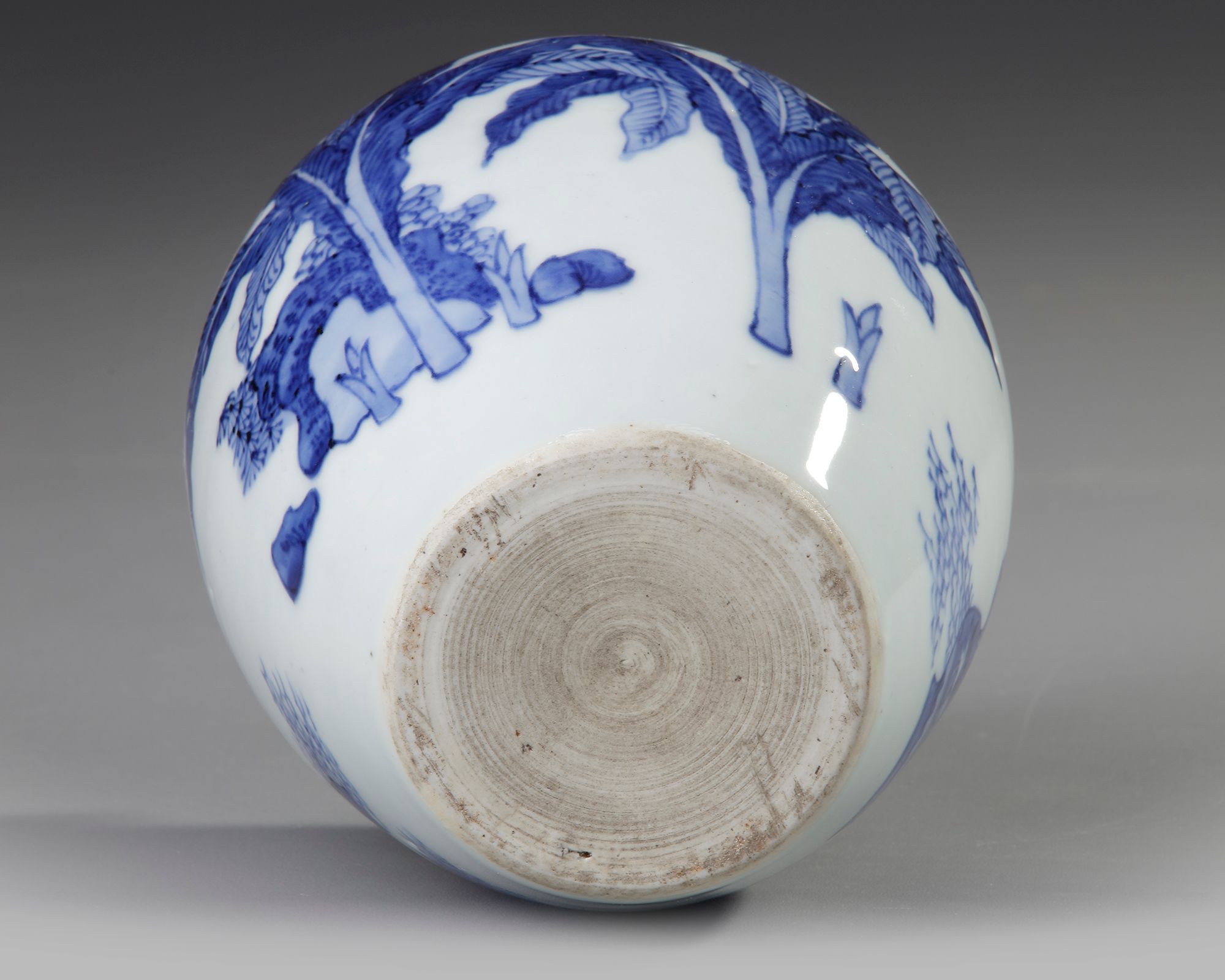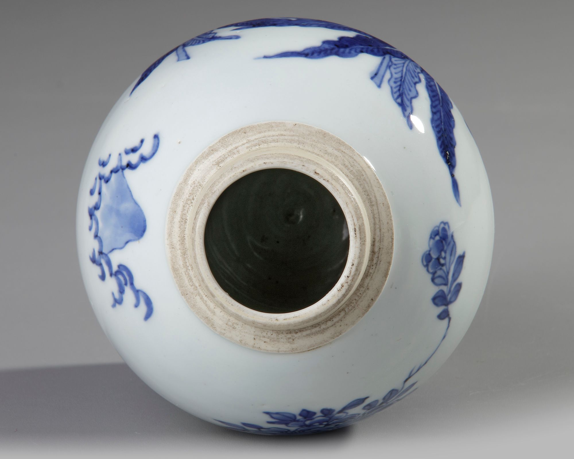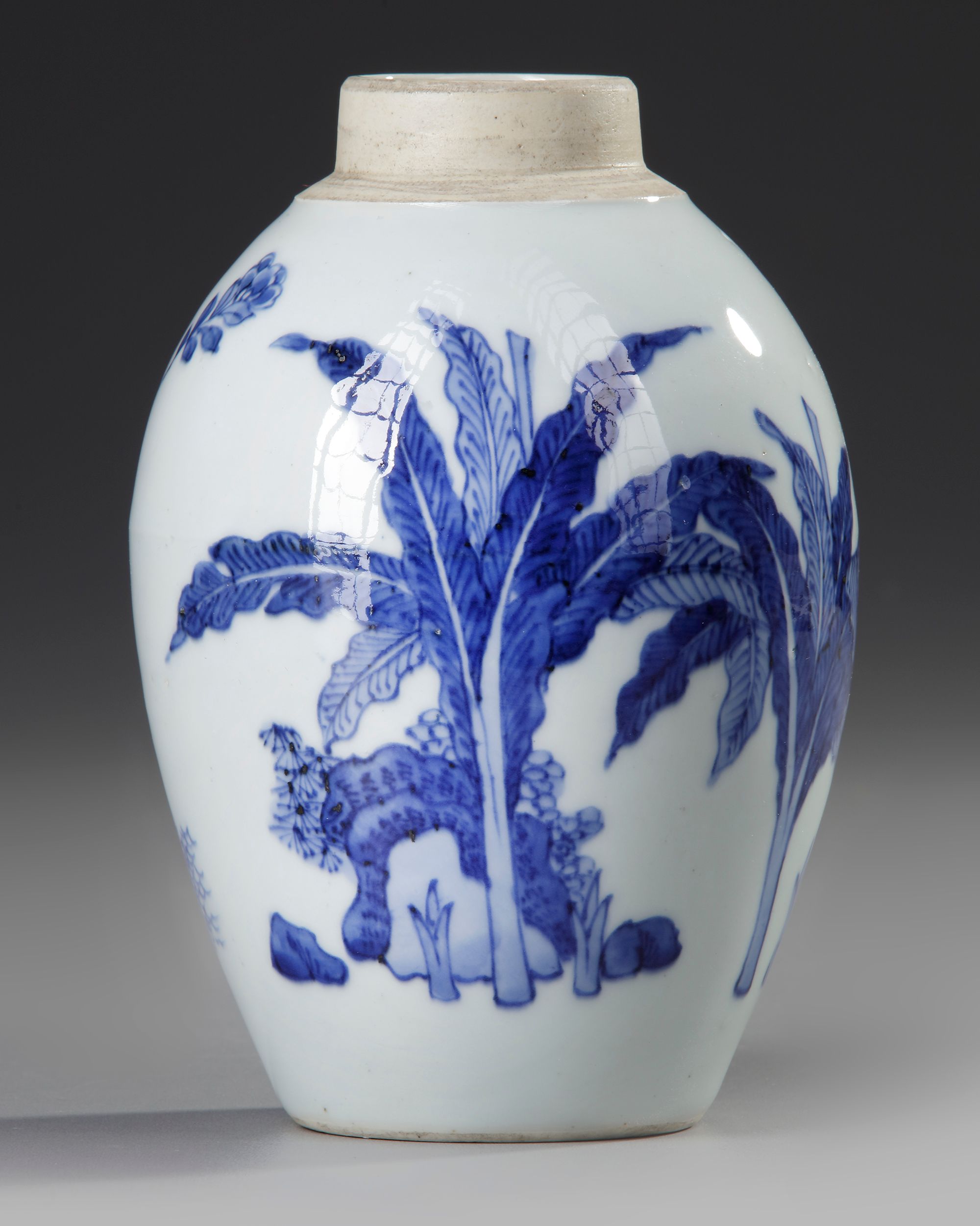 A Chinese porcelain jar, decorated in underglaze blue with flowers in a vase, a small mountain top with clouds and large banana trees. Height: 17 cm.