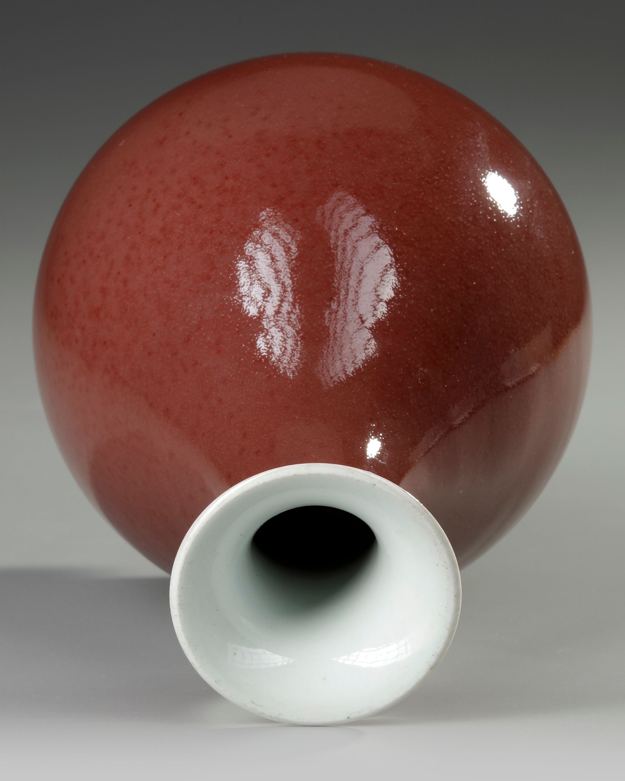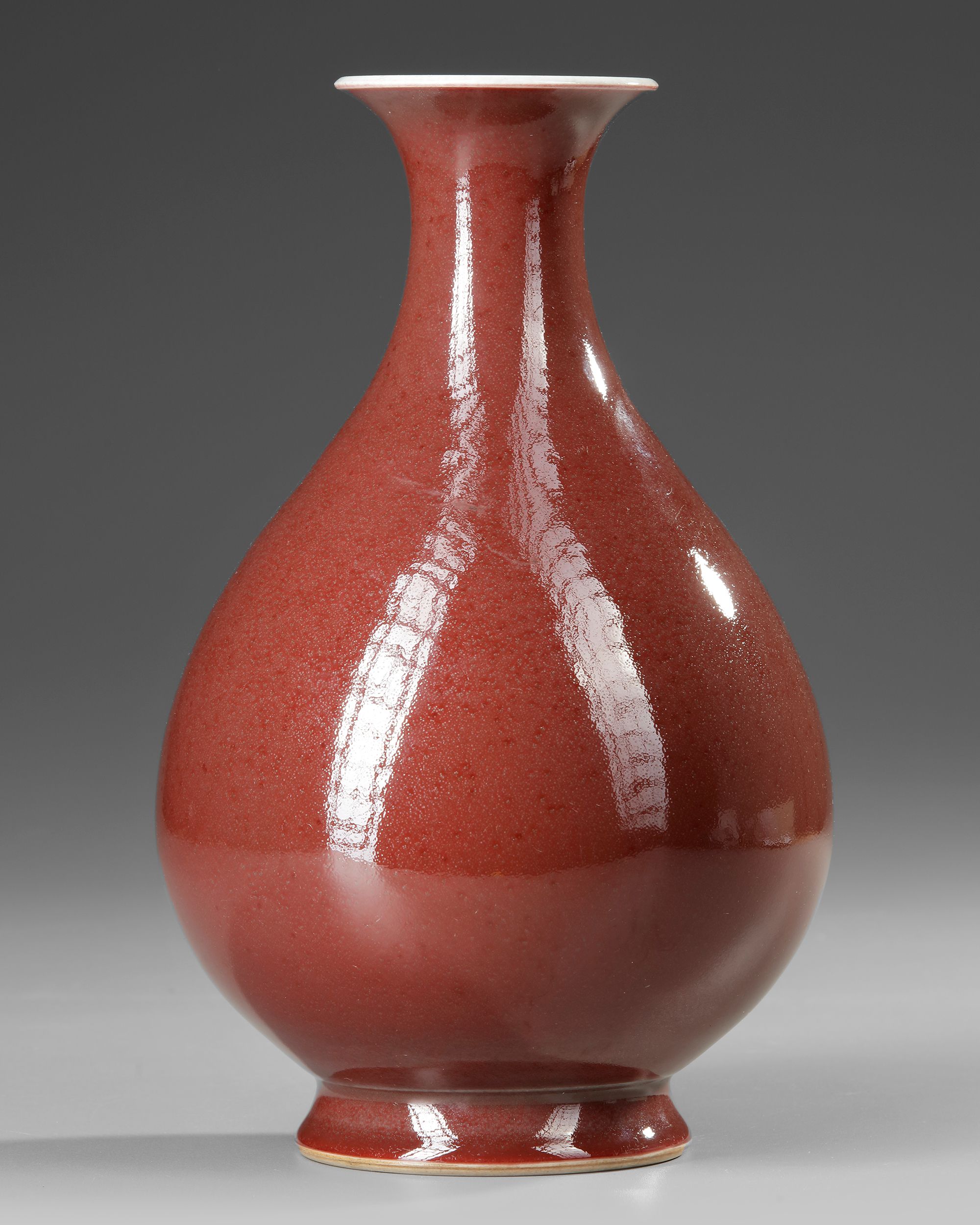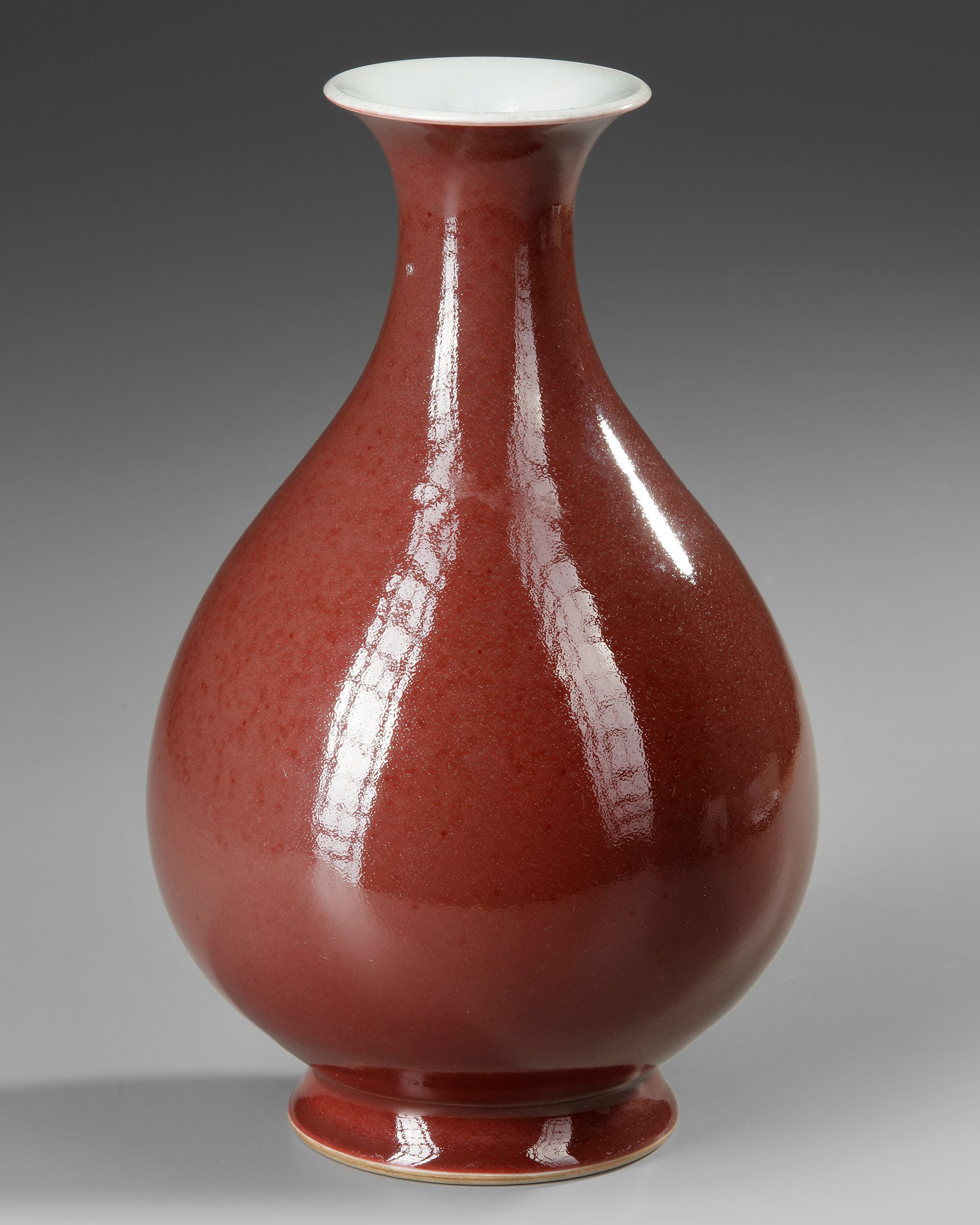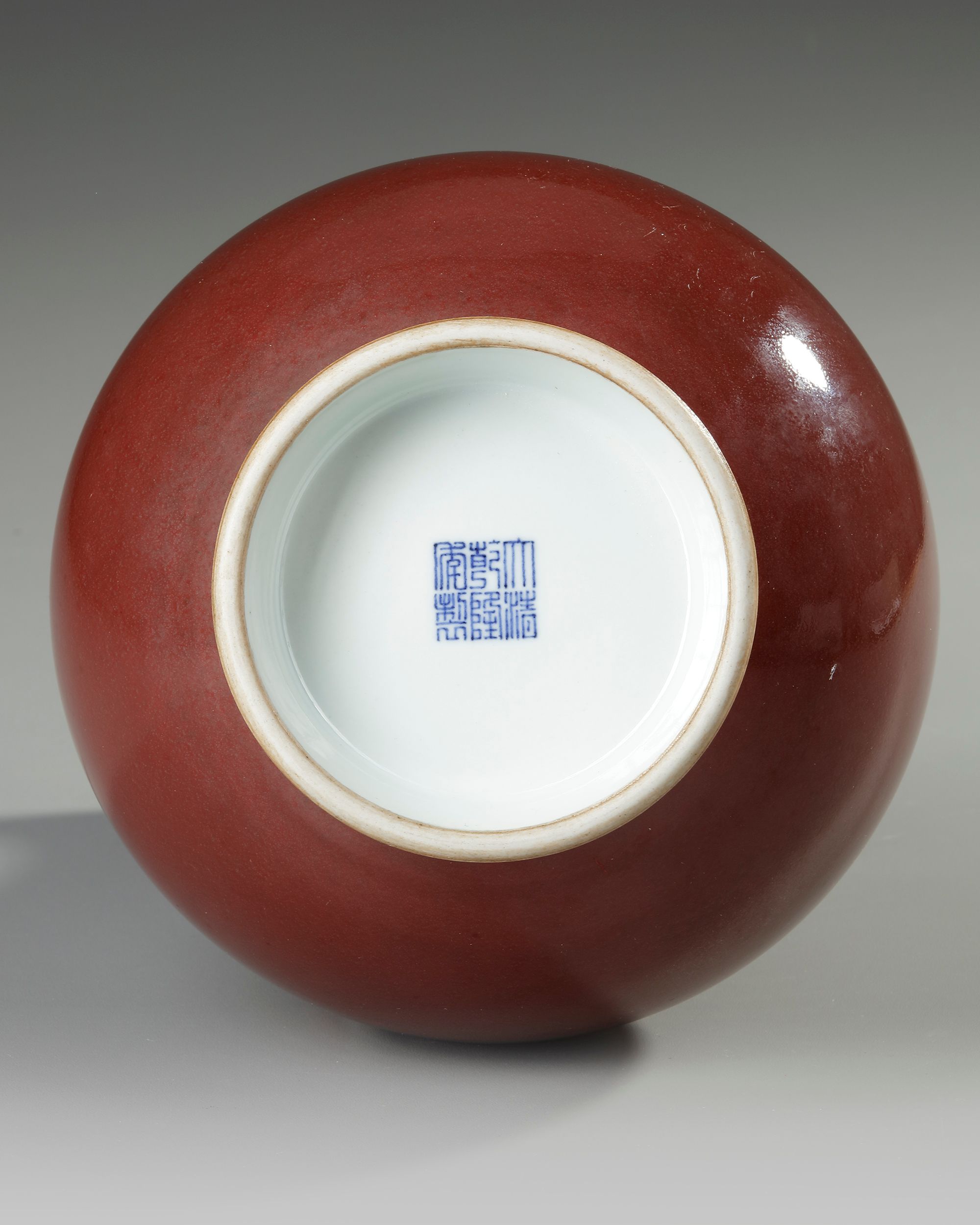The well-rounded body is potted with a narrow neck rising to a flaring mouth and supported on a short spreading foot ring. The vase is covered in a glaze of dark cherry-red colour. The interior and base are covered with a transparent glaze. The bottom with a Chinese Qianlong seal mark.