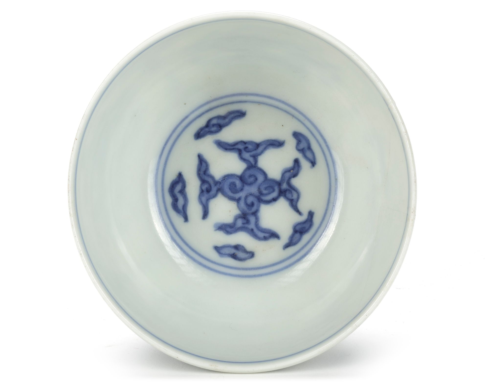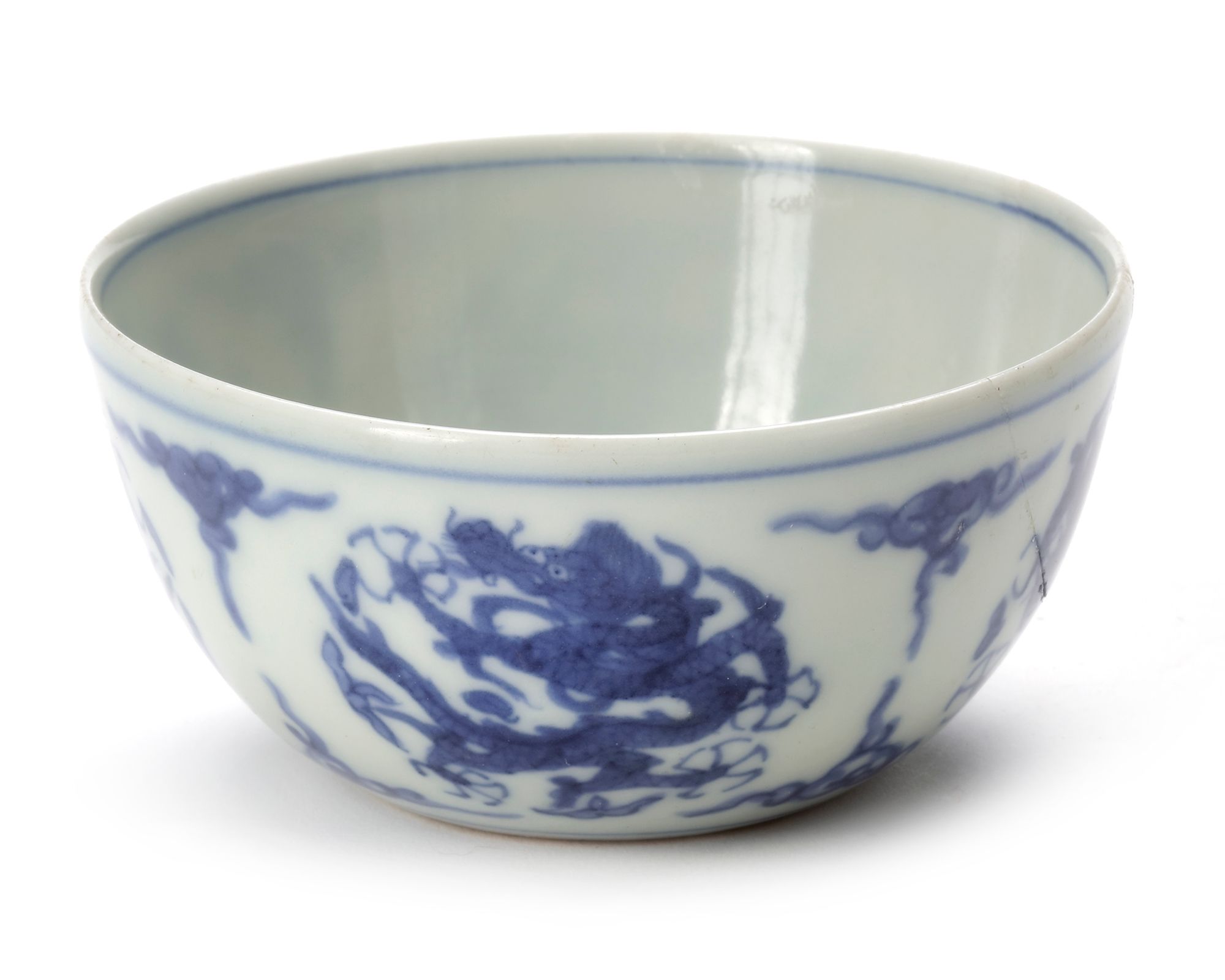 A Chinese Porcelain cup decorated in cobalt blue with roundels of five-clawed dragons amongst clouds.