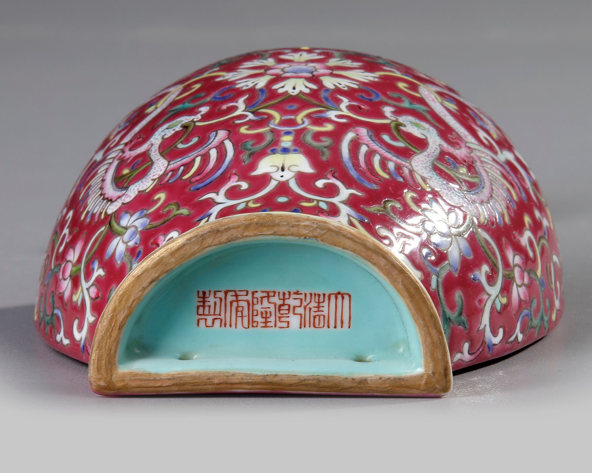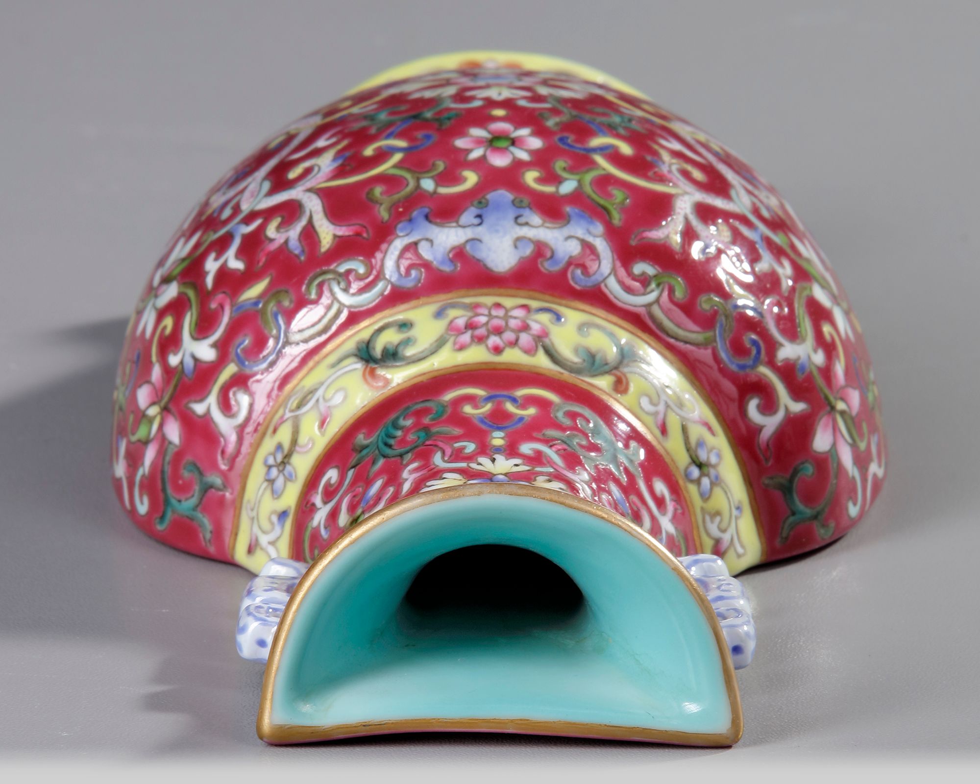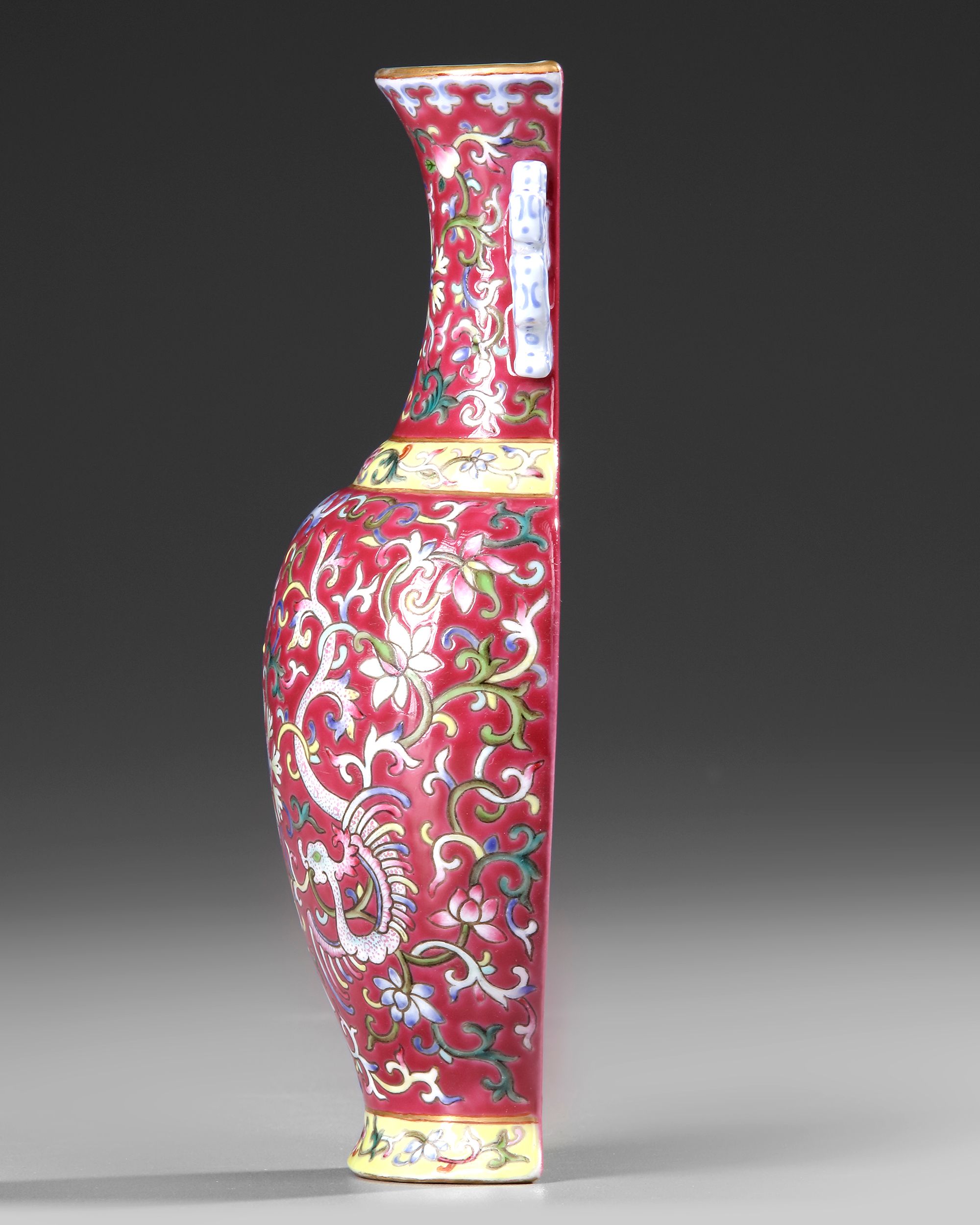 A Chinese porcelain wall vase, stylized with two dragon shaped handles, decorated with a large lotus blossoms borne on foliate scrolls incorporating a Fu bat and flanked by two leaping phoenix birds. Set between bands of floral sprays on a yellow ground to the shoulder and the base, the neck is similarily decorated, all on a ruby ground. The flat side pierced with four holes and a notch for hanging, the interior covered with turquoise enamel.