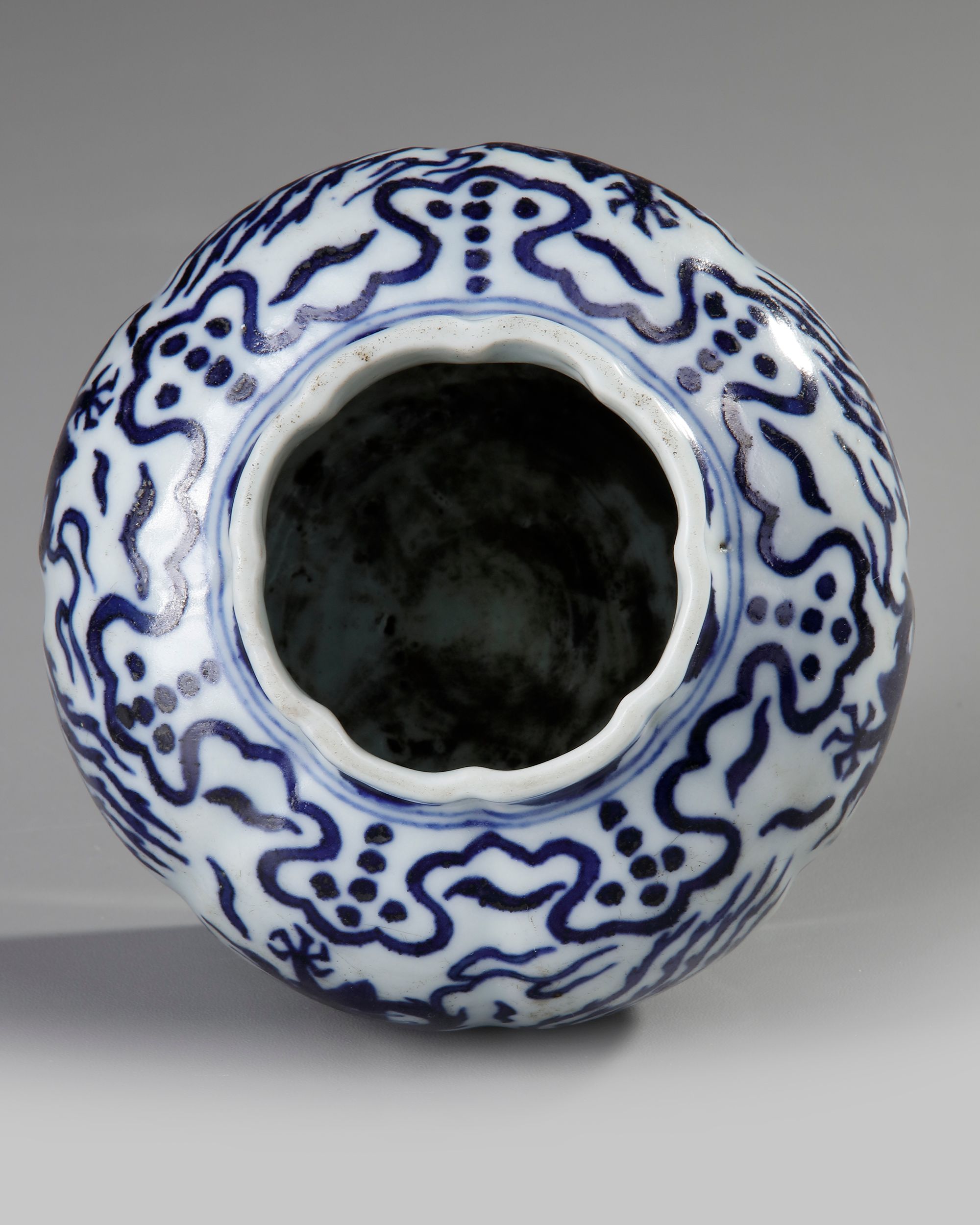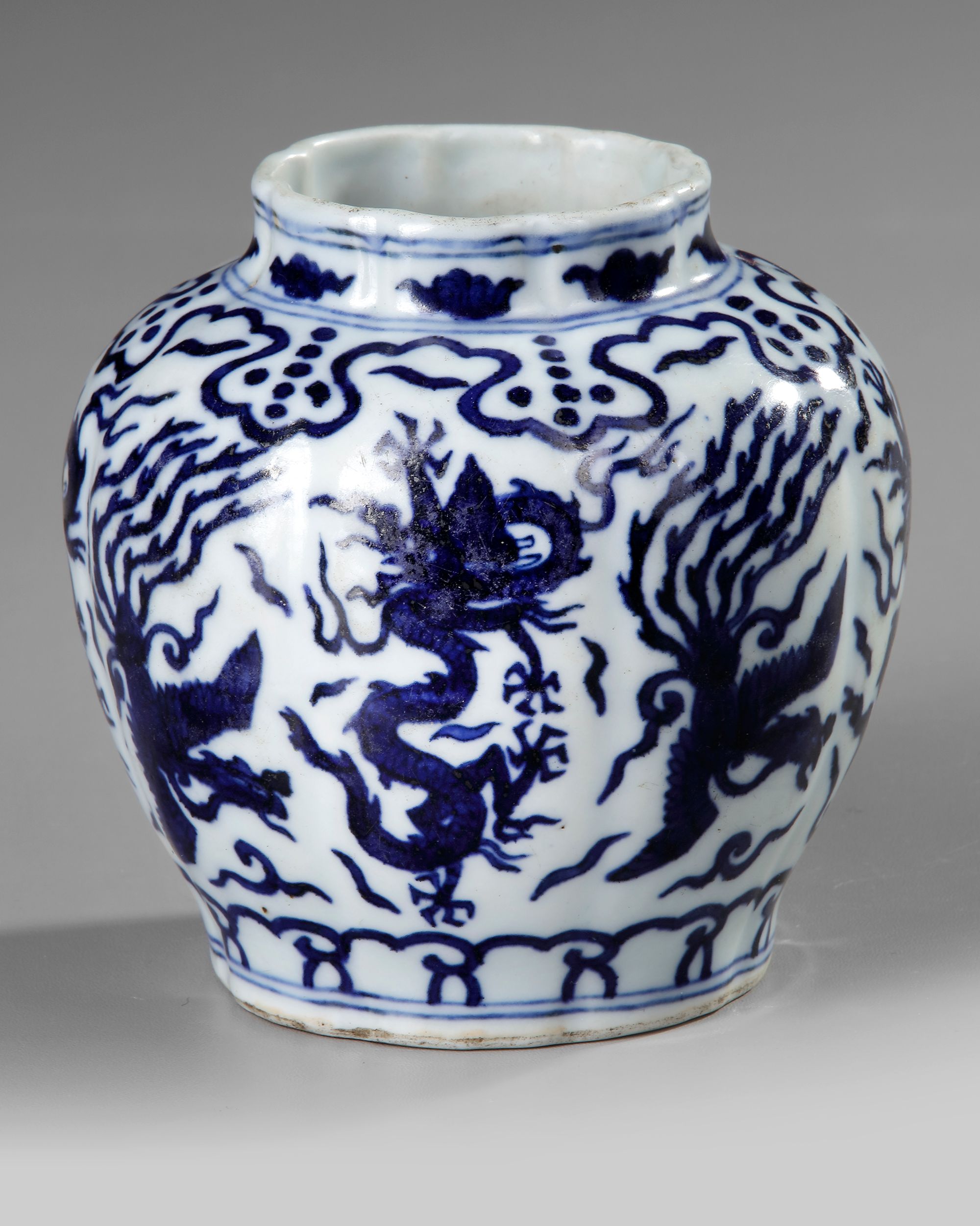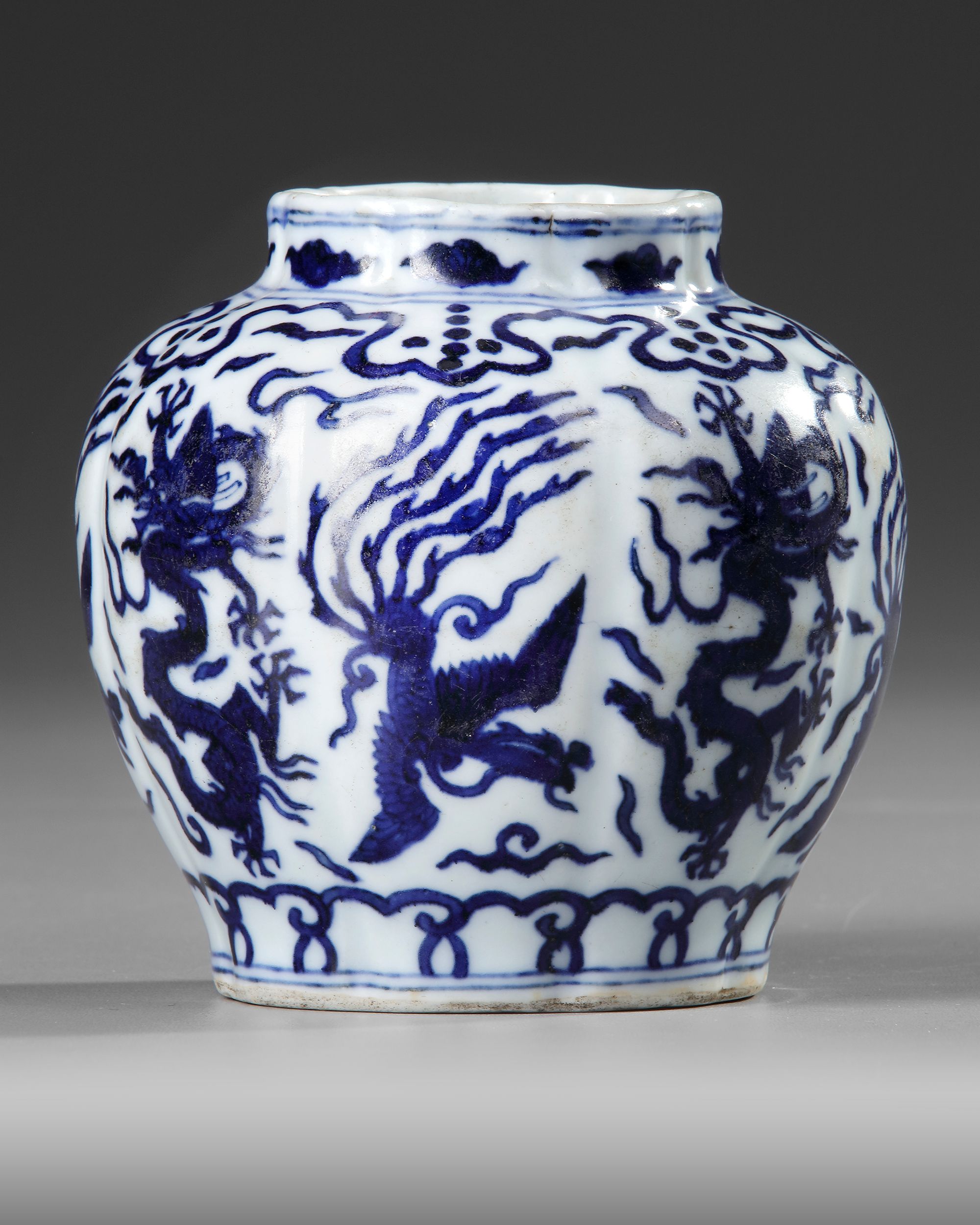 A small Chinese porcelain lobed vase, each lob is decorated in cobalt blue with a striding dragon or phoenix bird amongst clouds, set between a band of ruyi heads to the shoulder and fiolate scrolls to the base. The bottom with a Chinese Wanli six character mark.