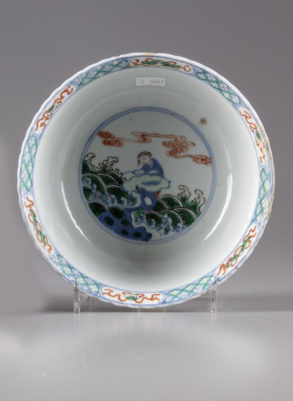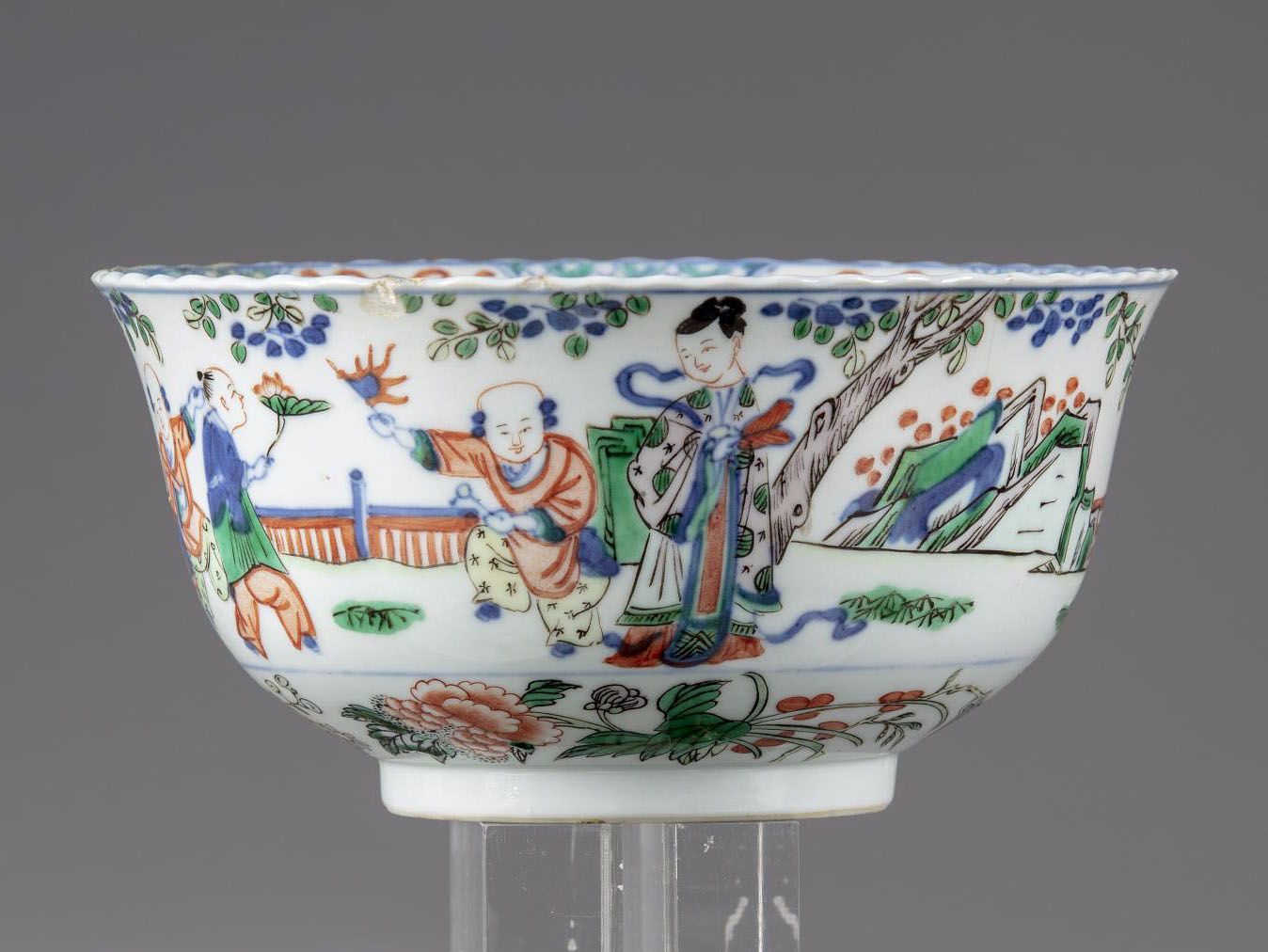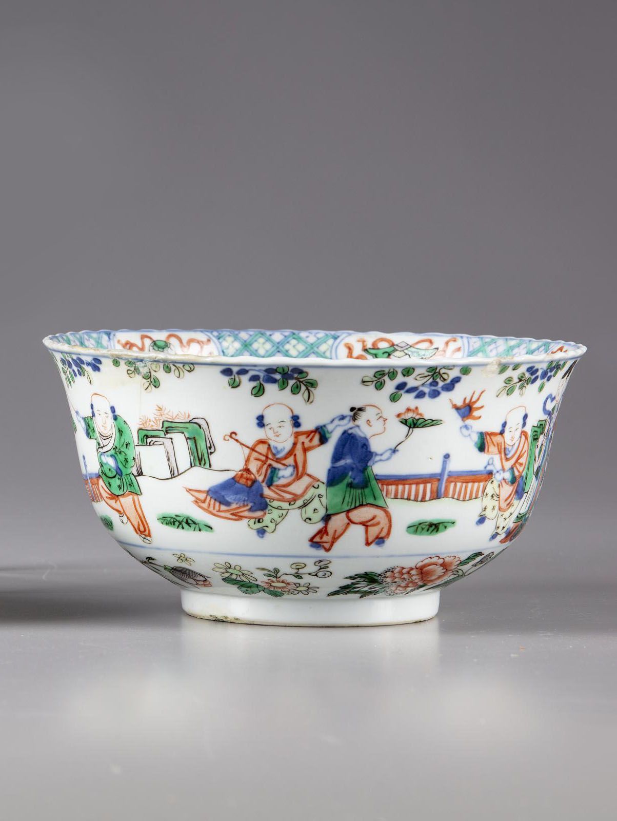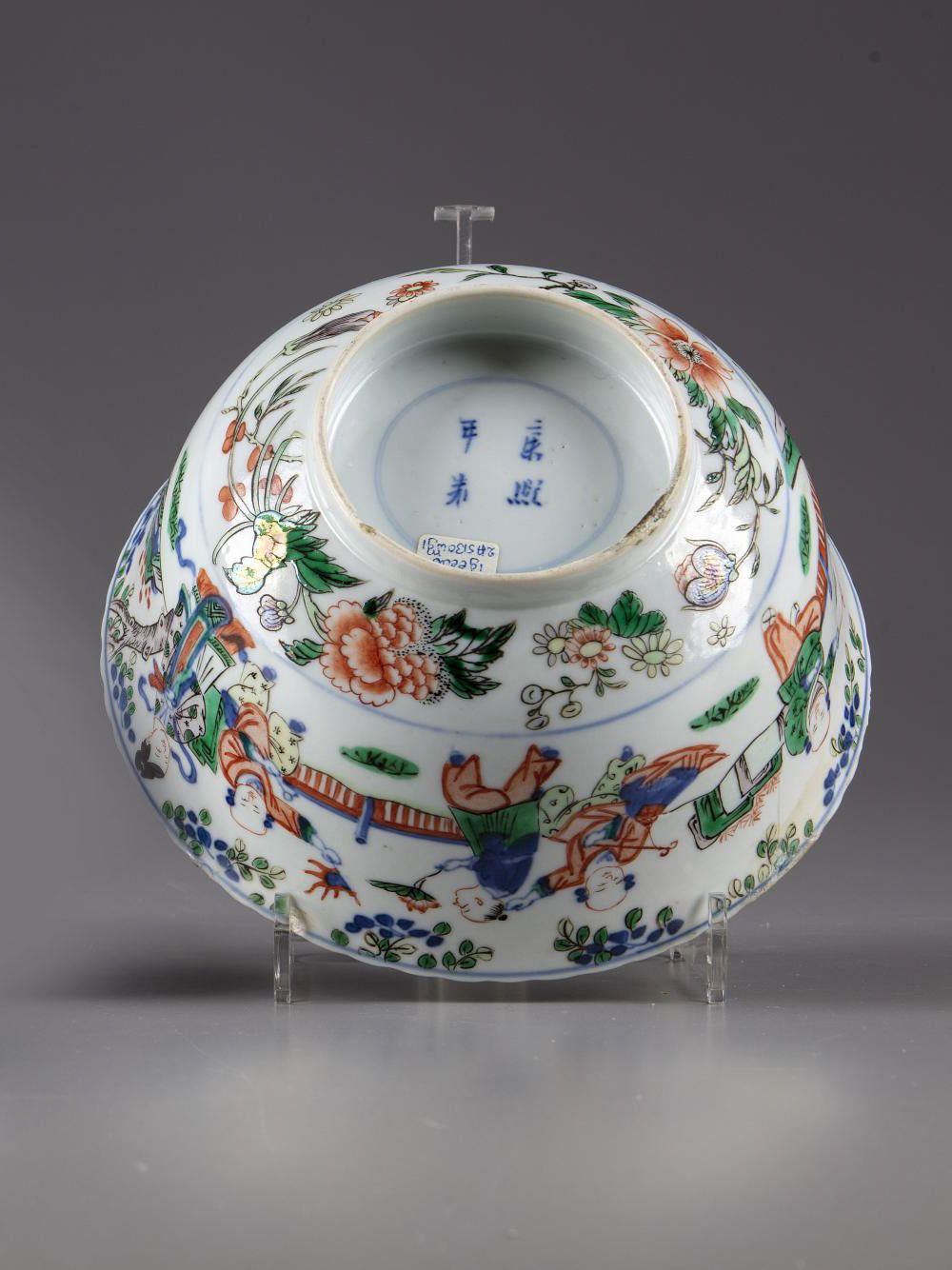 A famille verte bowl, decorated with a lady and boys at play in a fenced garden. Height: 9 cm. Diameter: 18 cm.