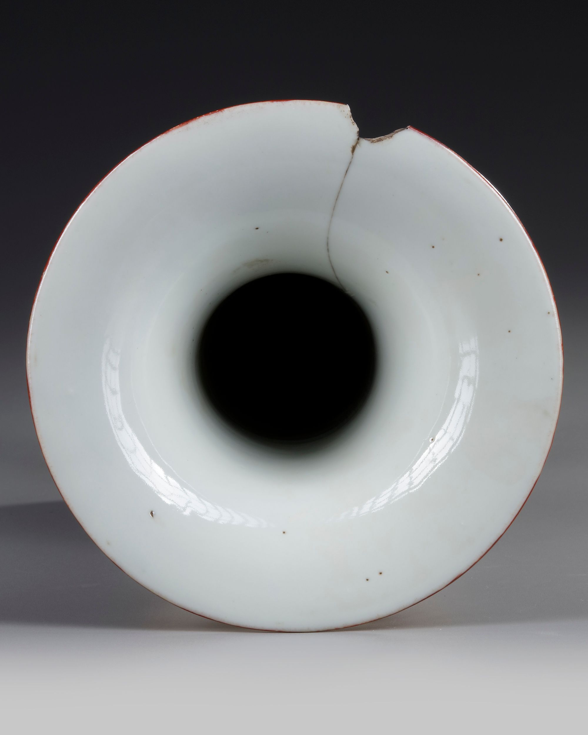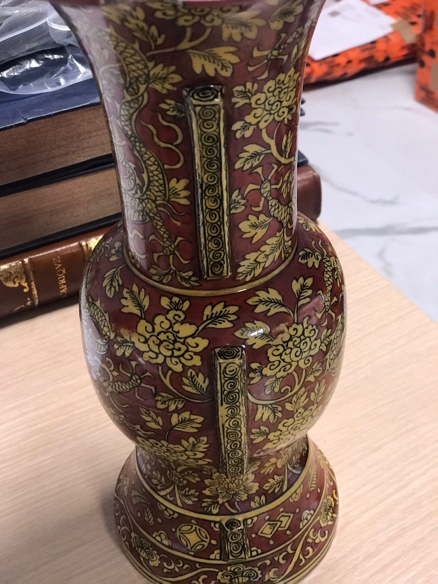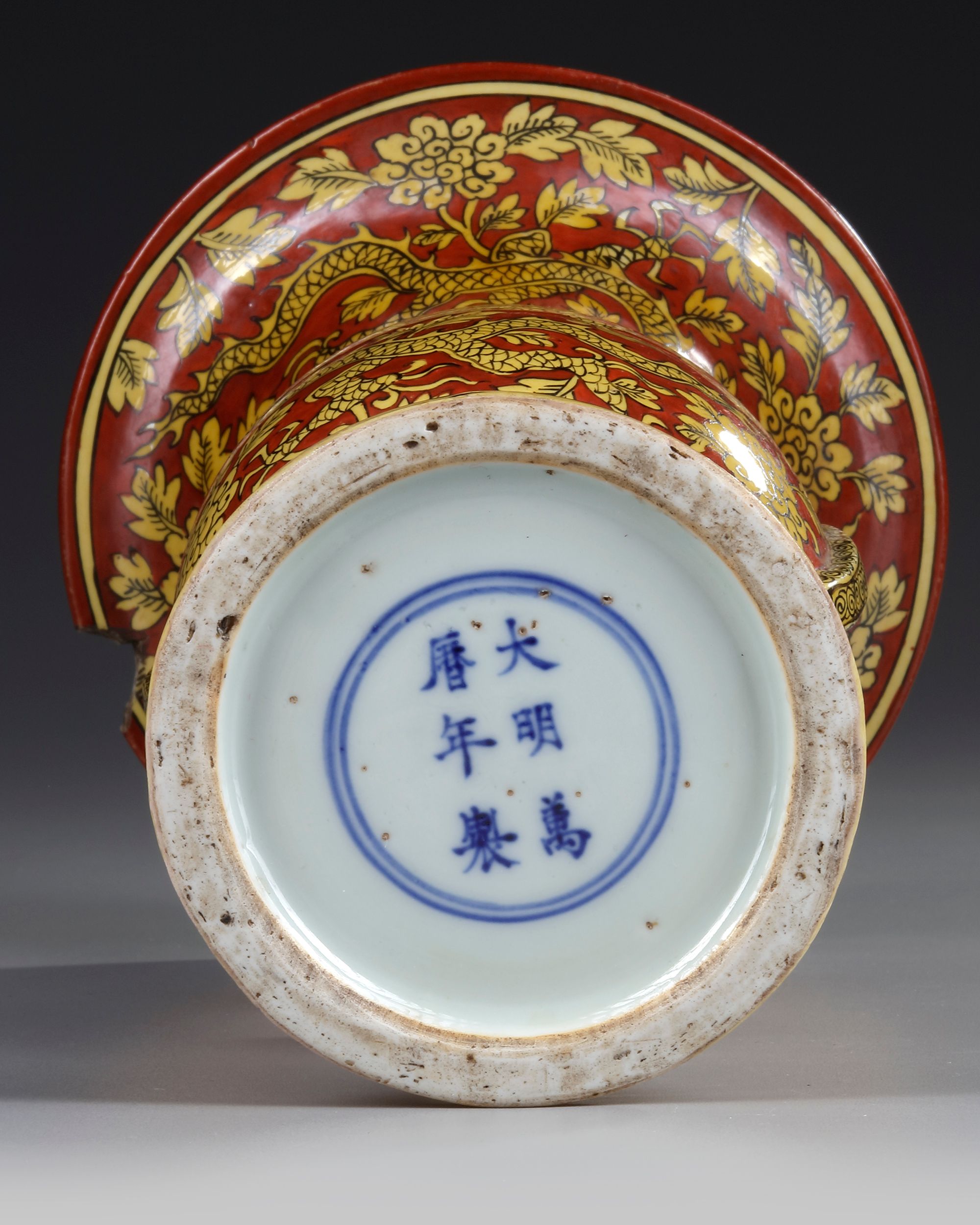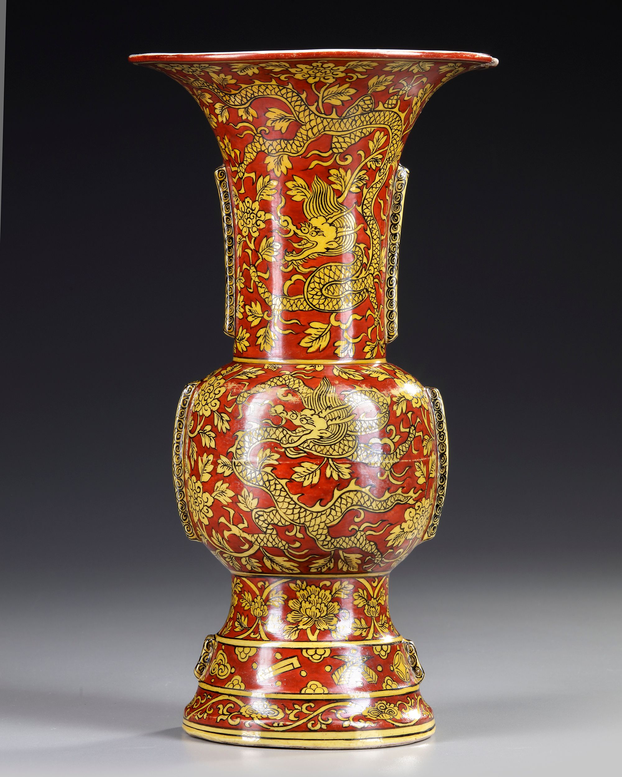 A Chinese porcelain Gu beaker vase, of typical waisted cylindrical form, its central section covered with a transparent and yellow glaze and painted in black with two dragons amongst peony blossoming flowers and foliage, all similarly repeated below on the trumpet neck, the spreading foot with flower heads amongst foliage and Daoist emblems. The bottom with a Chinese Wanli six character mark.