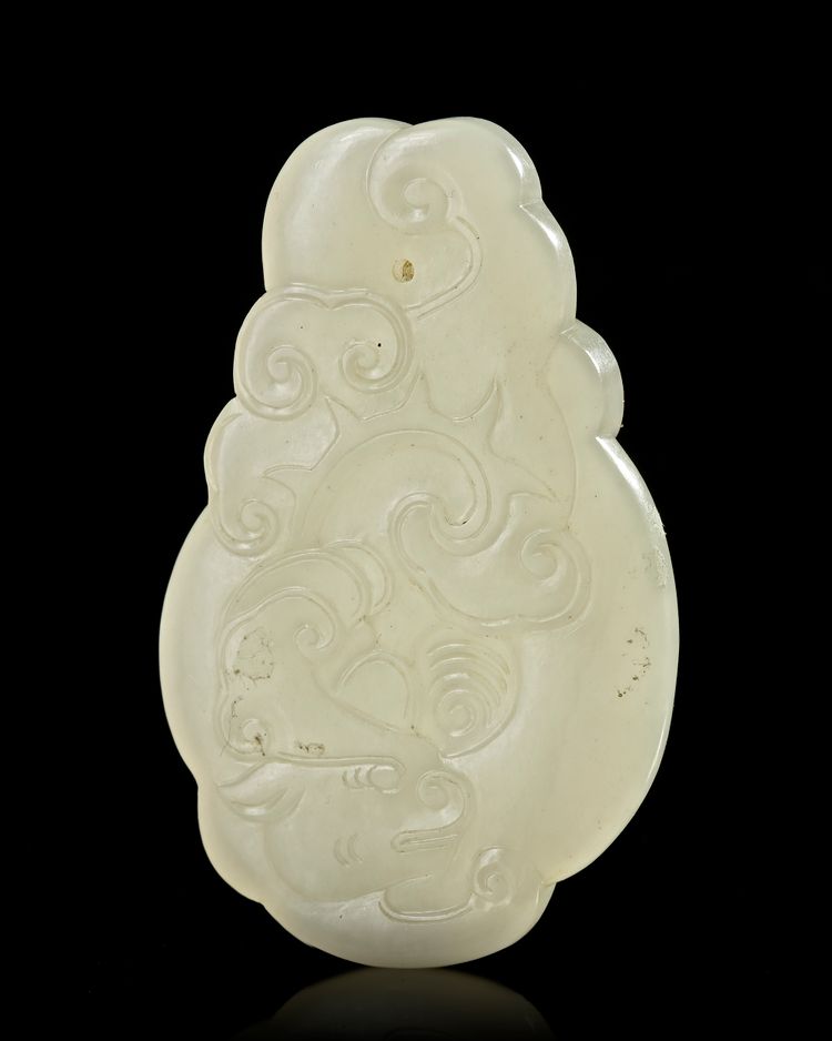 The flattened, tapering pendant is carved in low relief on both sides with chilongs, the stone is of even white color. Length: 6.3 cm.