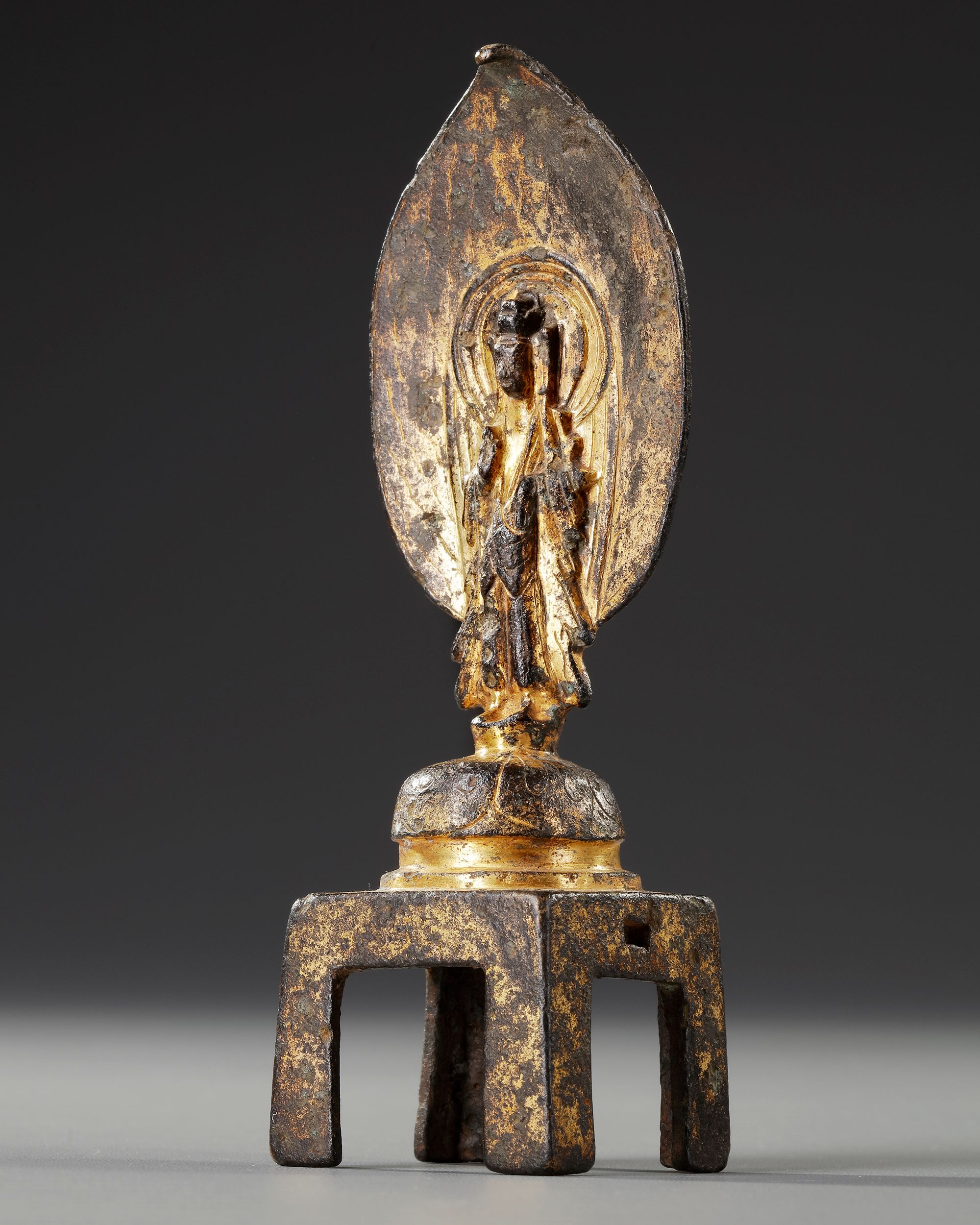 The slender figure is shown standing with right hand raised in abhaya mudra and left hand pendent, standing in front of the flaming mandorla on top of the tall base with four splayed legs.