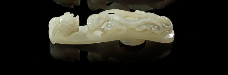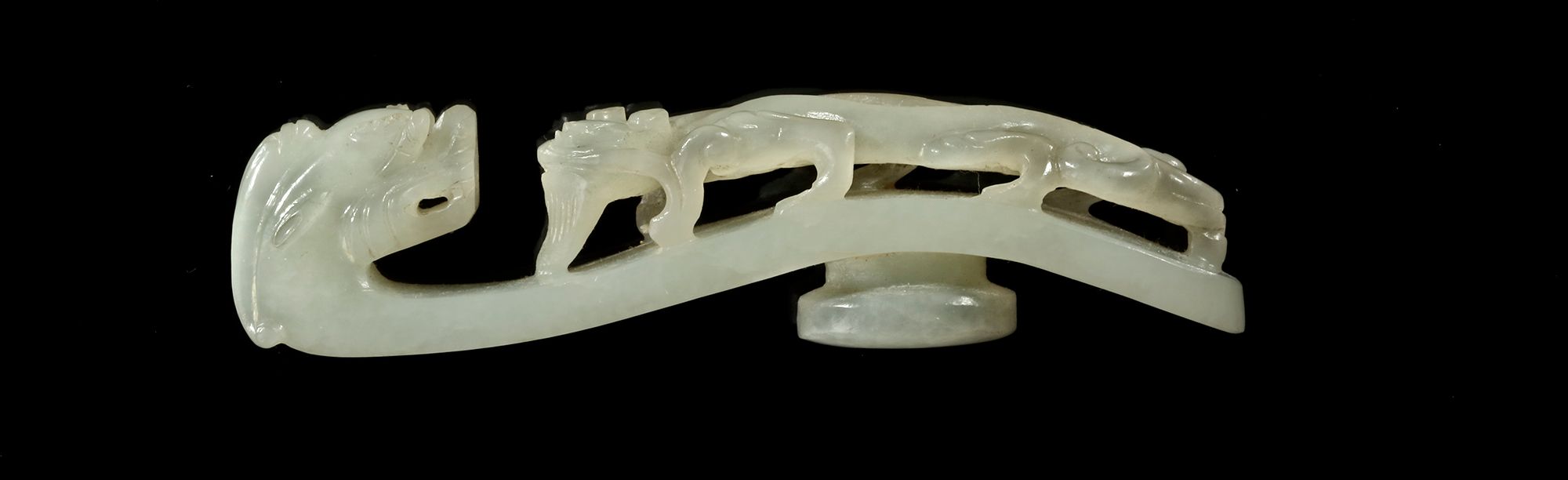 The top carved in openwork and undercut with a chilong crawling towards the dragon head hook, with circular stud on the reverse. 9.5 cm.
