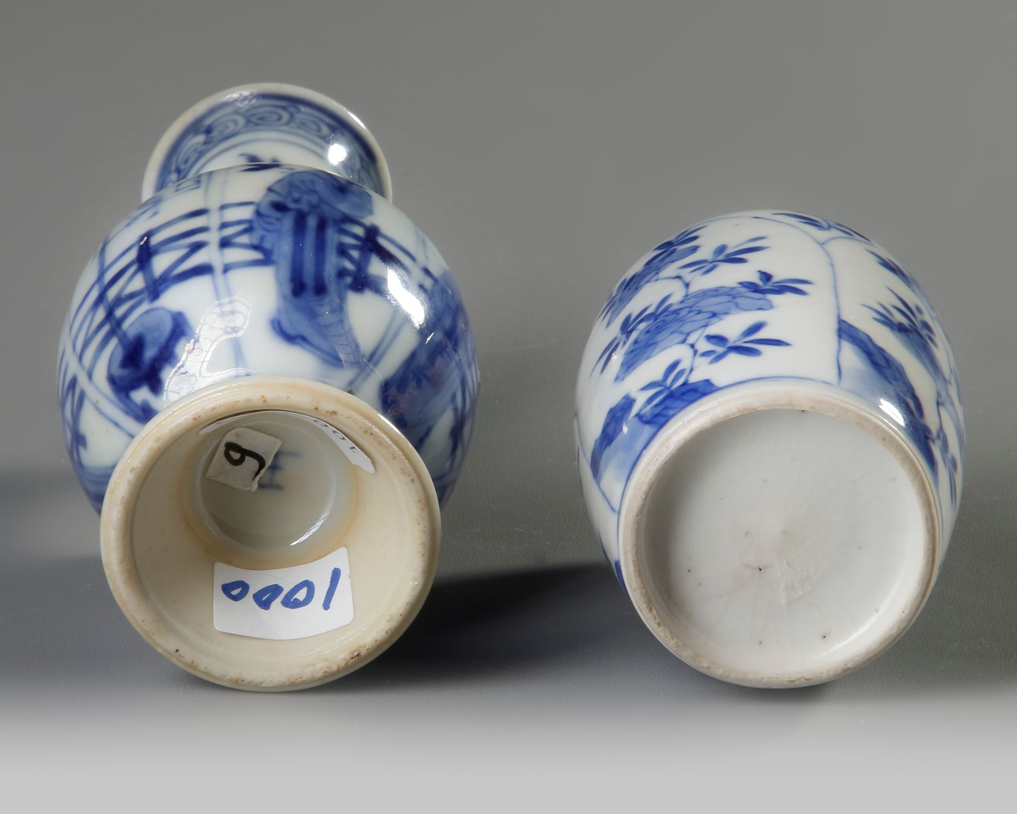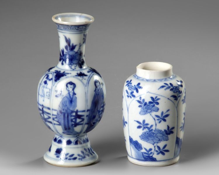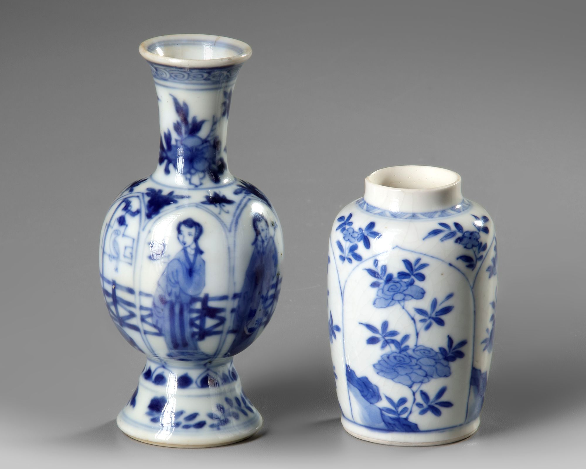 A small Chinese vase with flaring neck decorated with panels enclosing elegant ladies in a fenced garden, Height: 12 cm.