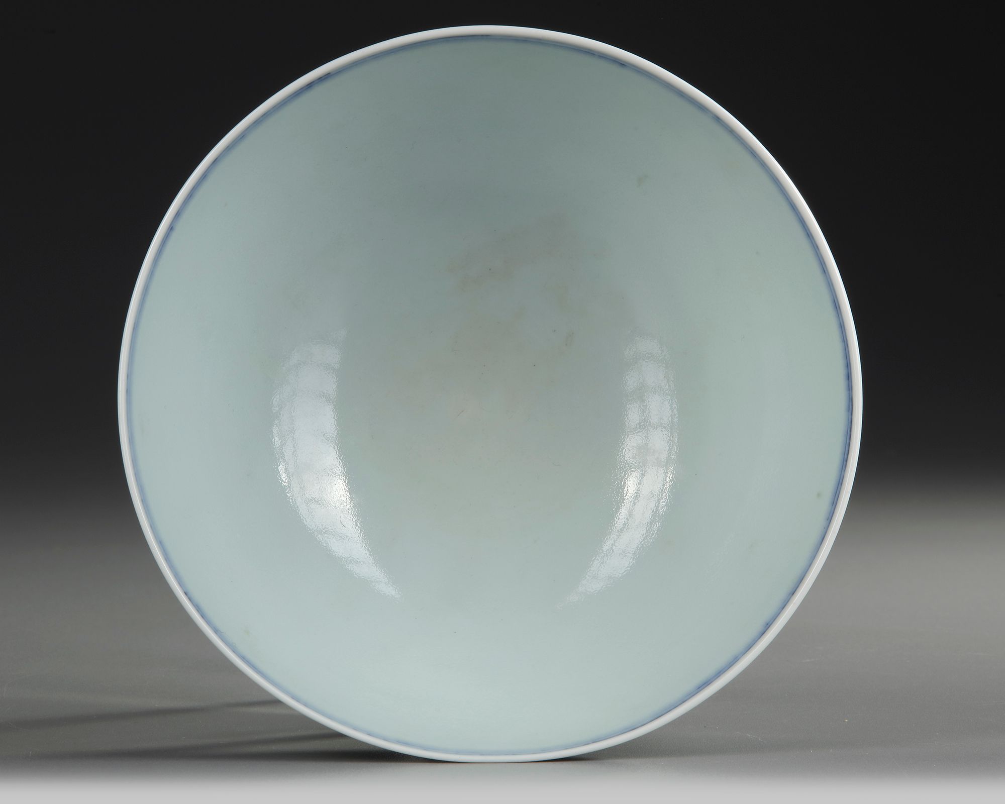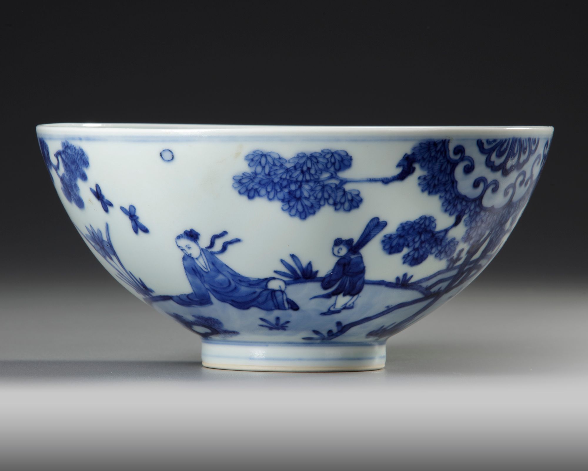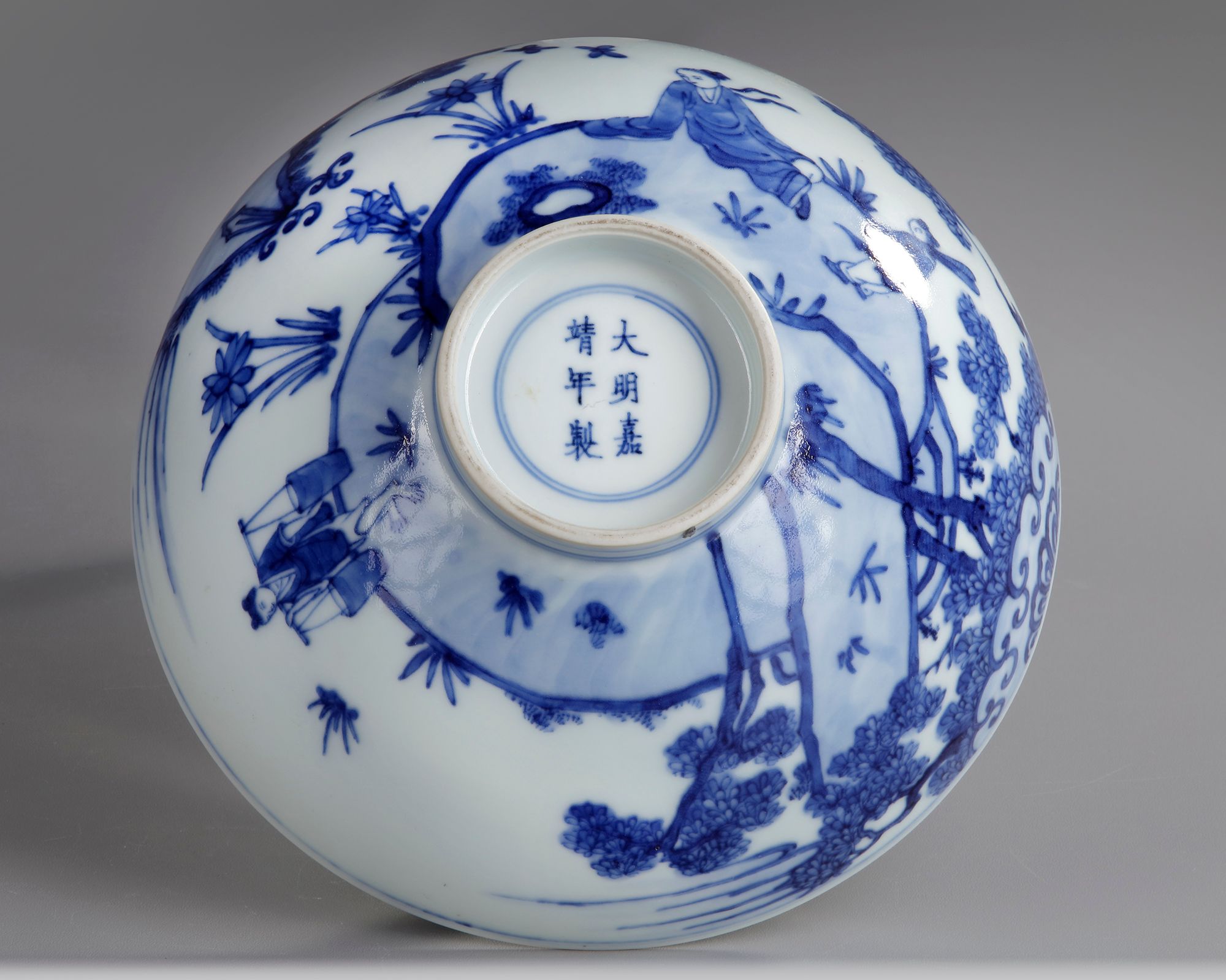 A Chinese porcelain bowl standing on a small foot decorated in cobalt blue with a scholar and his servants in a landscape. The bottom with a Chinese Jiajing six character mark.