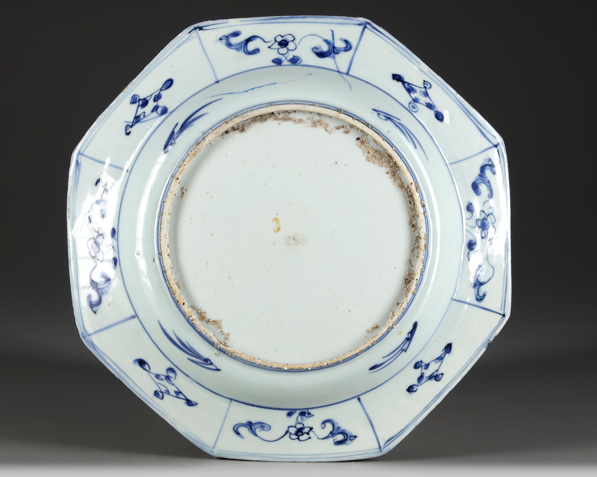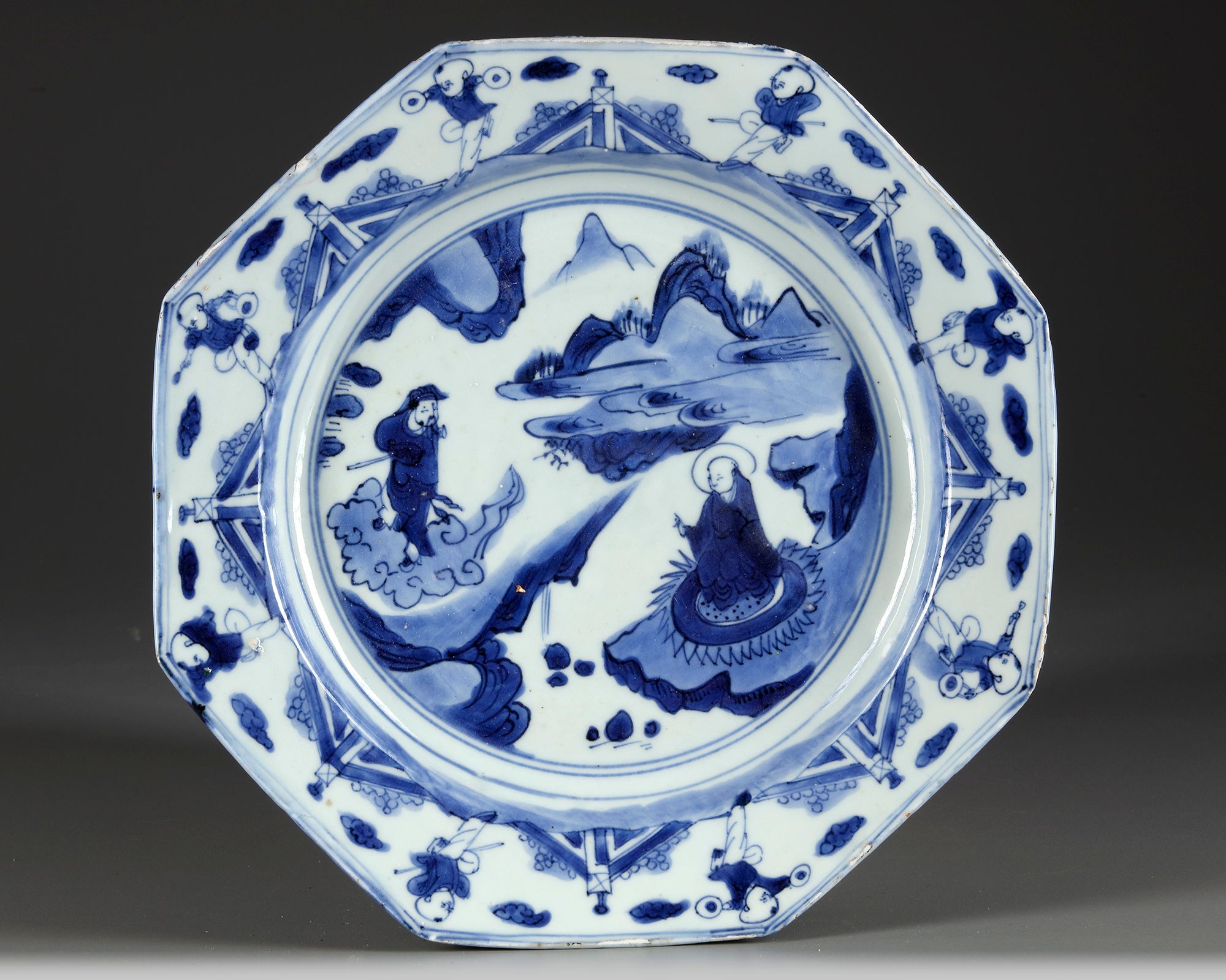 A Chinese porcelain octagonal dish, finely decorated in cobalt blue with a seated Buddha on a lotus stand and an Immortal in clouds in a mountainous landscape. The rim with a child at play at each corner in a fenced garden.