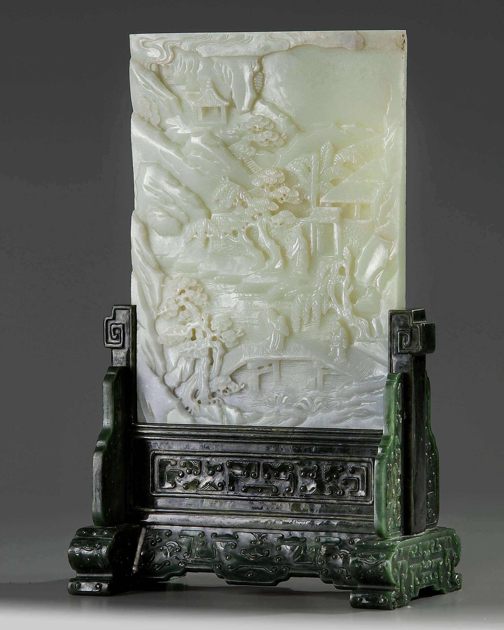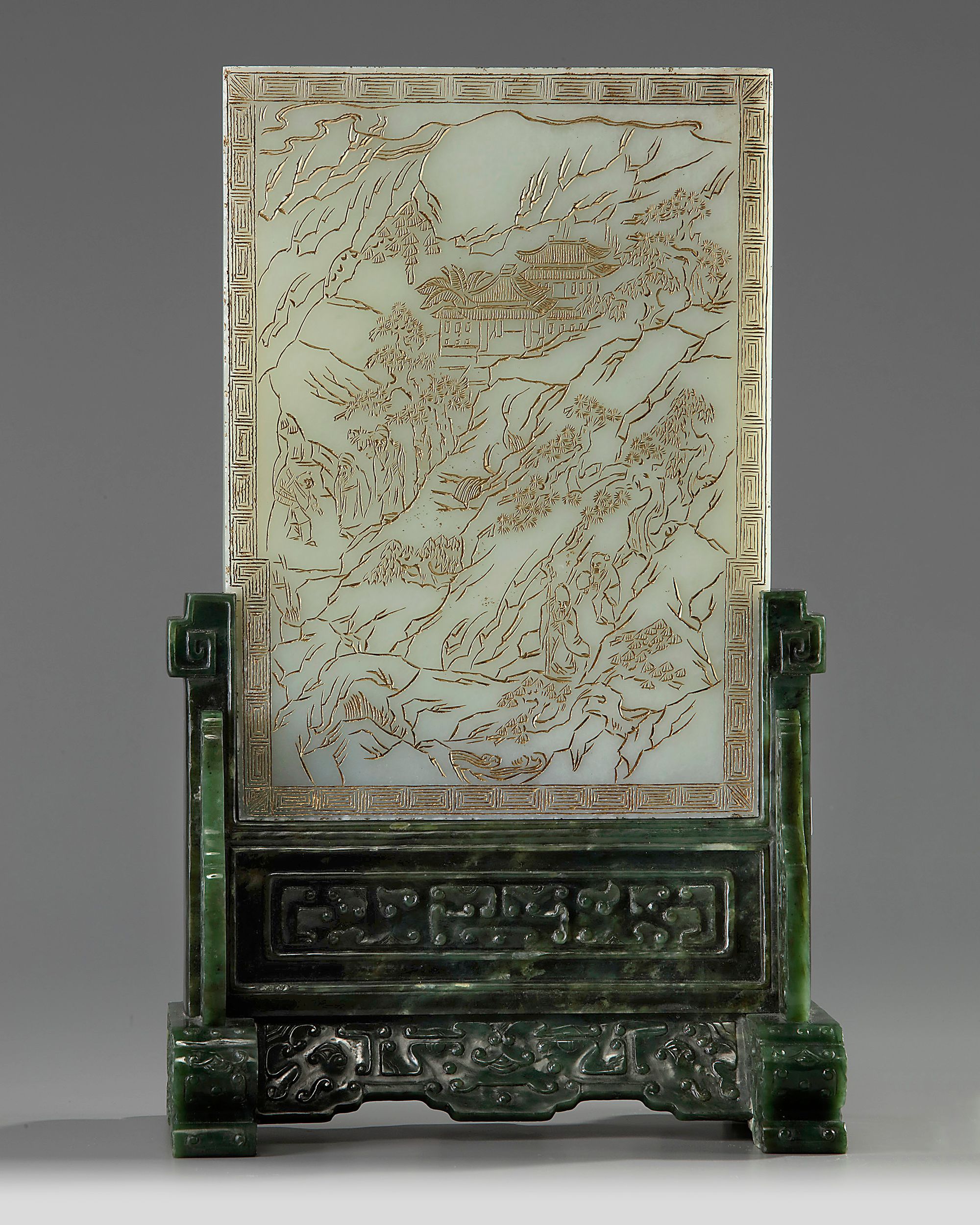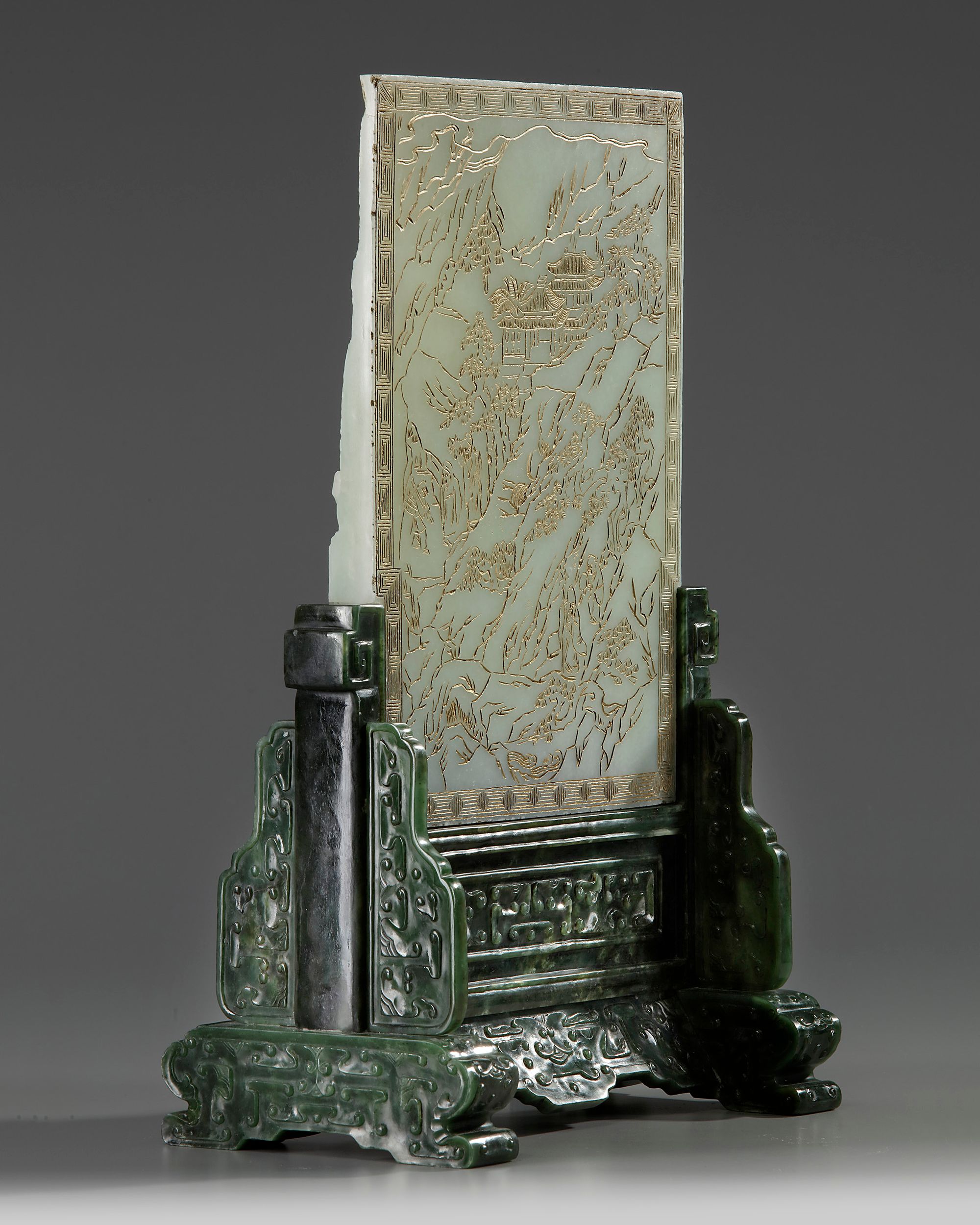 The table screen is carved to one side with a scene of a scholar and an attendant on a bridge with a further scholar by a pavilion, all amongst wisteria, plantain, and pine in a mountainous river landscape. The reverse is incised and decorated in gilt with a further scene of scholars. The stone is of a pale tone with an area of light grey inclusion to the lower section. The stand is carved with archaistic scrolls and it stands on shaped humped feet. The stone is of spinach tone with dark inclusions.