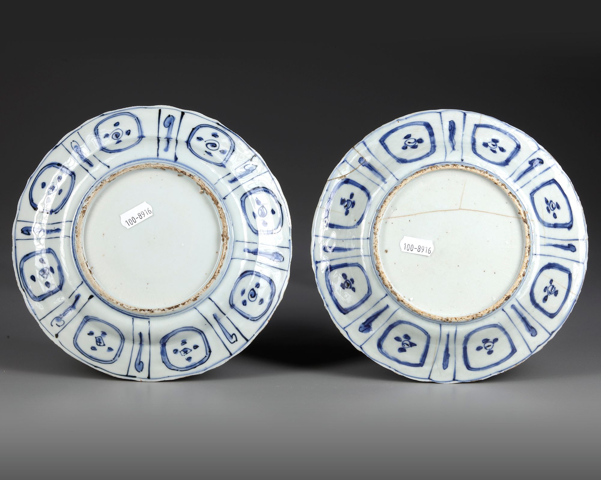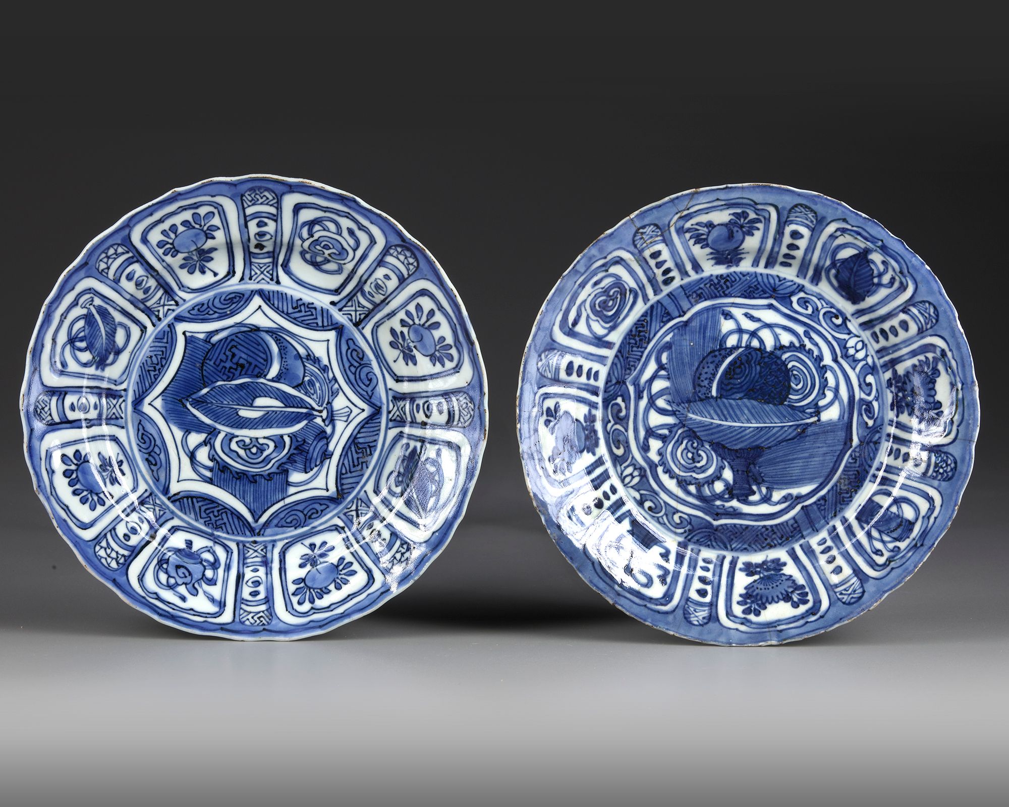Two Chinese porcelain dishes, each finely decorated to the centre with a star-shaped panel enclosing precious objects, all surrounded by further lappet-shaped panels enclosing alternating precious objects and peach blossoming branches separated by brocade designs. The reverse is decorated with roundels enclosing peaches with leaves.