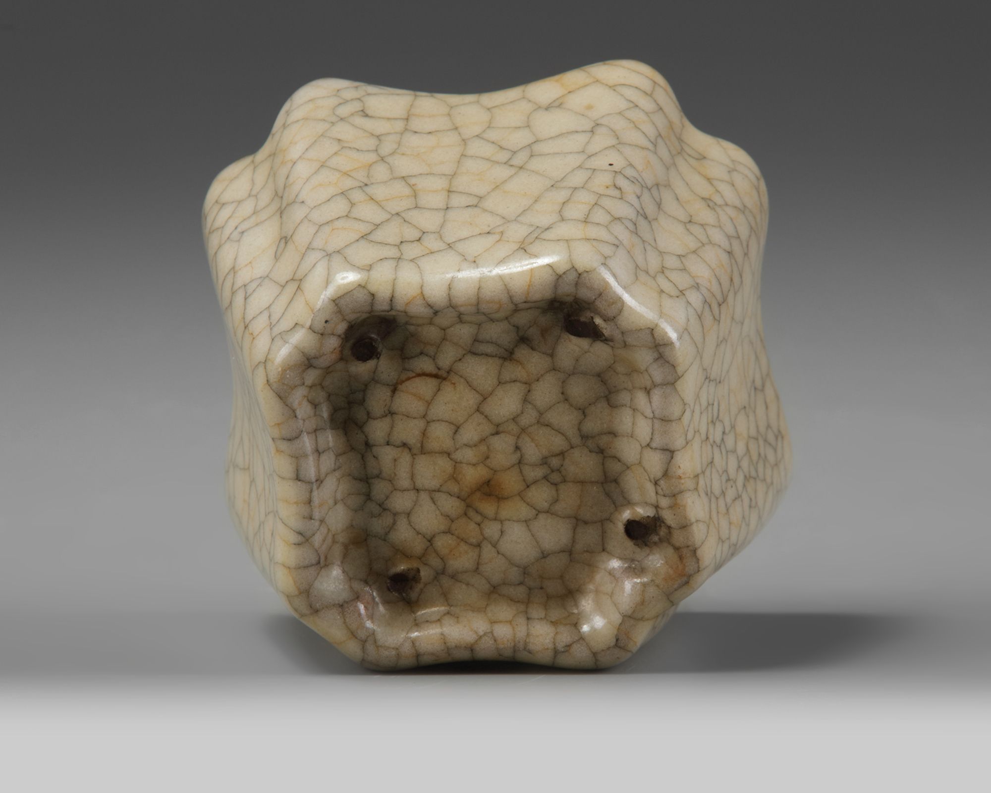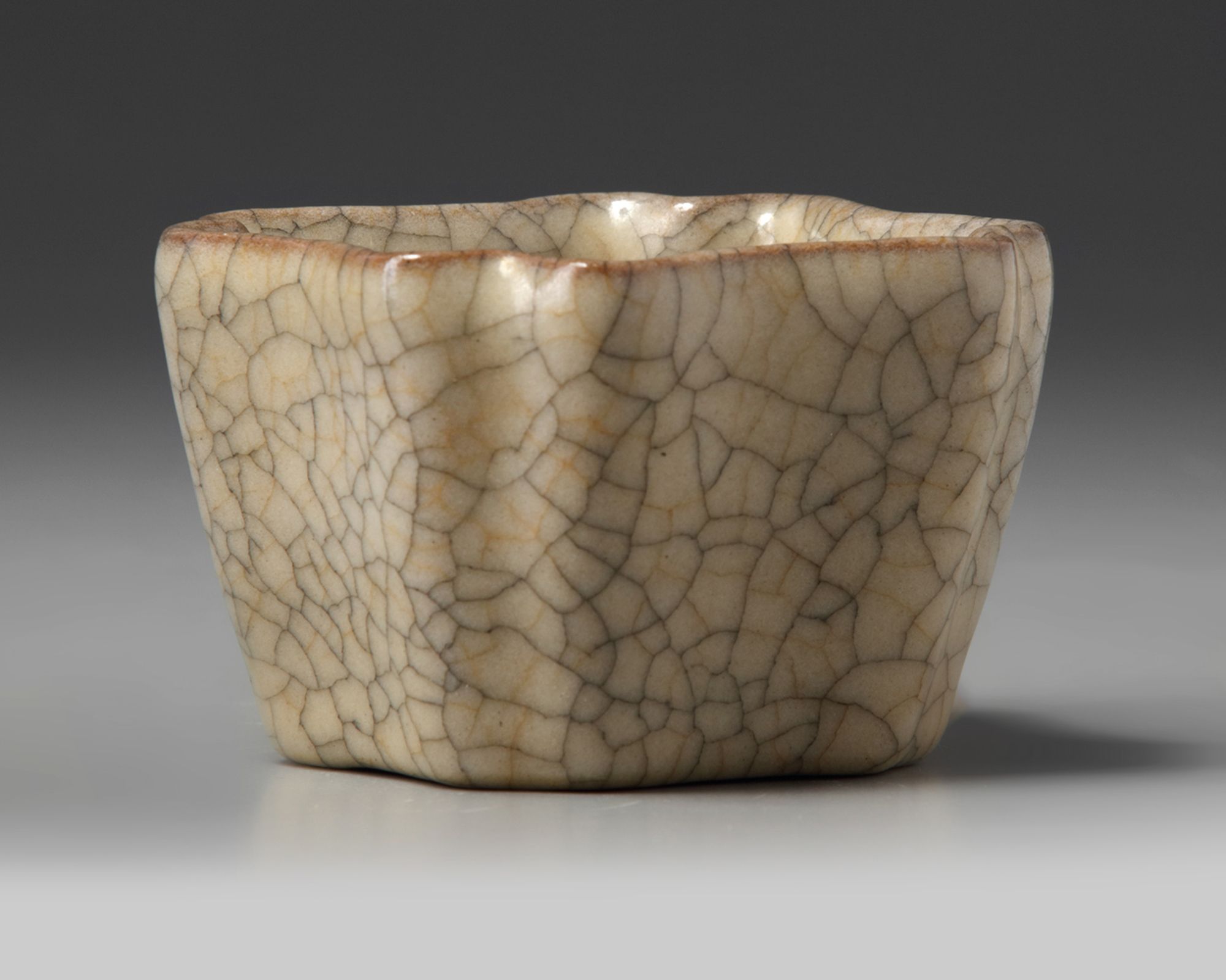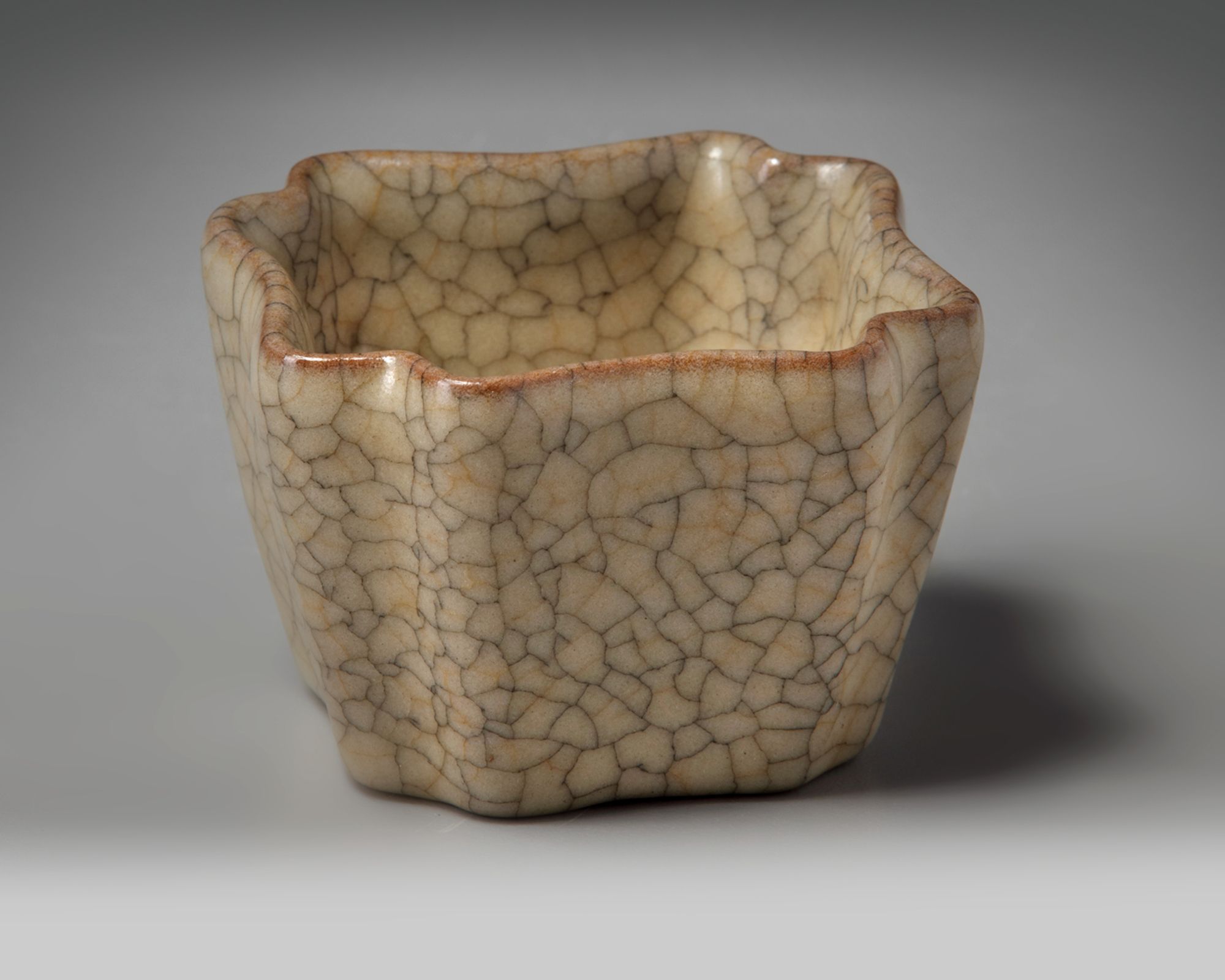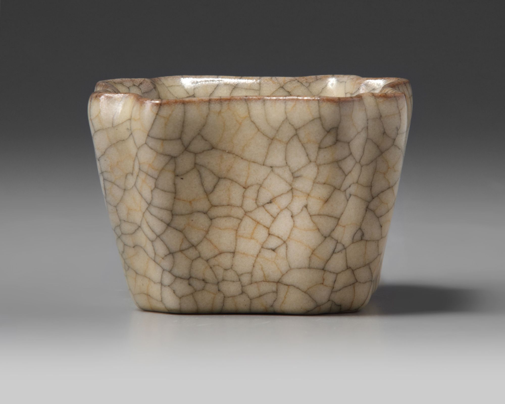 The square-section cup is modelled with canted corners and slightly flaring concave walls. It is covered overall with a beige glaze suffused with darker and golden crackles.