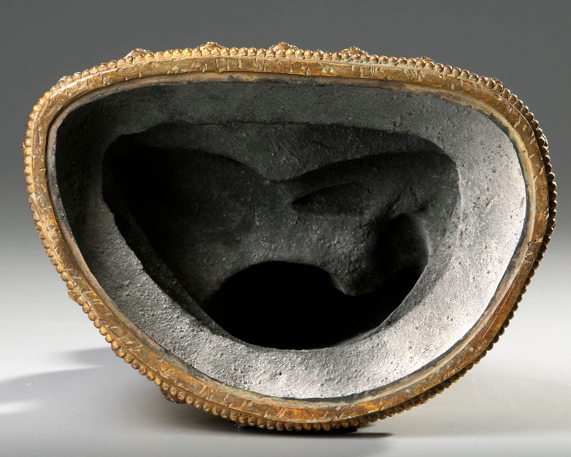 Cast seated in dhyanasana on a double lotus base, the right hand extended in bhumisparshamudra and the left in dhyanamudra, wearing a shawl draped over the left shoulder, the serene face with downcast eyes and meditative expression.