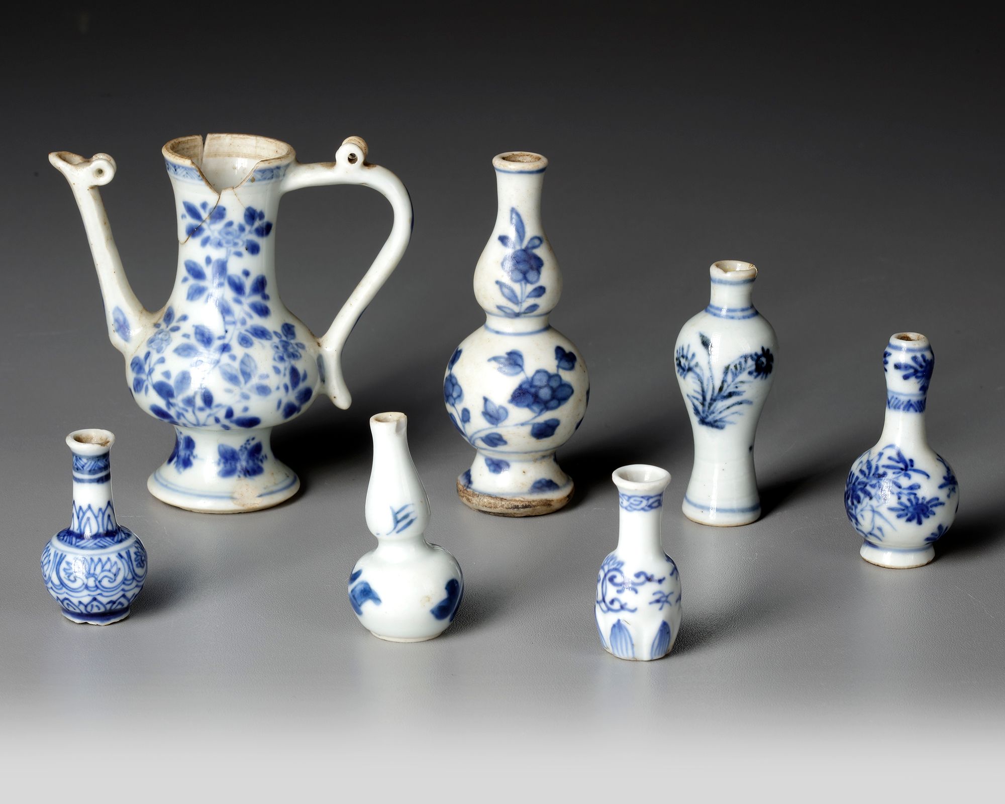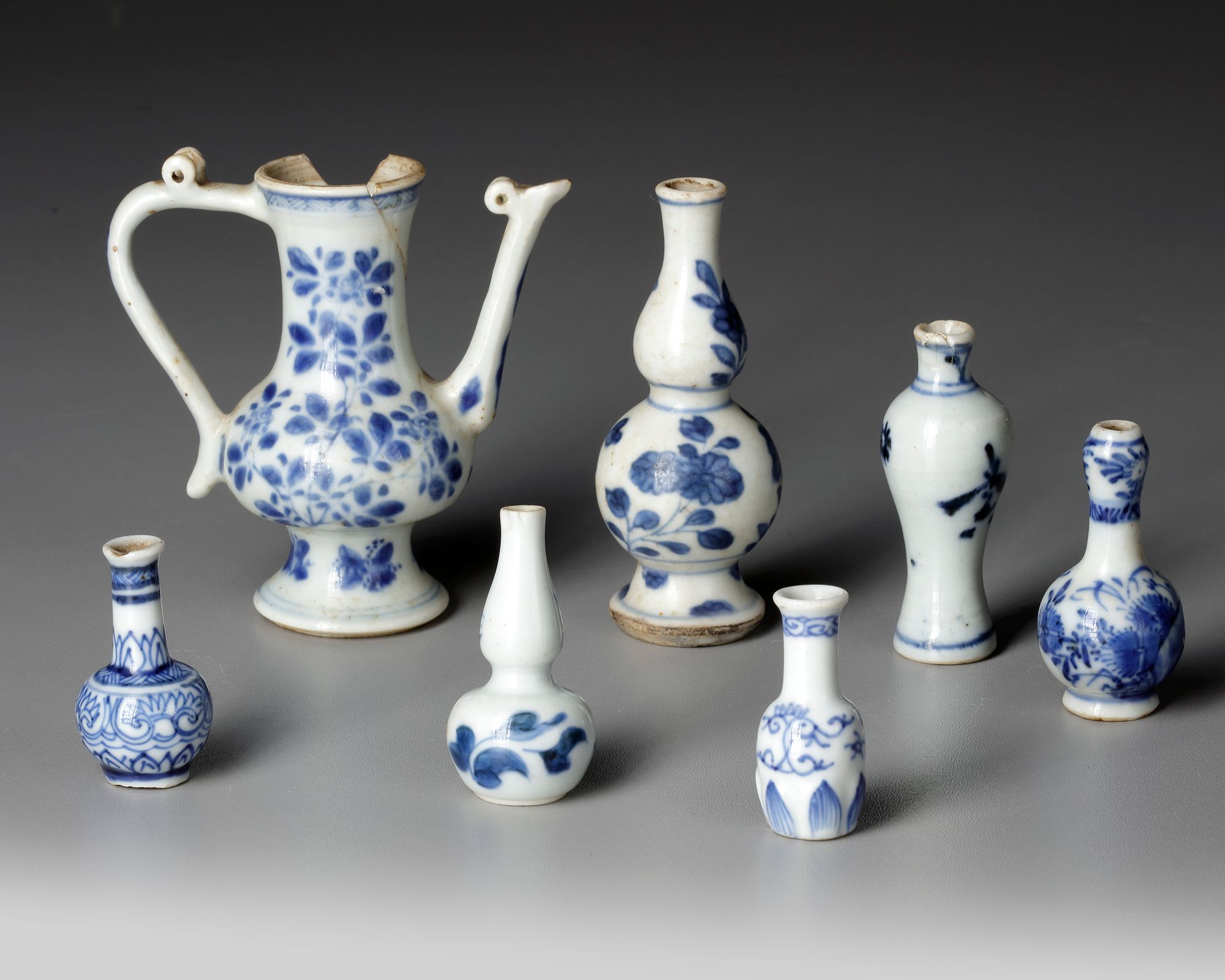 Six small Chinese blue and white vases decorated with floral motifs, Height: 4 cm