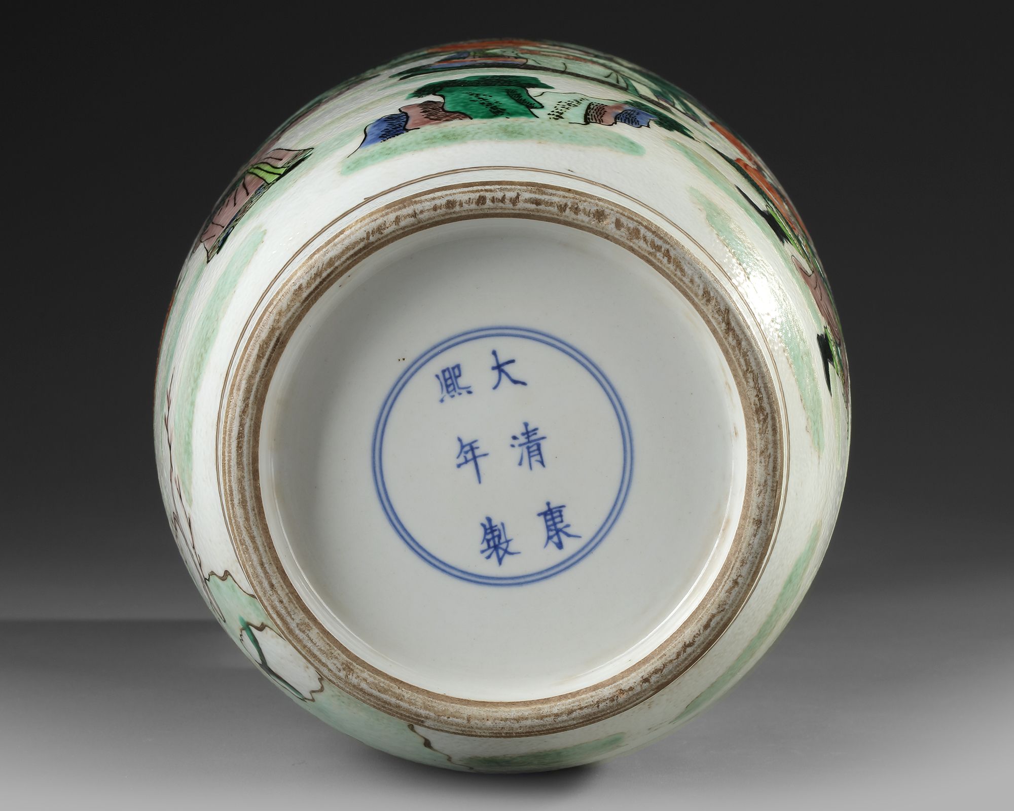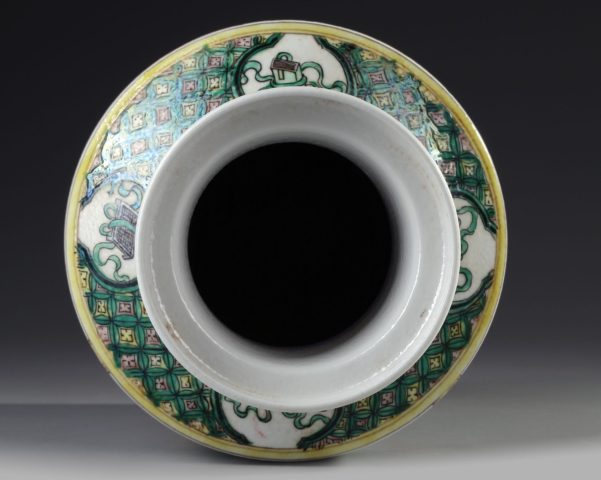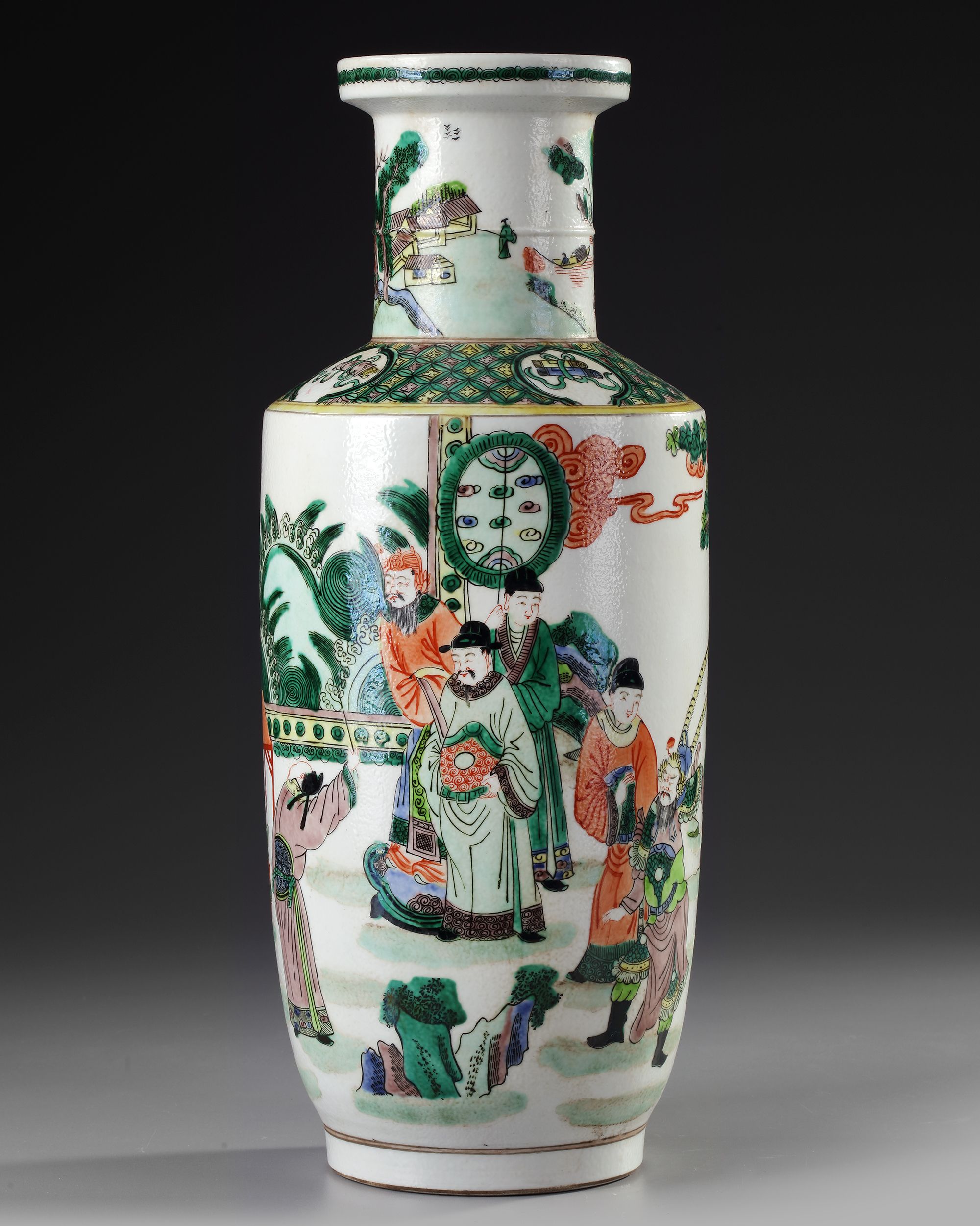 A Chinese porcelain rouleau vase decorated around the body with a dignitary entertained by attendants and assistants in a landscape, The shoulder is decorated with cartouches of precious objects on a geometric ground, and the neck with houses in a landscape. The bottom with a Chinese Kangxi six character mark.
