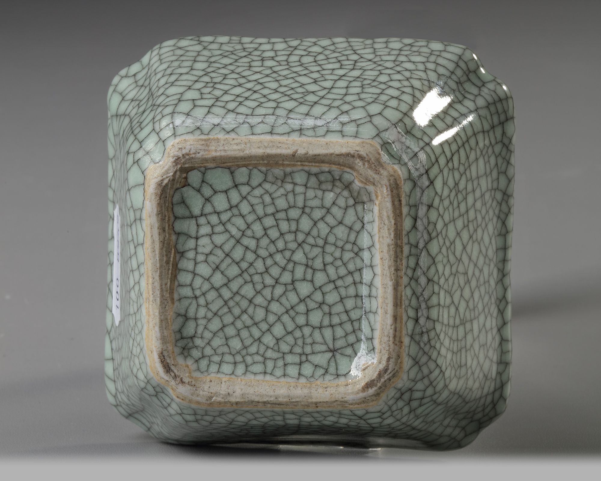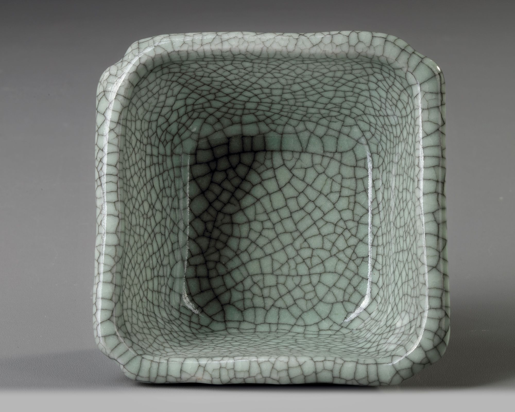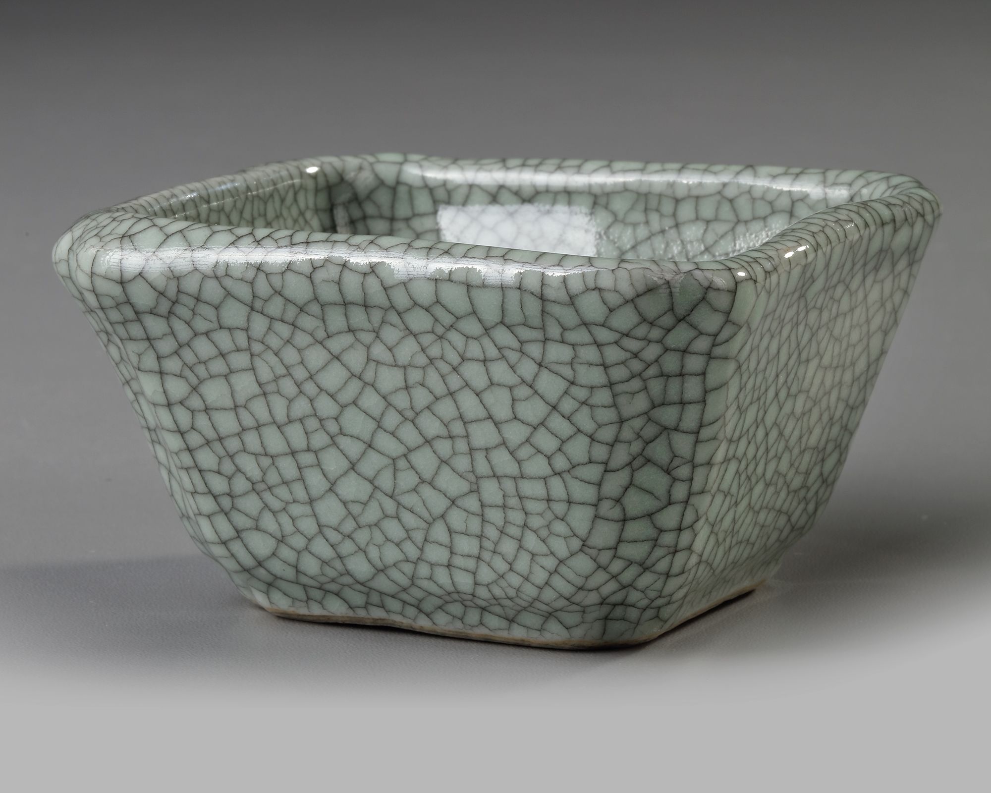 Potted in quatrelobed shape, the gently flaring sides elegantly rising from a countersunken base, covered overall including the base with an opaque glaze of soft greyish tone suffused with an intricate matrix of iron-wire crackle.