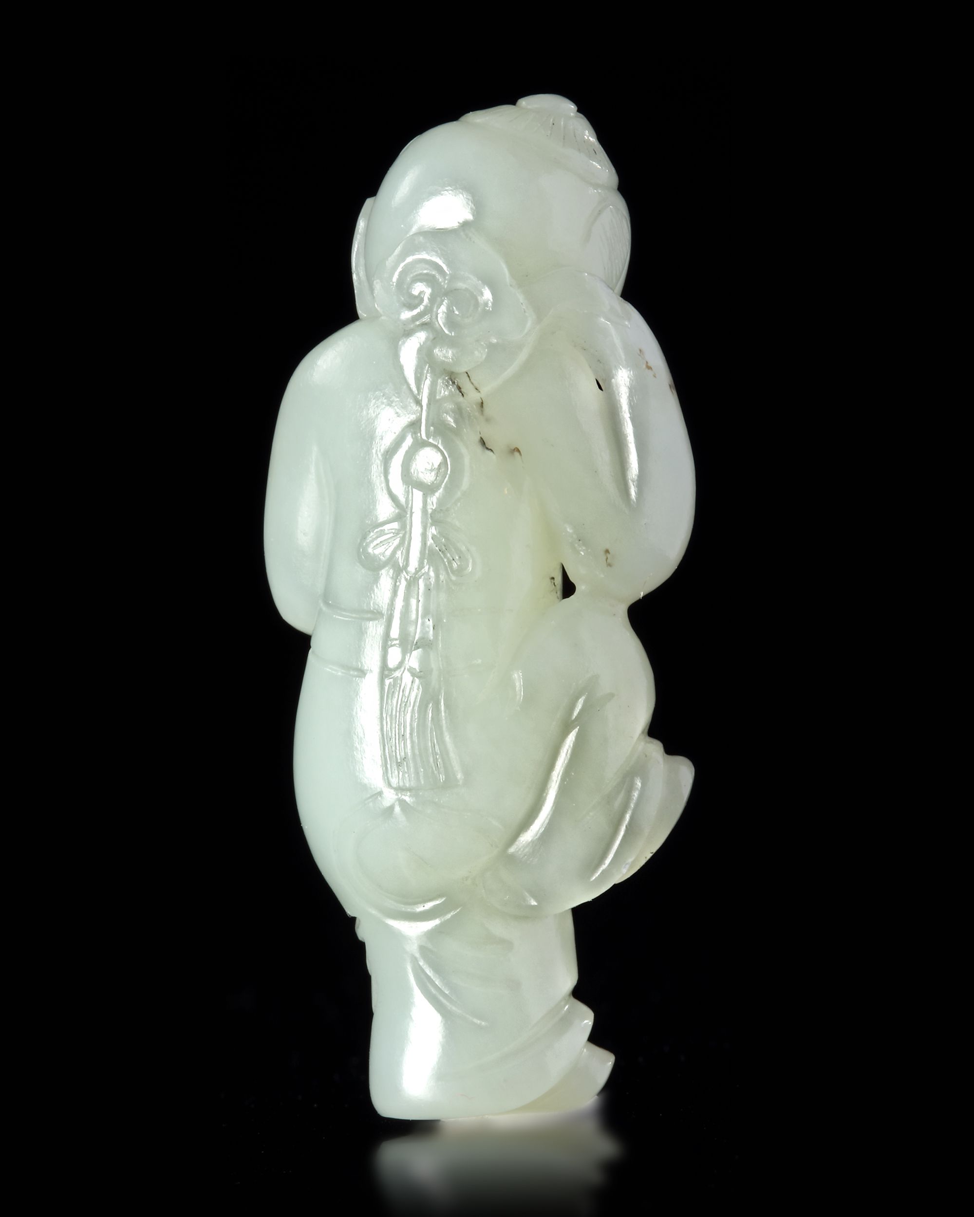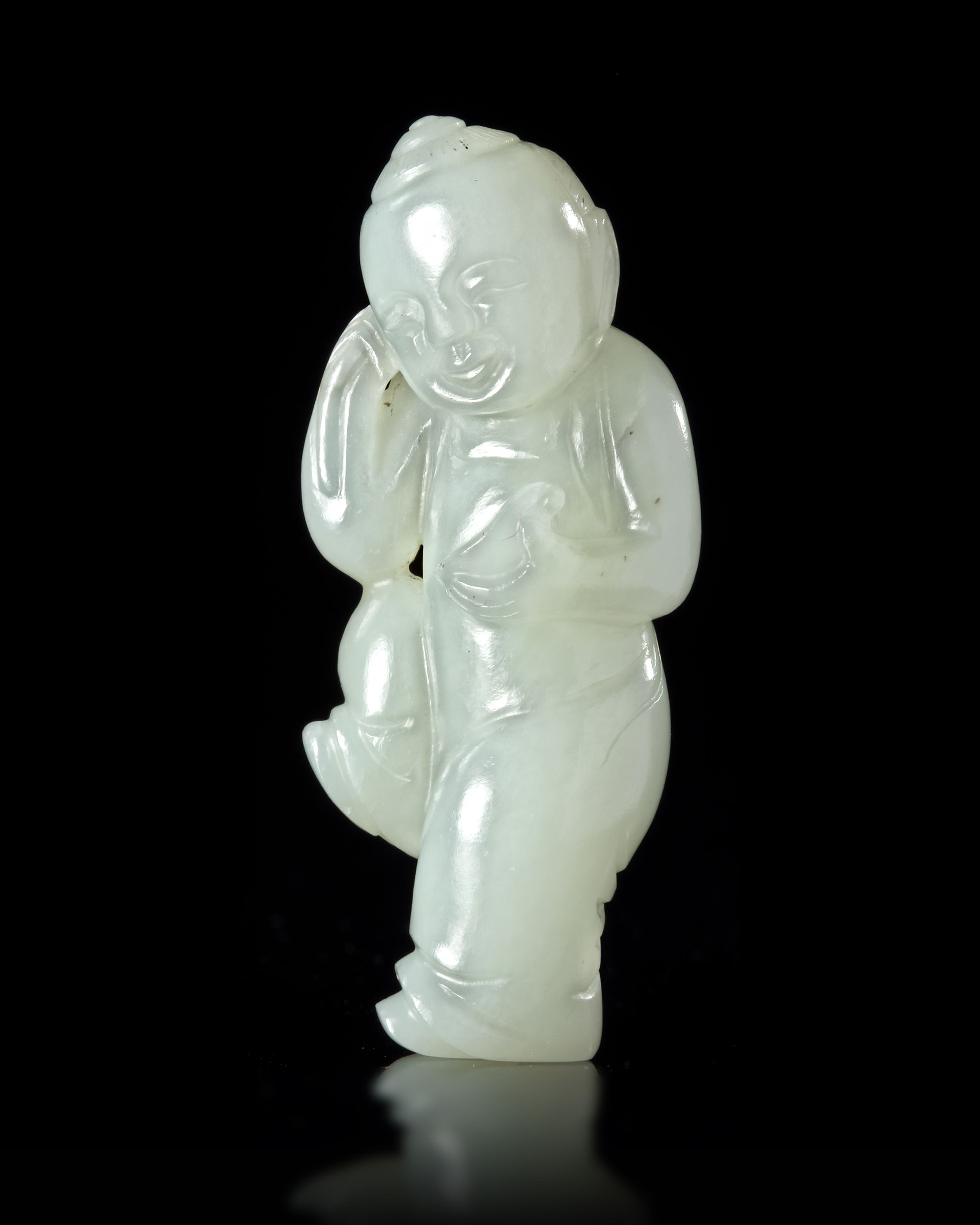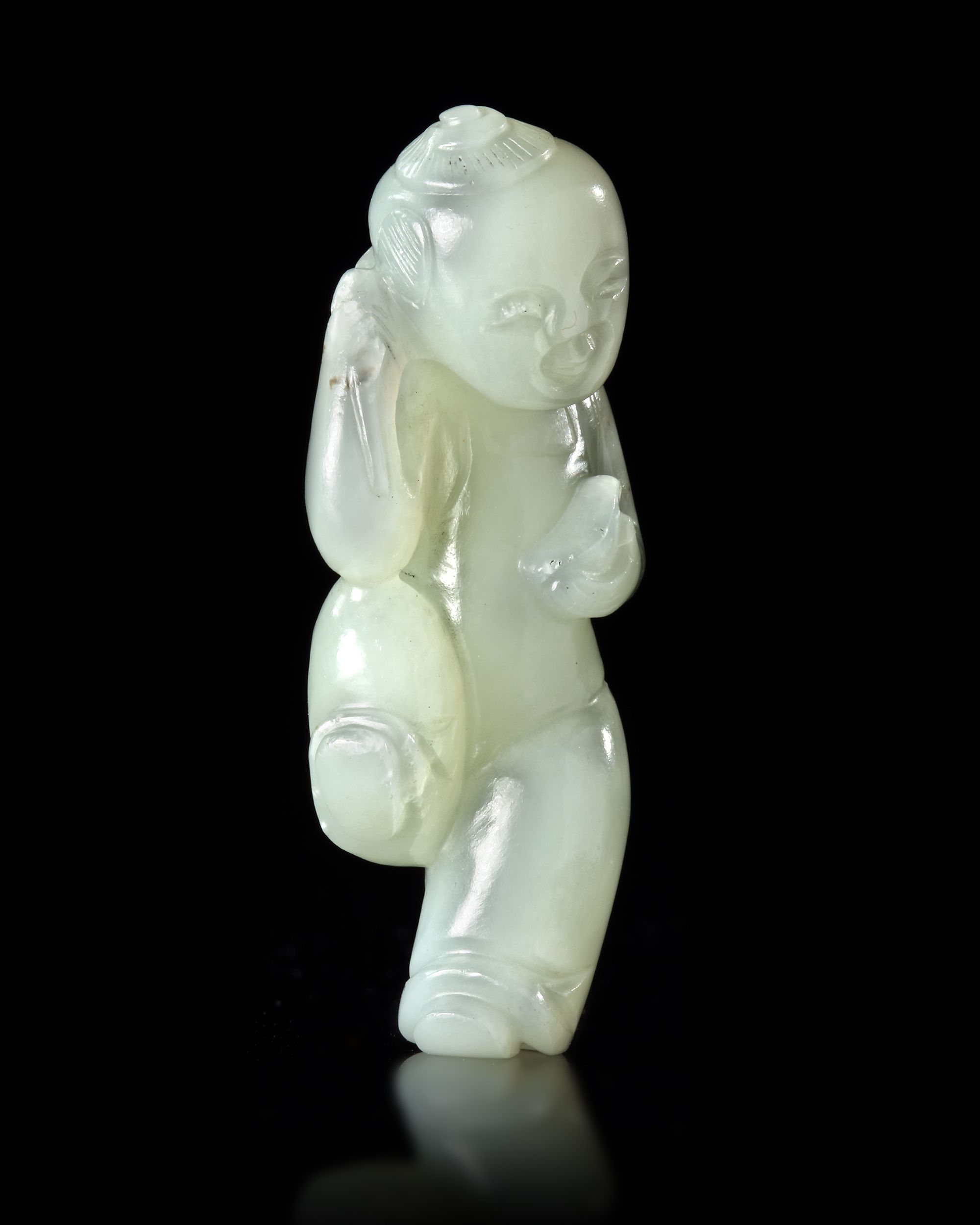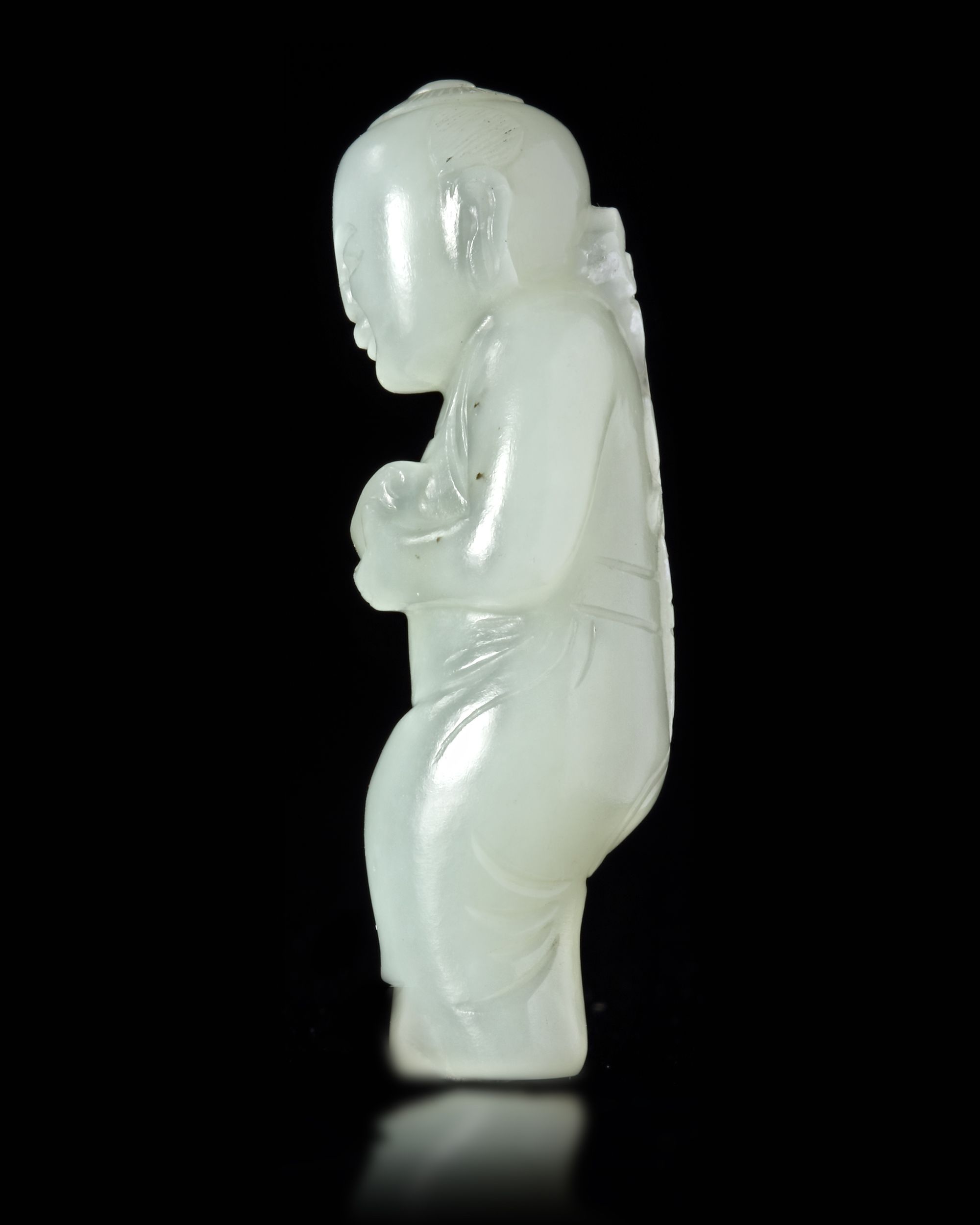 A Chinese greyish-white jade figure, depicting a young child holding a ruyi sceptre branch, the stone of even colour. 5.3 by 2.4 cm.