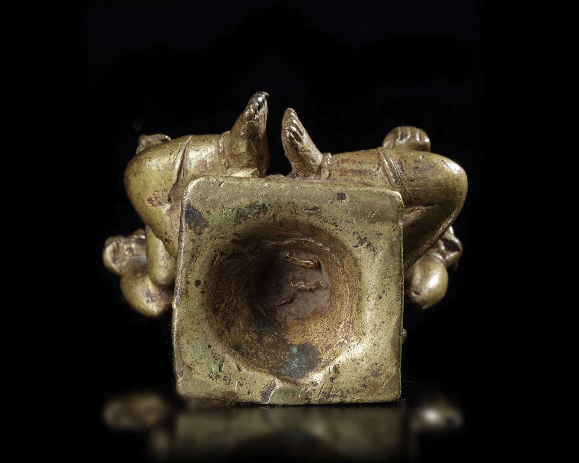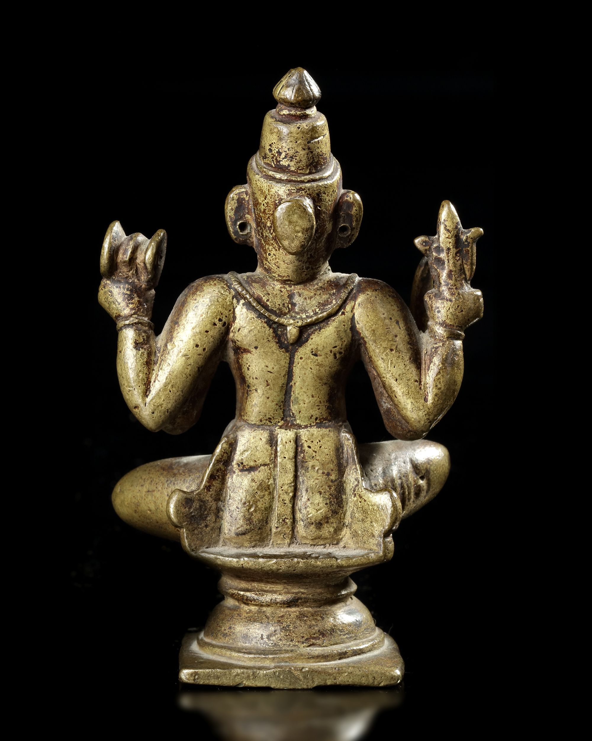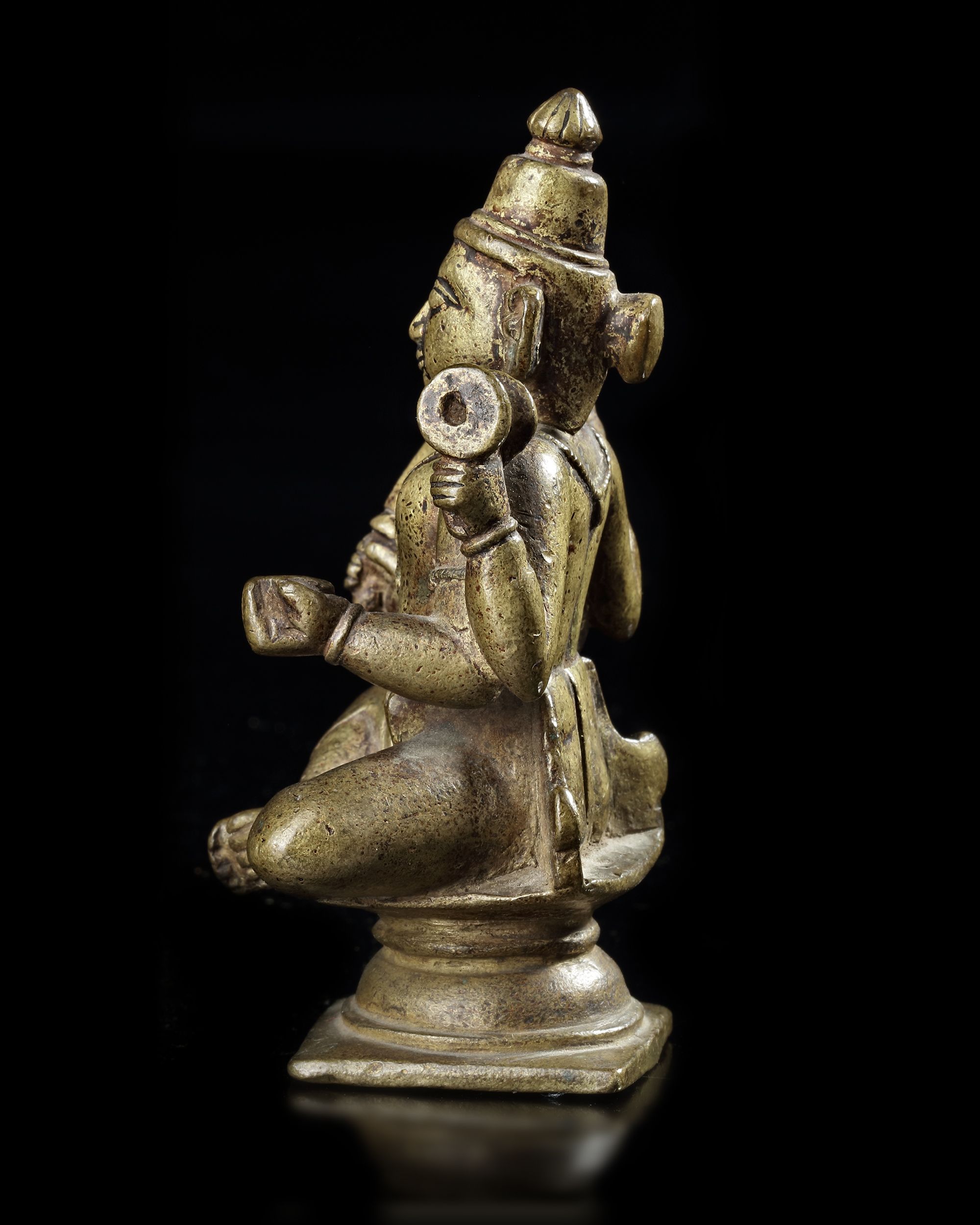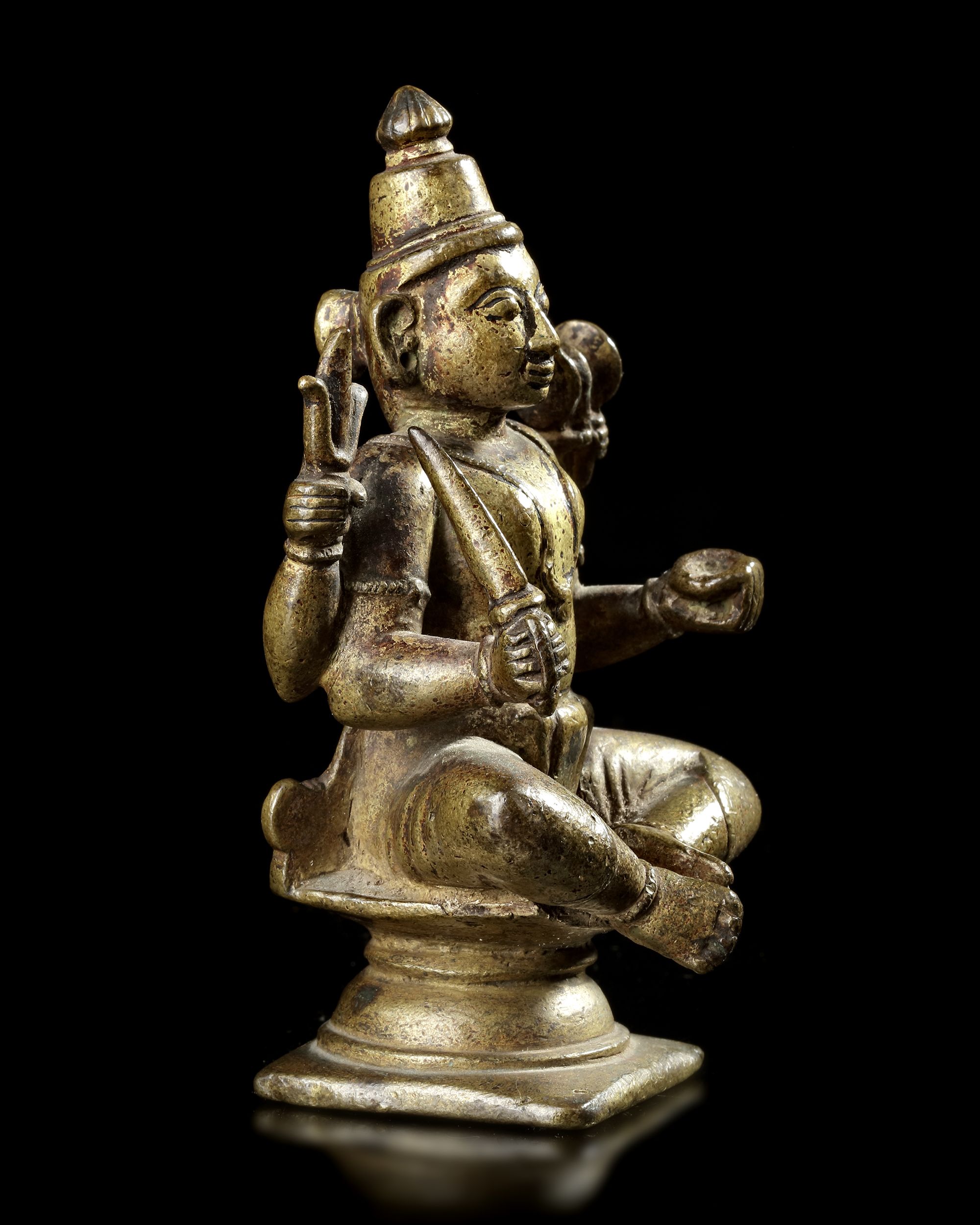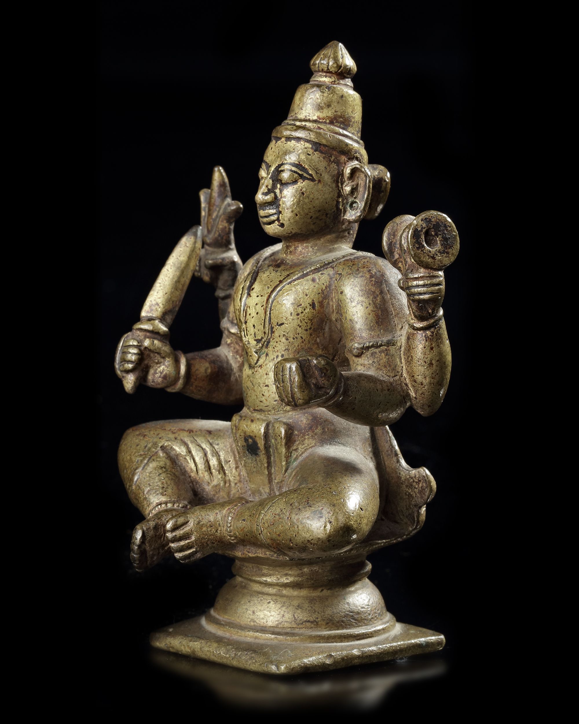 The four-armed figure cast seated on a stand and holding items in his hands. Height: 11 cm. Width: 7 cm.