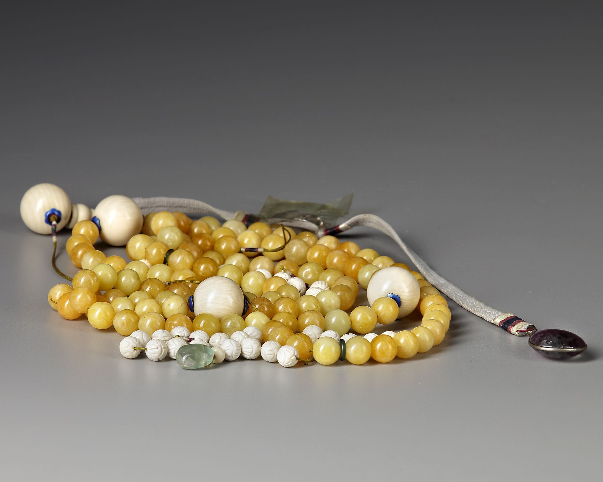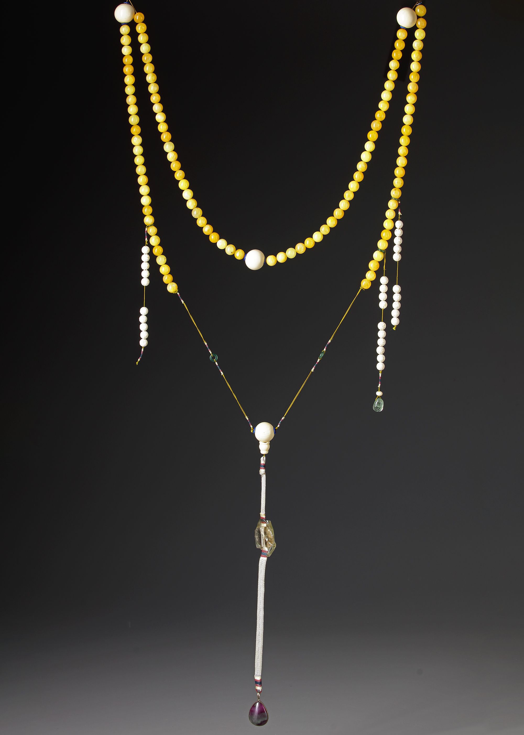 A Chinese peking glass necklace. During the Qing dynasty, high-ranking civil and military officials wore necklaces of beads, which were standard uniform regalia. The beads were made of semiprecious stones and strung with silk ribbons. The rarity of the material and colors of the ribbons signified the ranks of the officials.